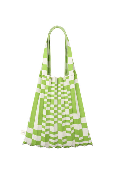 PLEATSMAMA sustainable grid pattern shoulder bag featuring a captivating geometric grid pattern. It boasts ample storage capacity and can be easily folded along the pleats for storage when not in use. all bags are made from recycled plastic bottles using innovative design.