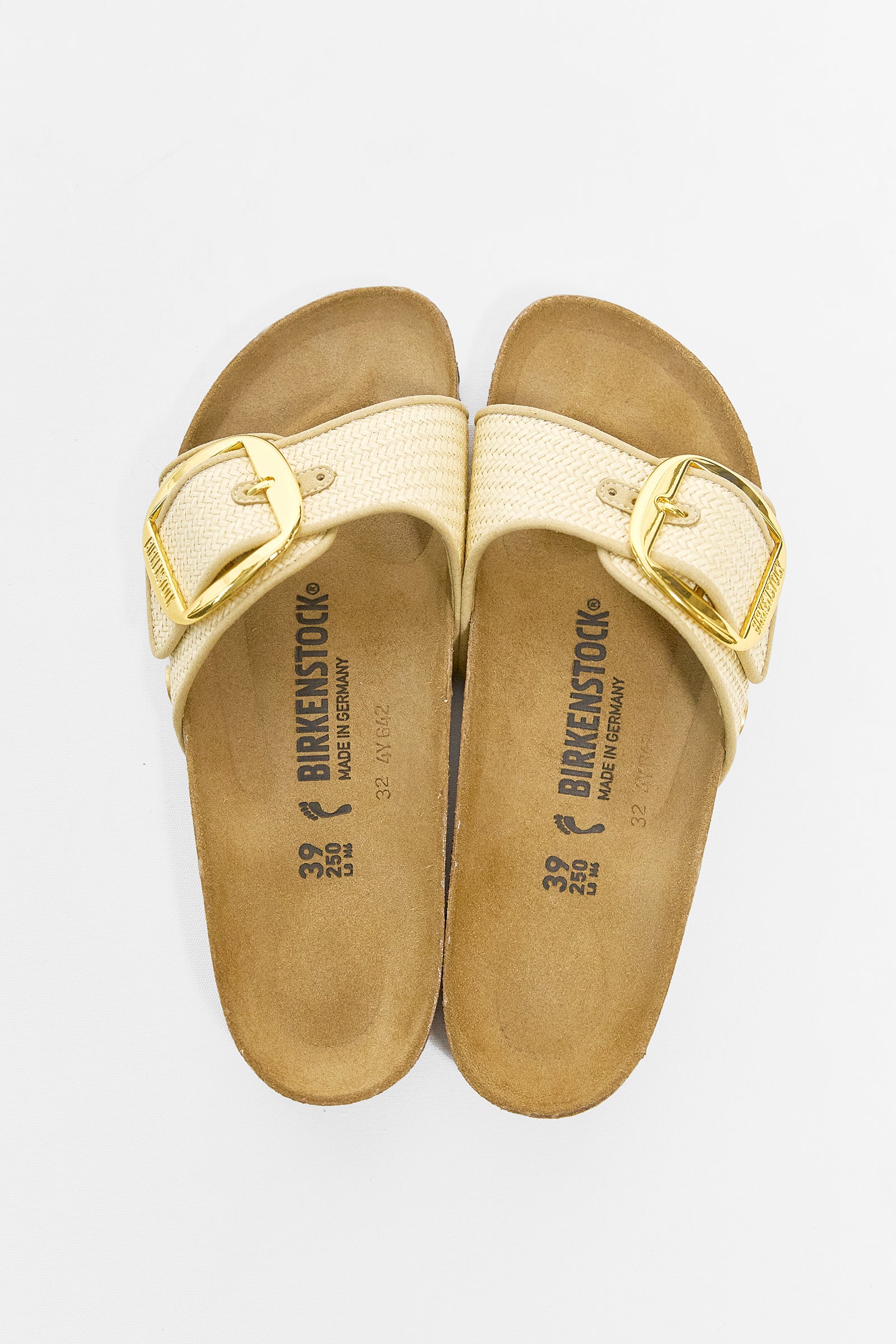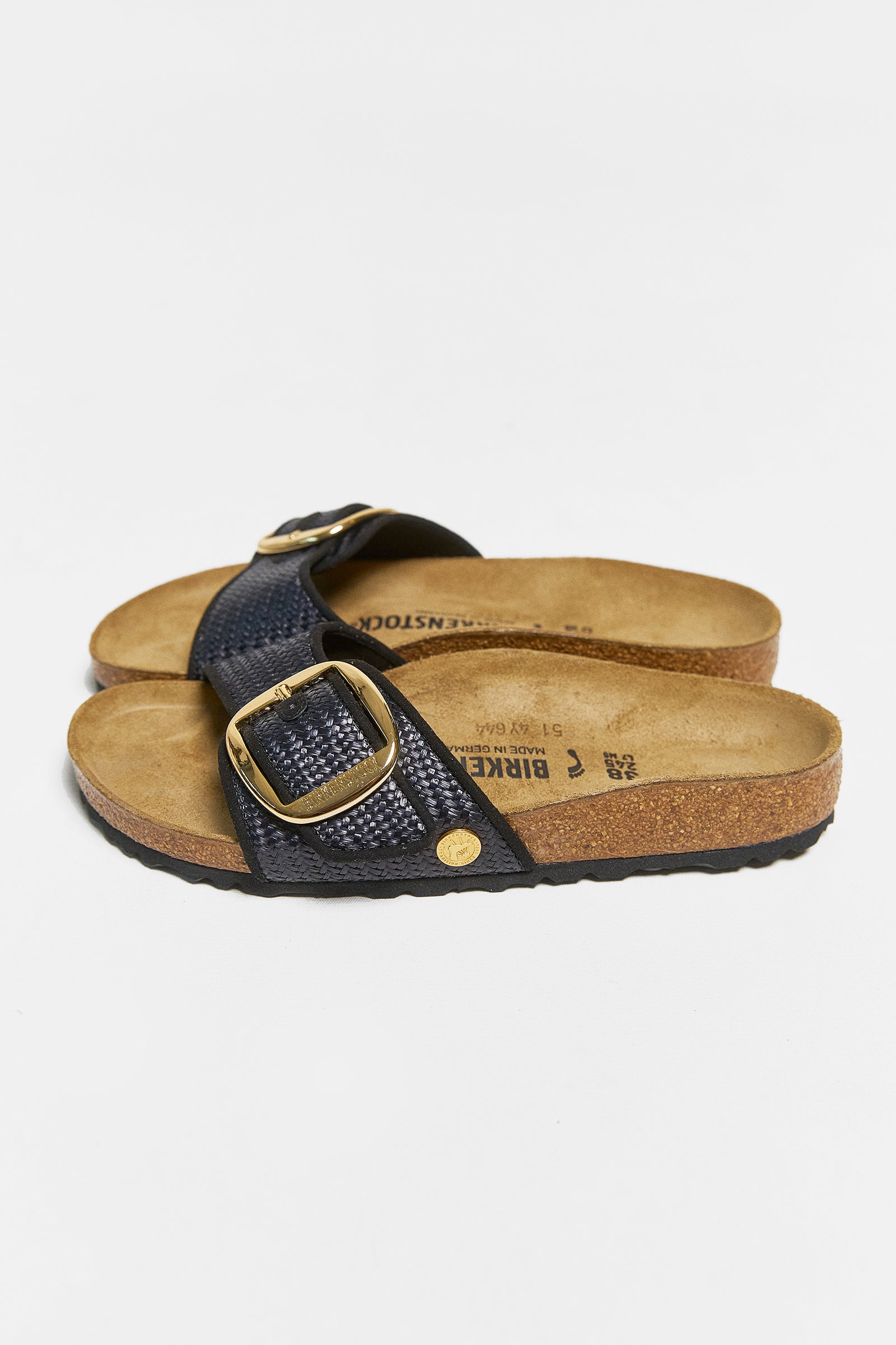 Madrid is the oldest member of the Birkenstock model, originally sold a 'fitness sandal' these simple single strap sandals are a firm favourite. These madrids' feature an oversized buckle wrapped around a thick raffia strap.