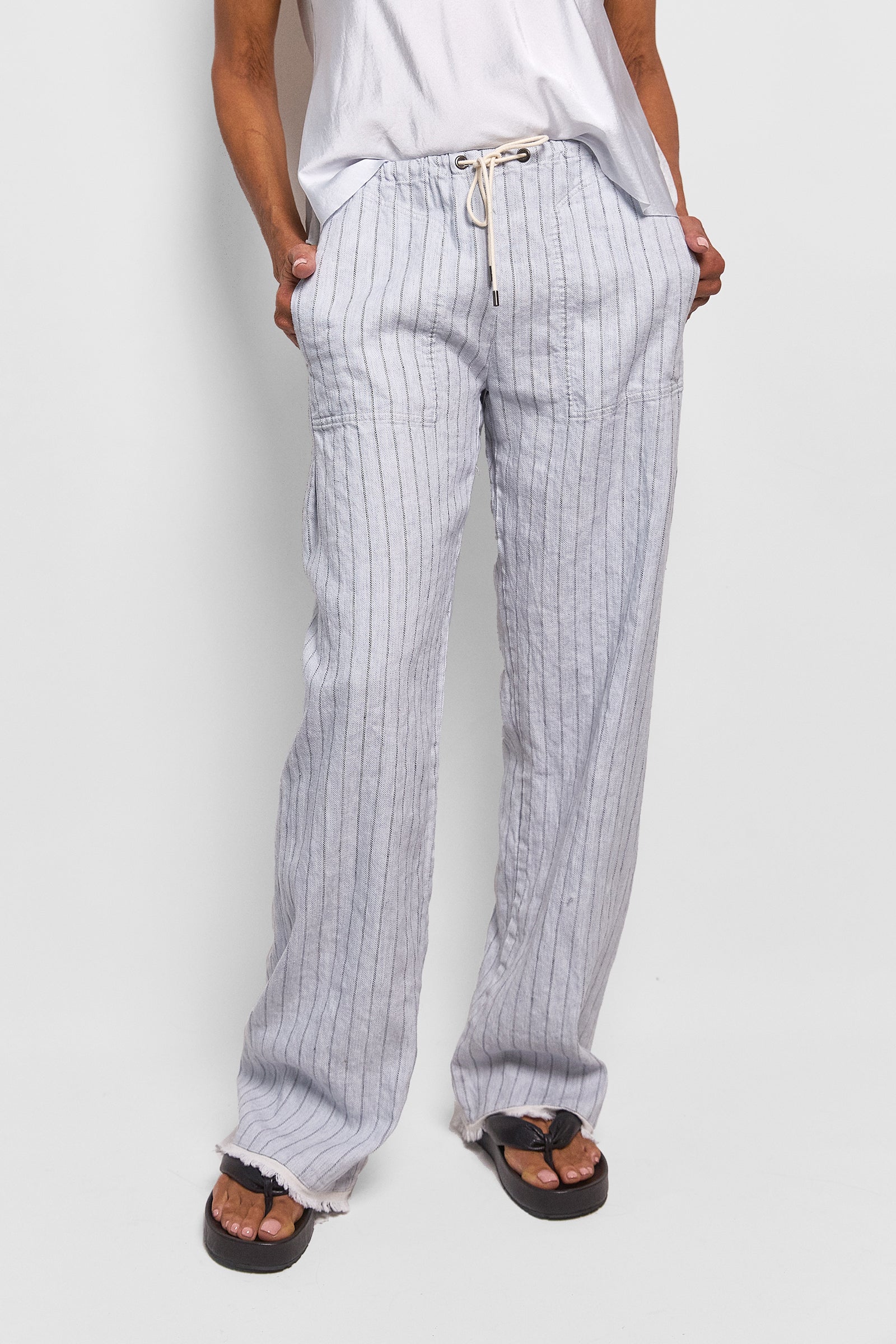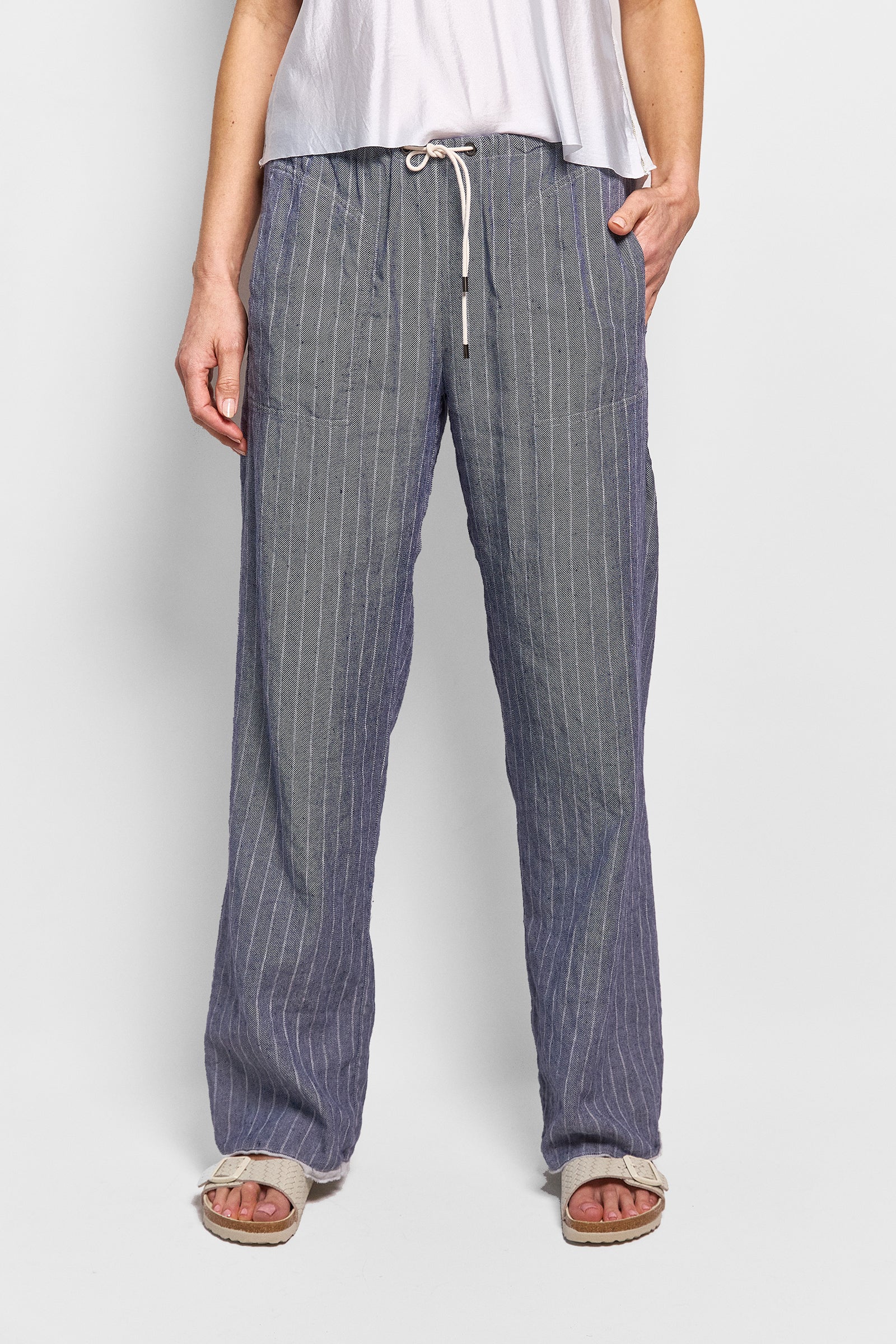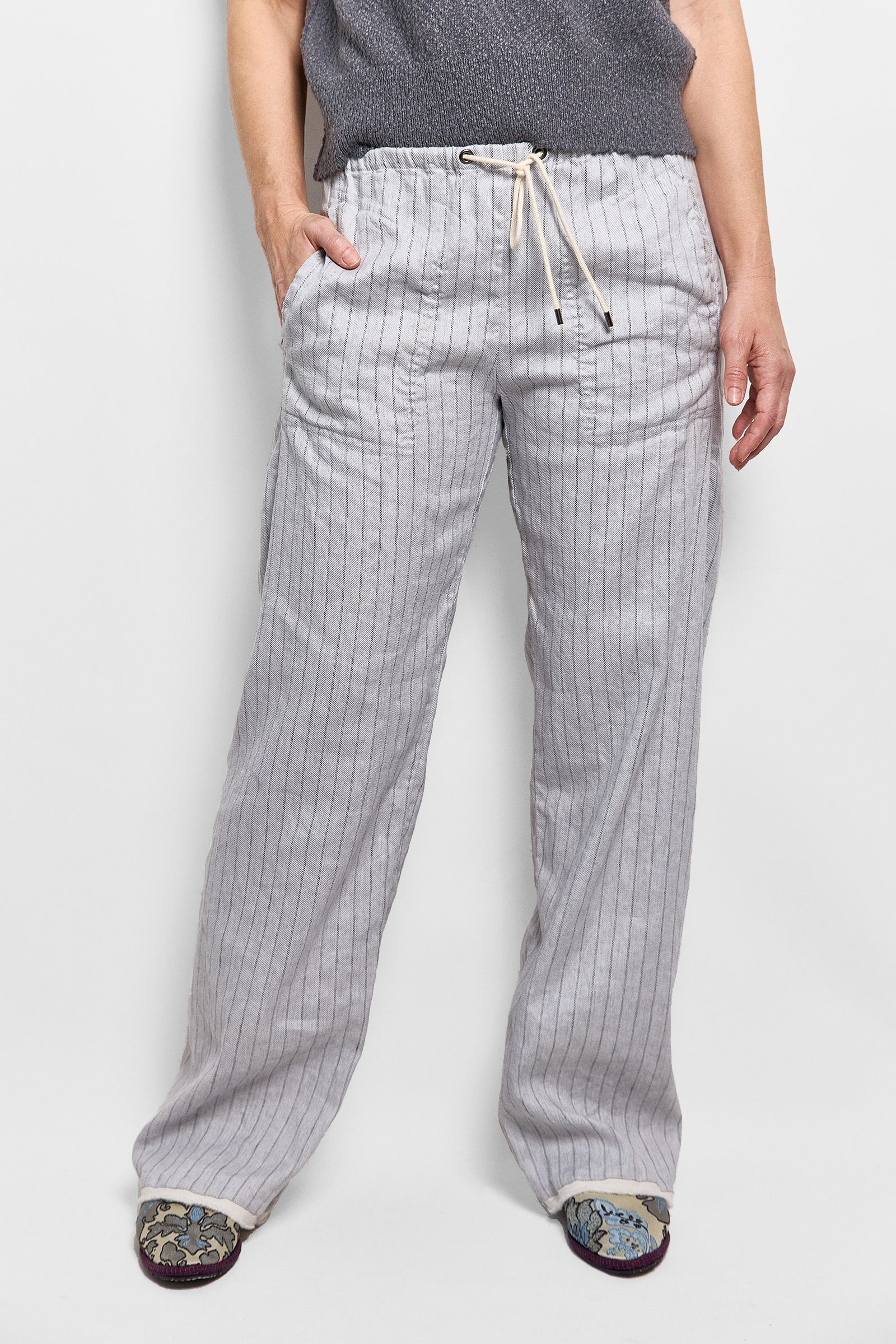 these unisex pants have a relaxed fit and are cut from 100% linen. they have a drawstring waist, side pockets and are engineered without a side seam draping beautifully. after being made, the pants are washed to give them a soft finish and feature our signature selvedge hem. relaxed and oversized fit with an adjustable tie waist.