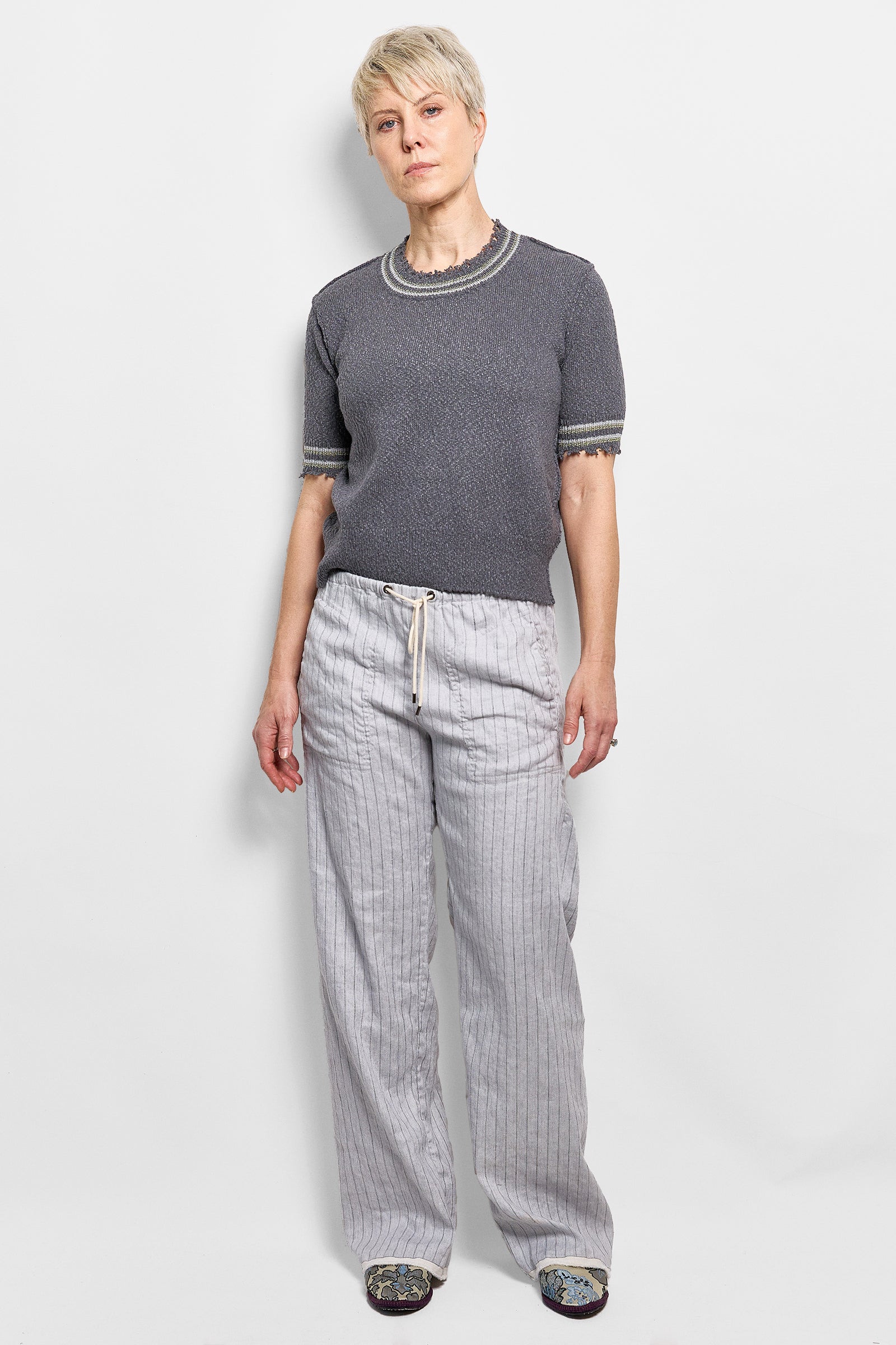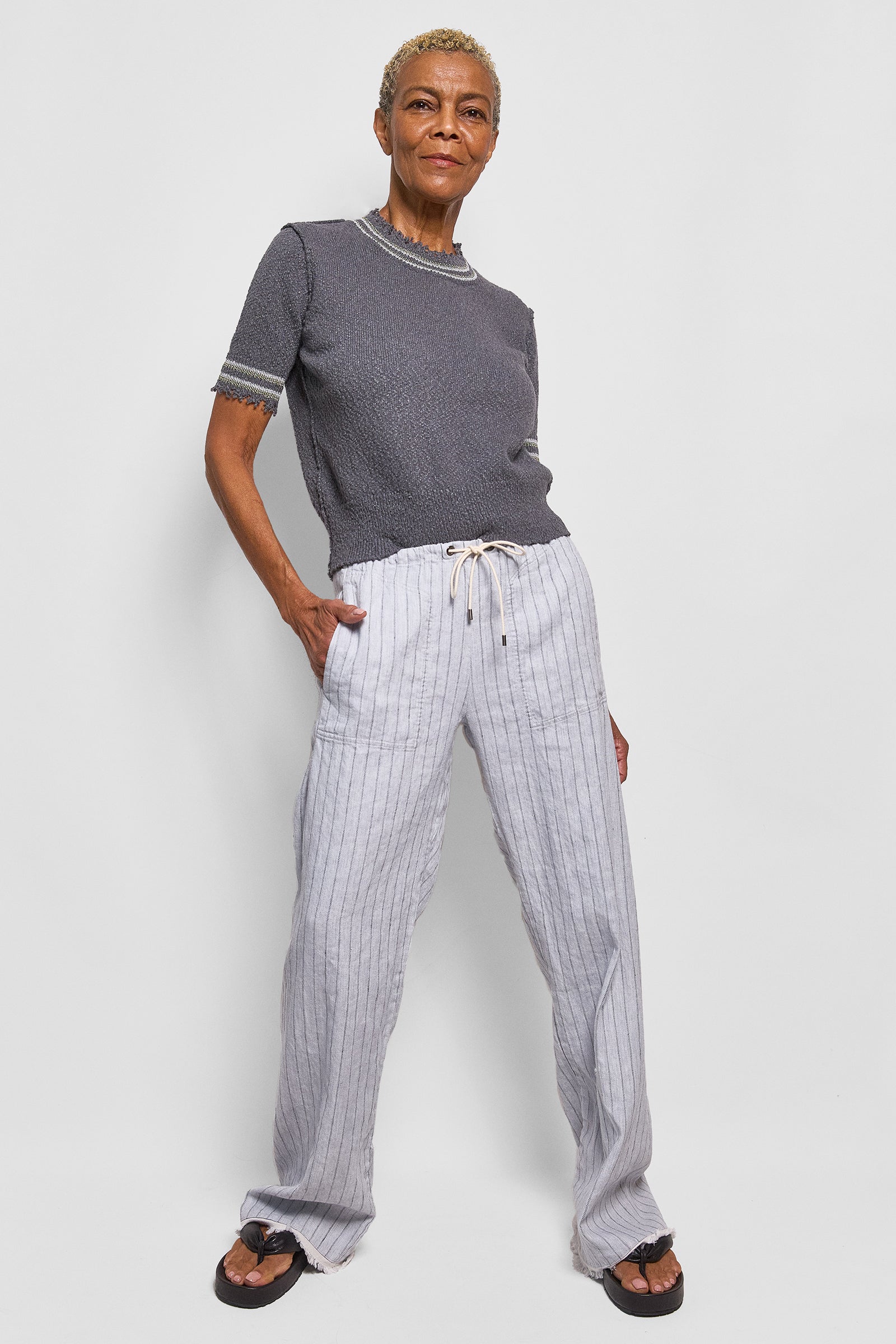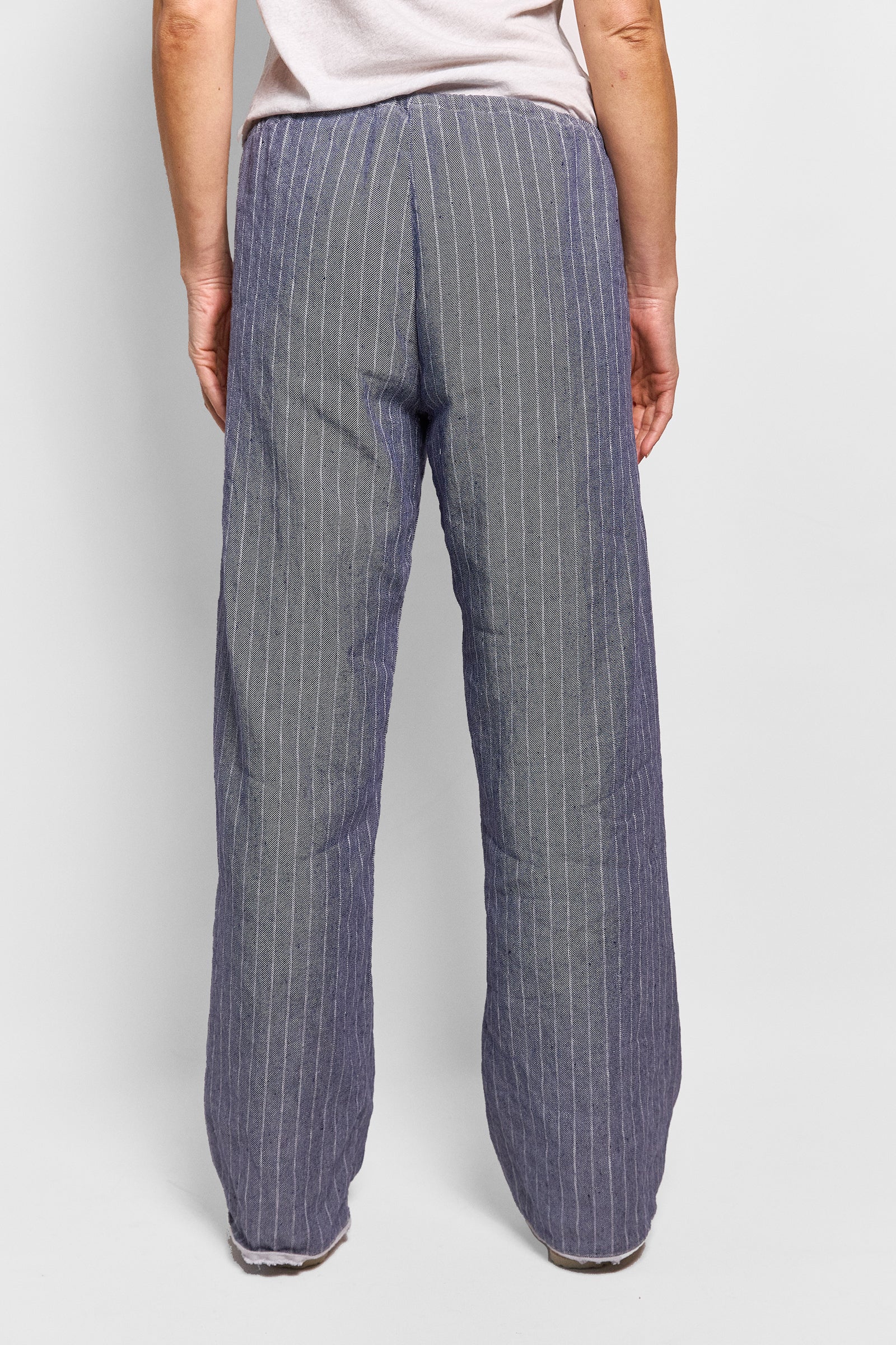 these unisex pants have a relaxed fit and are cut from 100% linen. they have a drawstring waist, side pockets and are engineered without a side seam draping beautifully. after being made, the pants are washed to give them a soft finish and feature our signature selvedge hem. relaxed and oversized fit with an adjustable tie waist.