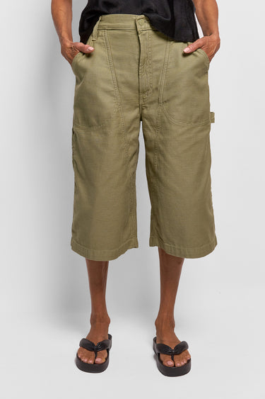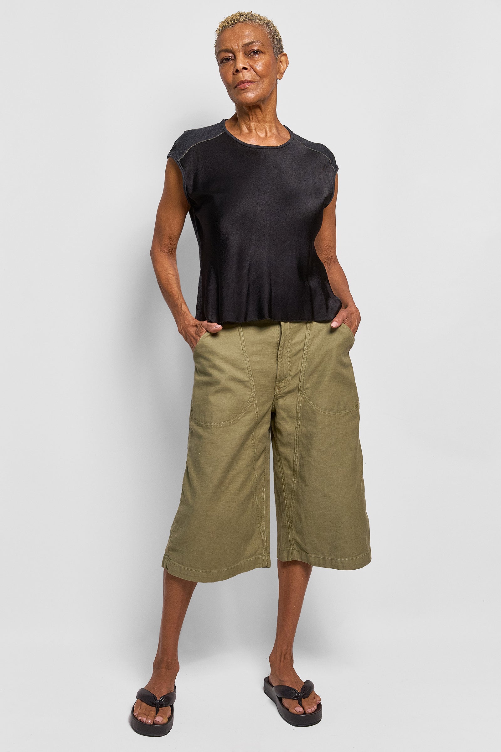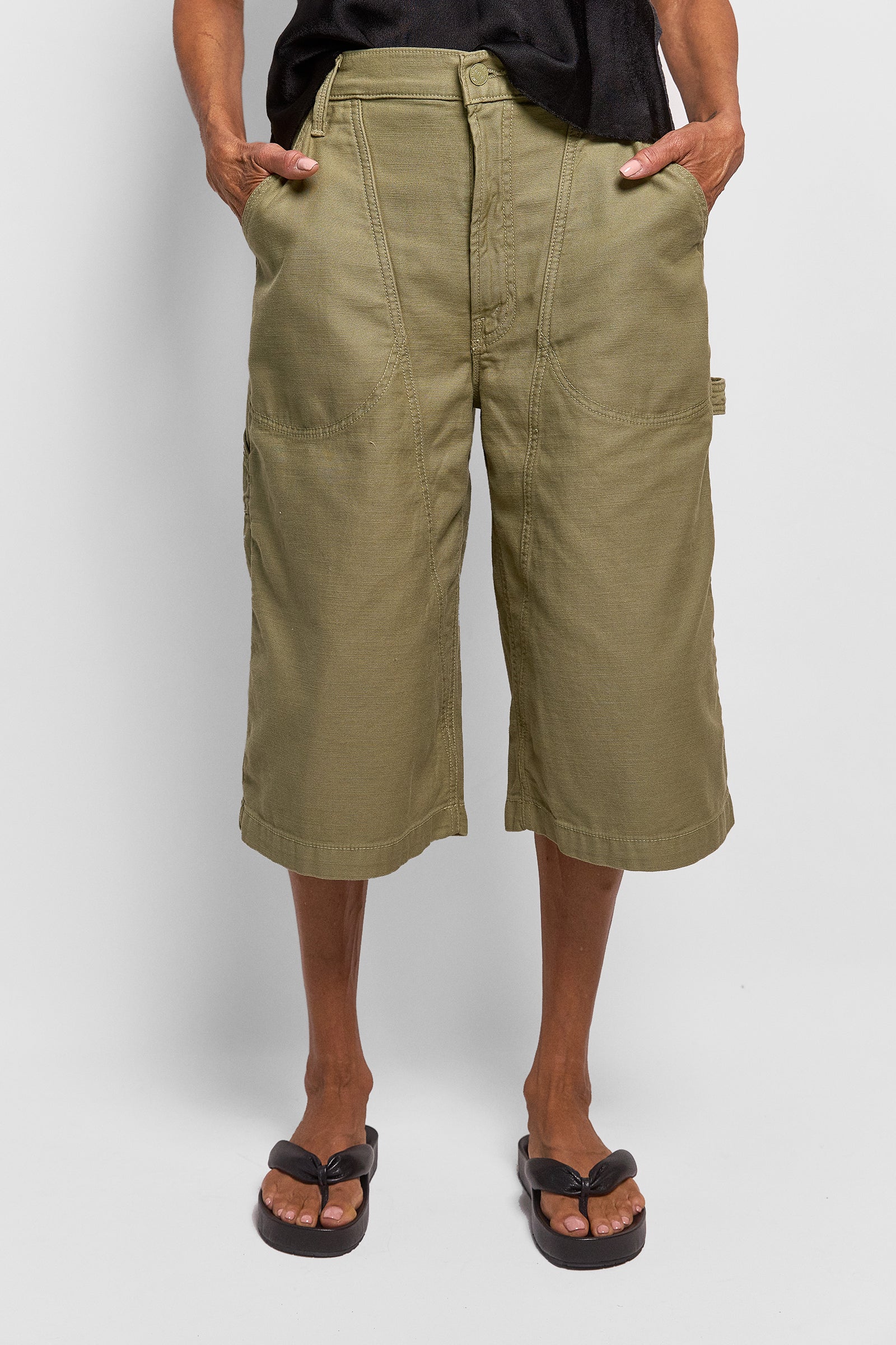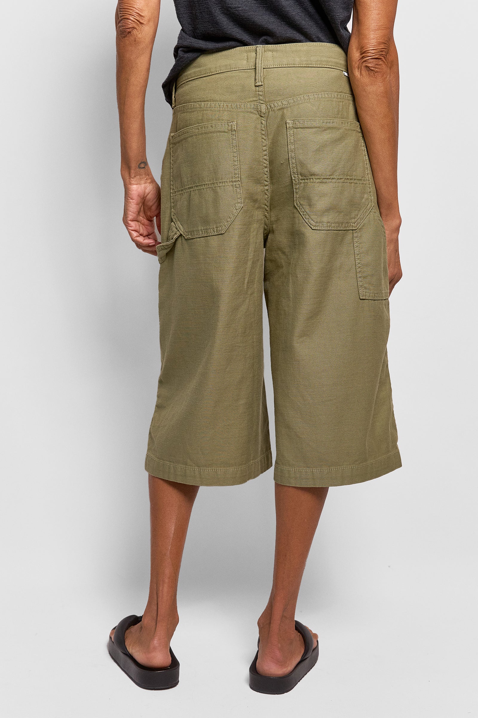 Super high-waisted capris with a wide leg and utility-inspired patch pockets. Made from rigid 100% cotton, these shorts are a faded army green featuring tonal hardware.