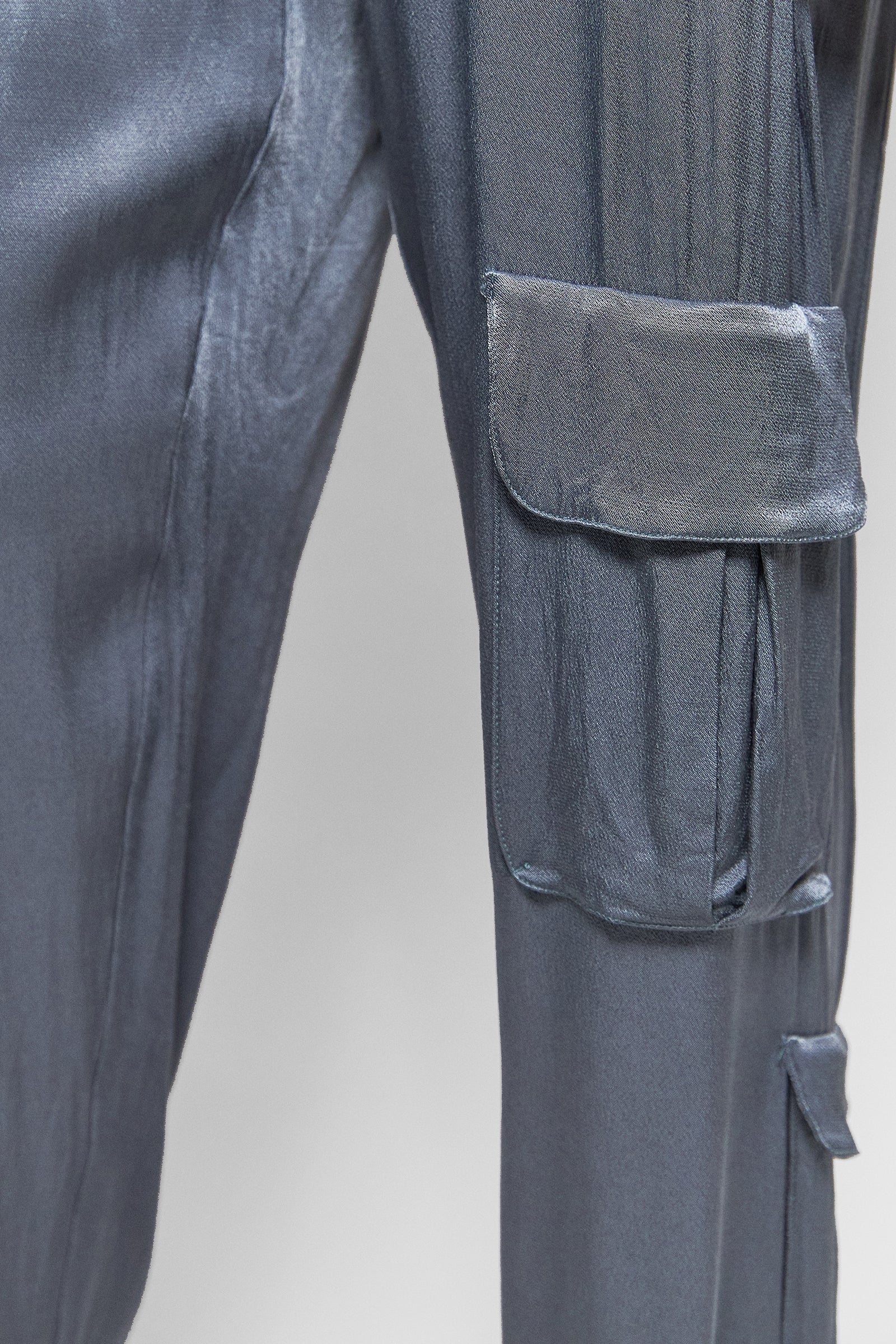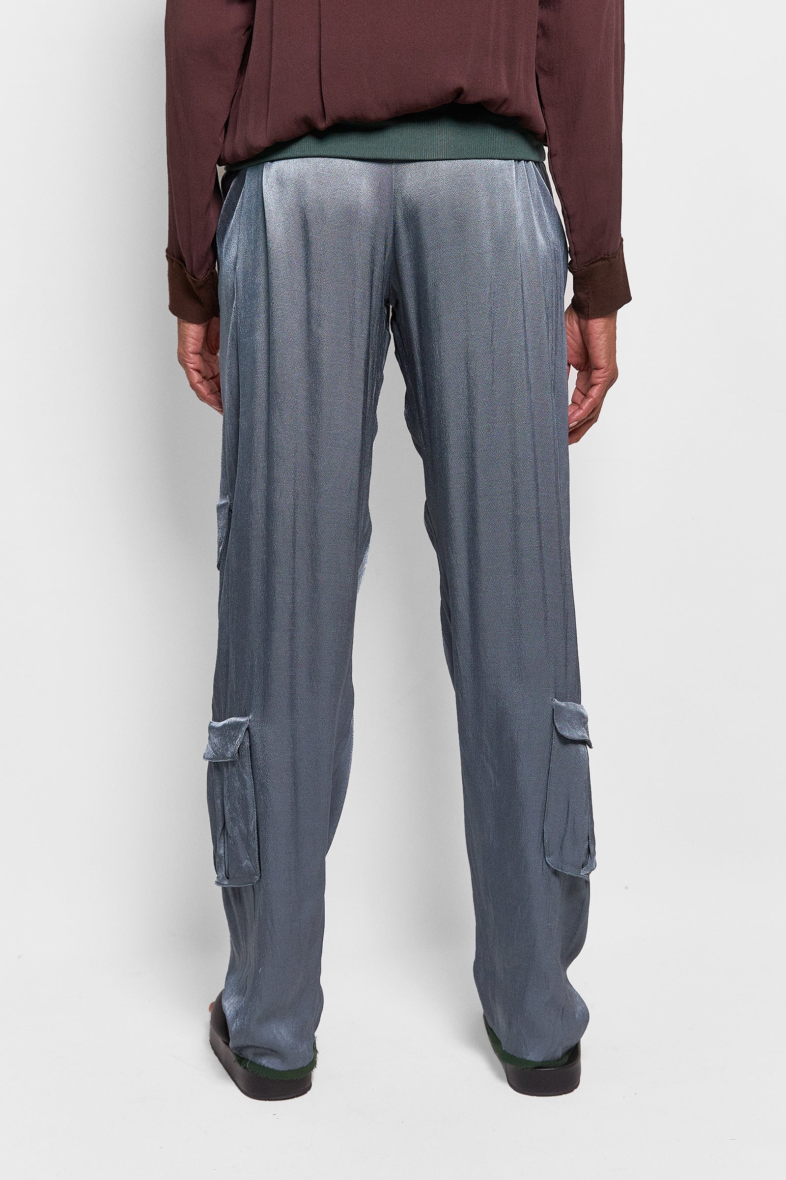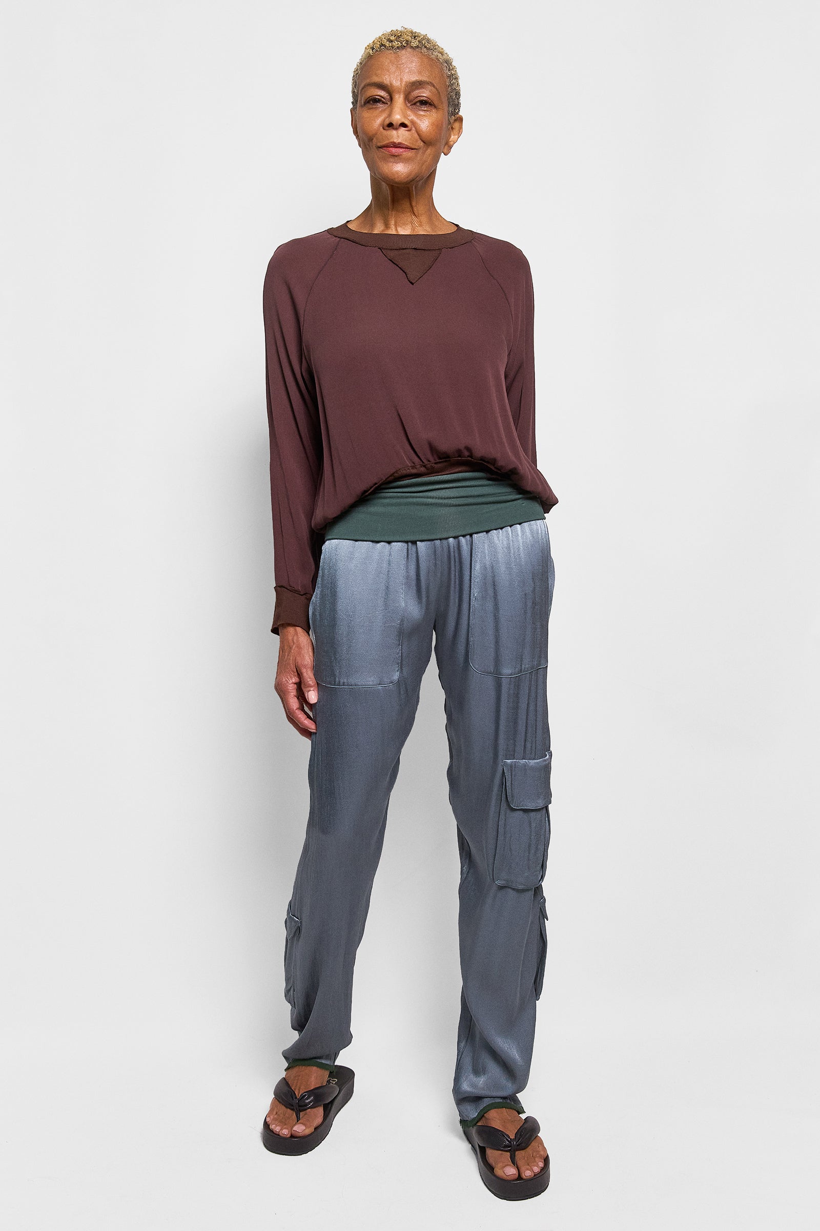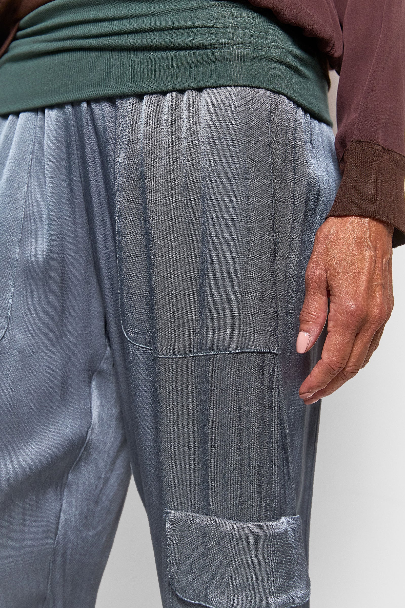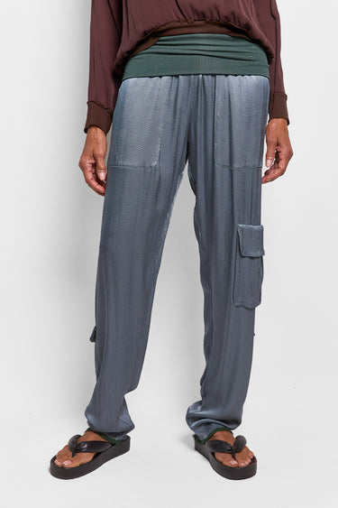 a pant to nap in. the most comfortable waistband ever ... the wide rib can be worn up for a high waist effect or rolled down for a low waist relaxed look. this stretch viscose pant has 3 silk georgette cargo pockets. true to size.