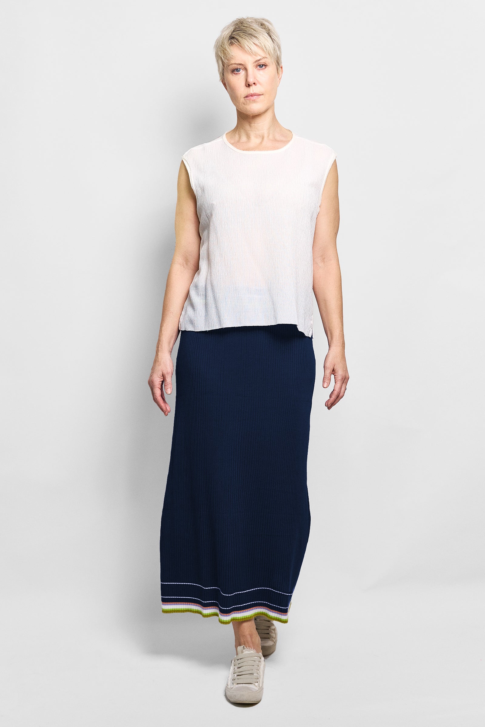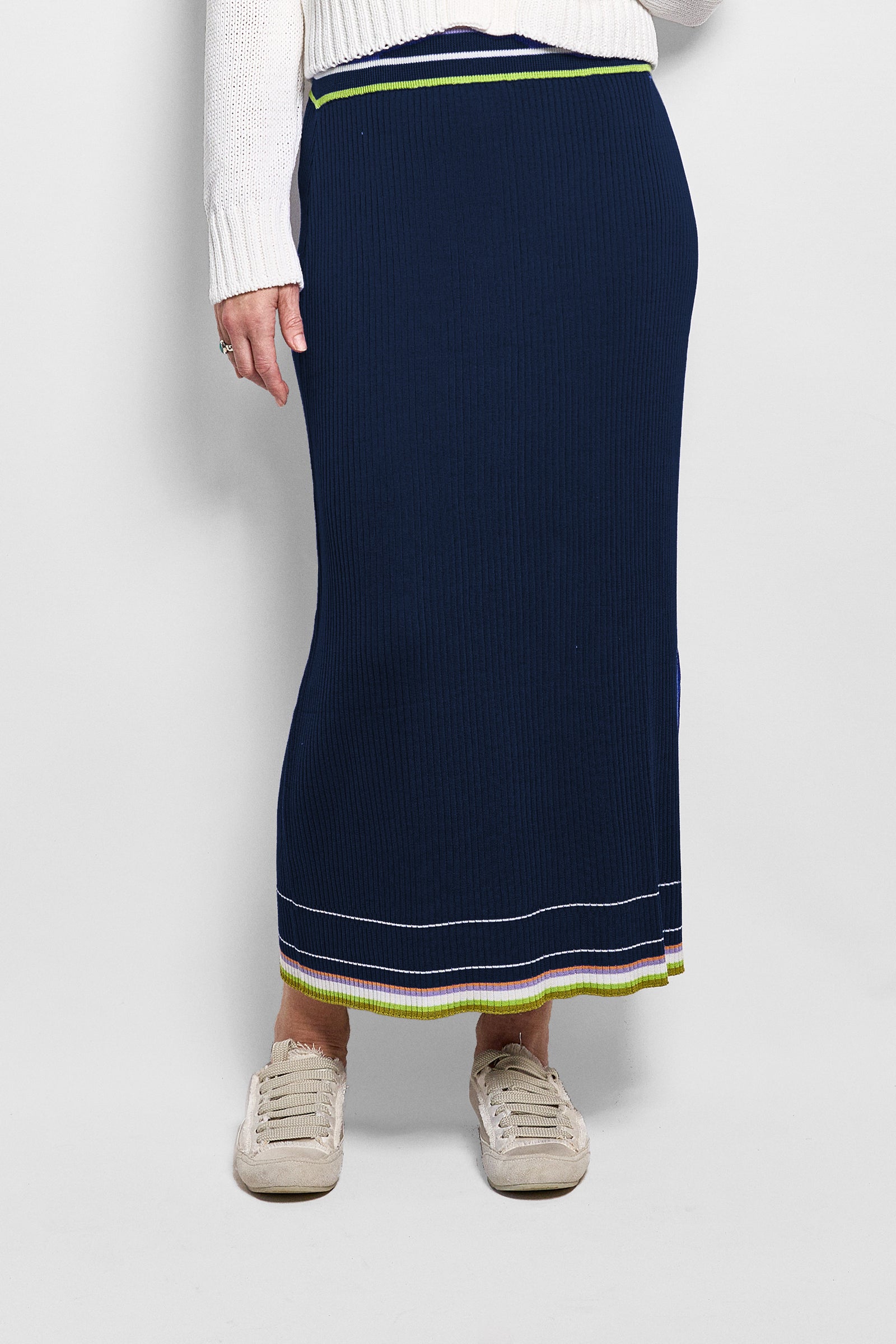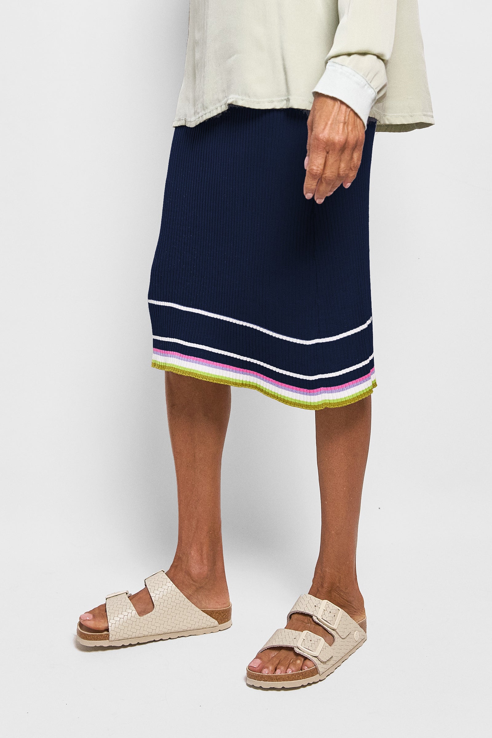 the comfy-est skirt : soft & stretchy this pull on rib skirt is knitted in a cool in tencel yarn. multi-stripes add a sport influence. a soft elastic waistband dials up the comfort. there are 2 lengths - s/m finishes just below the knee and m/l is midi length. true to size - fits neat.