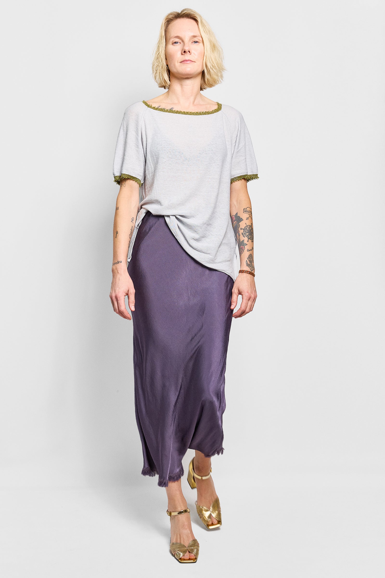 a simple tee that is finished with a fine metallic raw edge - like a piece of jewellery. a mix of lightweight linen/cotton yarn. true to size - this style is slightly loose in fit.
