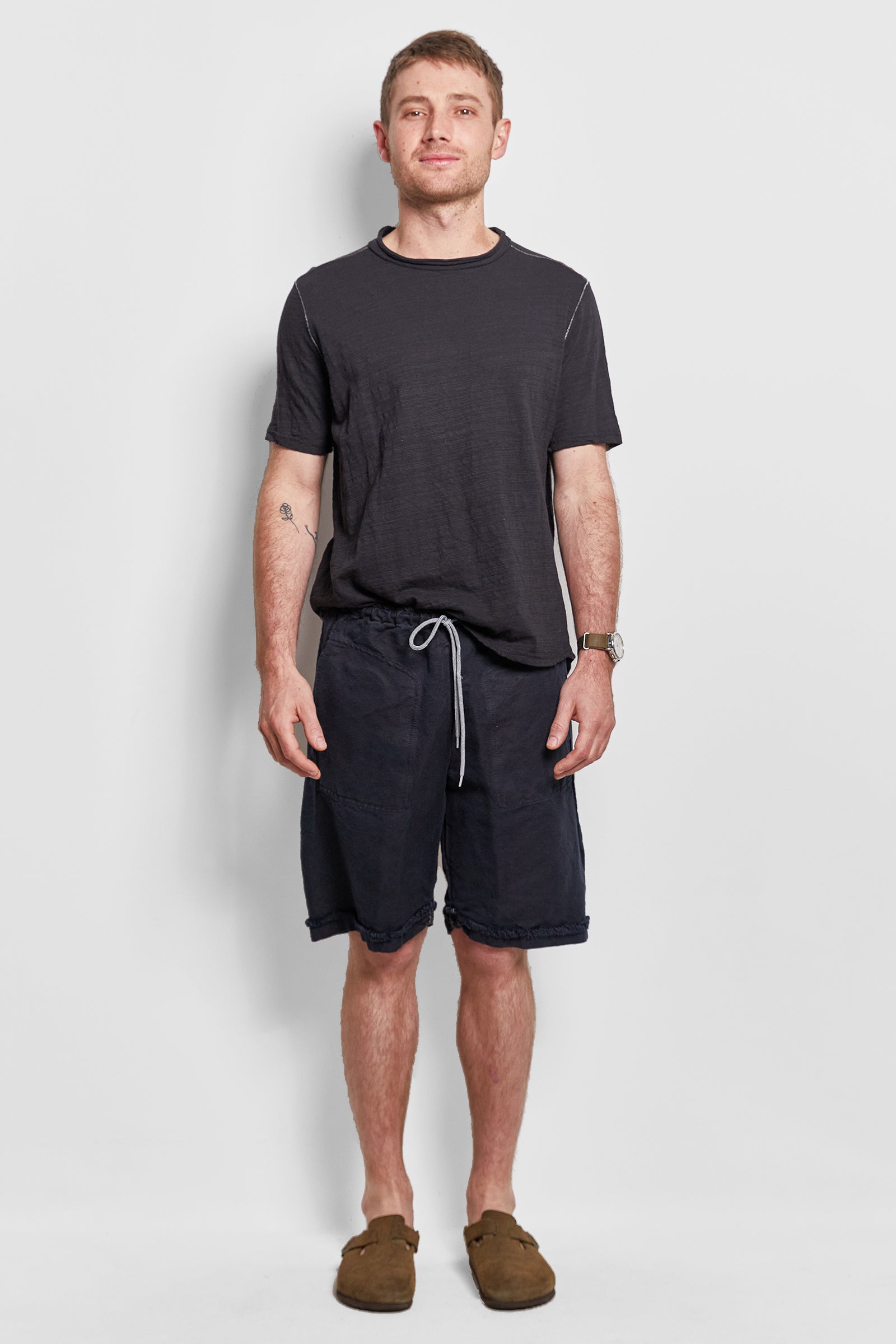 the ryder tee - a not so basic tee shirt. composed of a soft blend of cotton & linen, the yarn mix gives the fabric a slight texture. contrast stitching details and distressed edges. a unisex tee, true to size for women, size up for men recommended.