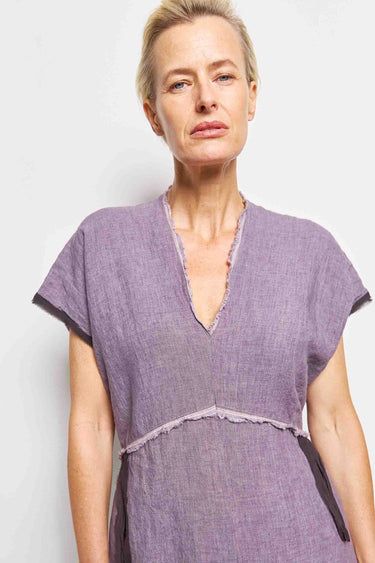eli is a relaxed washed linen dress. it features a back tie waist so the dress can been worn shaped in or loose. silk georgette binding, raw edges & selvedge edges feature. fits true to size.