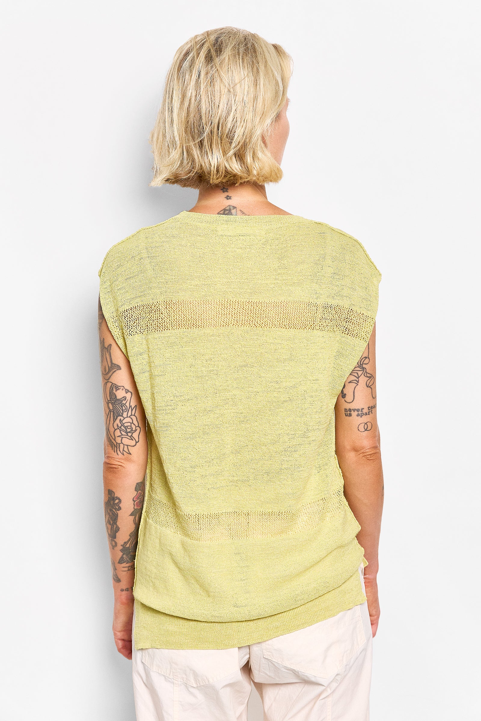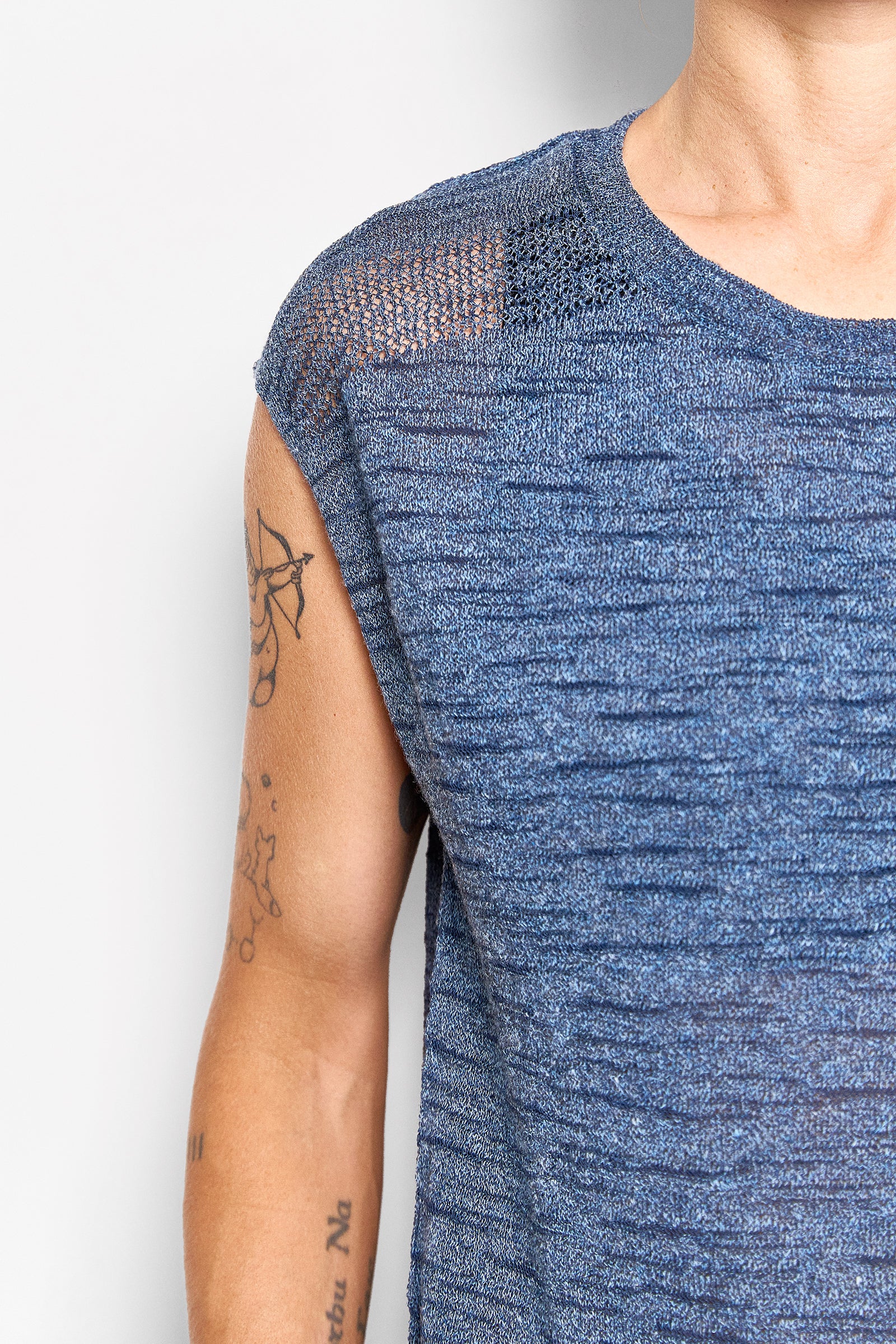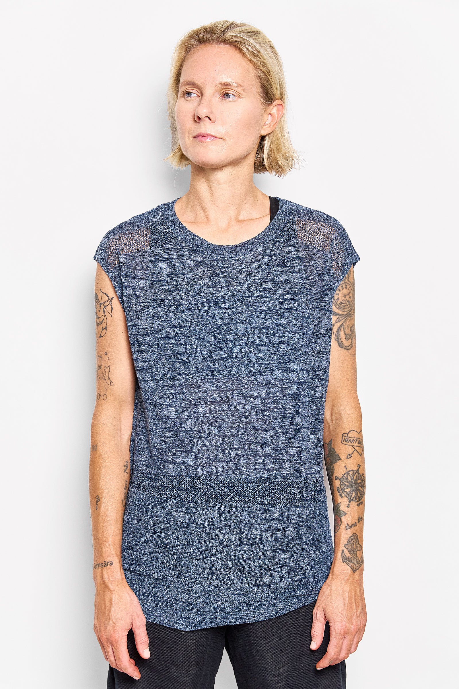 a very fine gauge, lightweight summer knit. textural contrasts are created with stripes of different knit structures. the yarn is a linen/cotton/recycled polyester mix. this combination means the top will not loose it's shape over time. true to size.