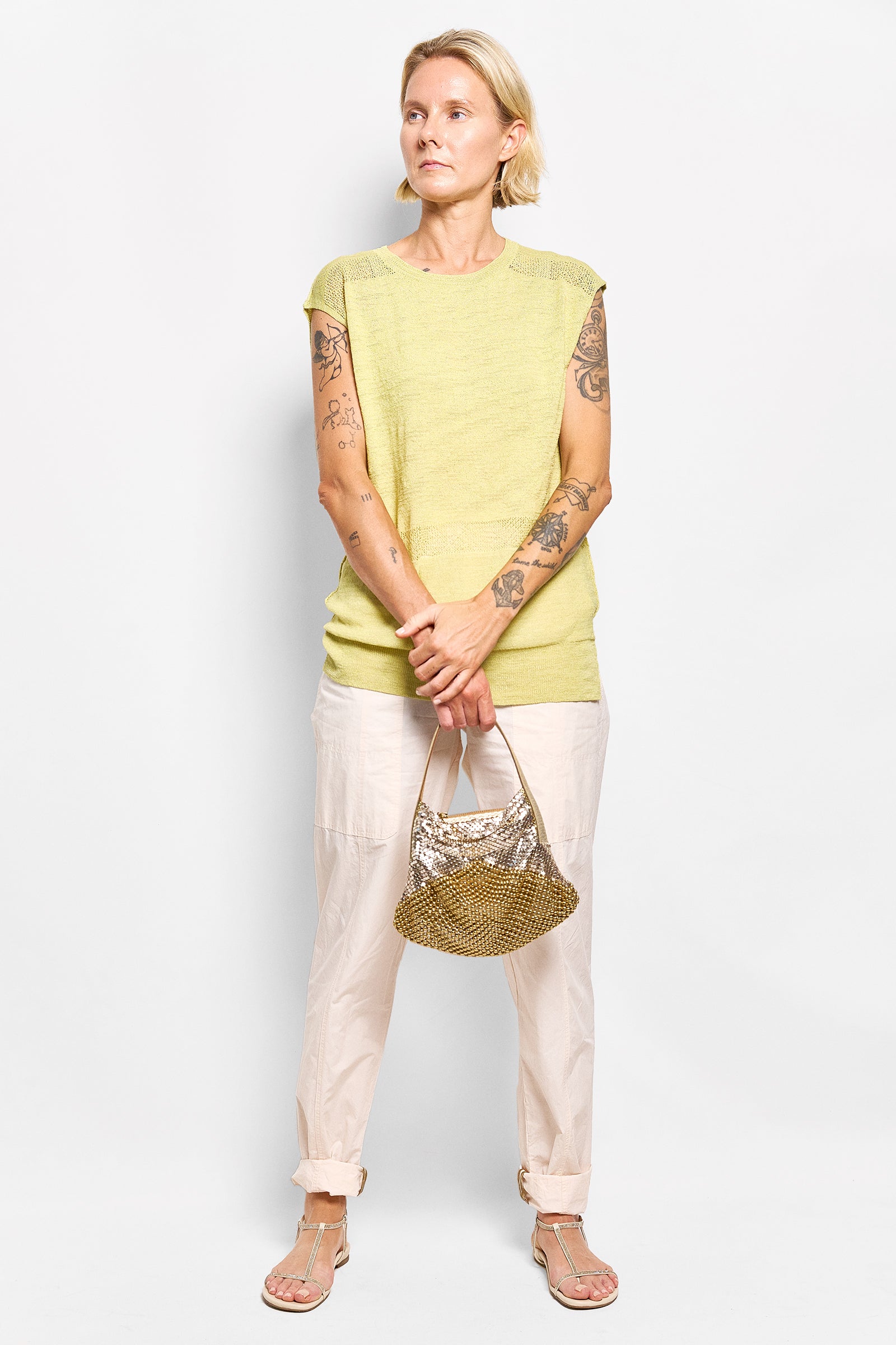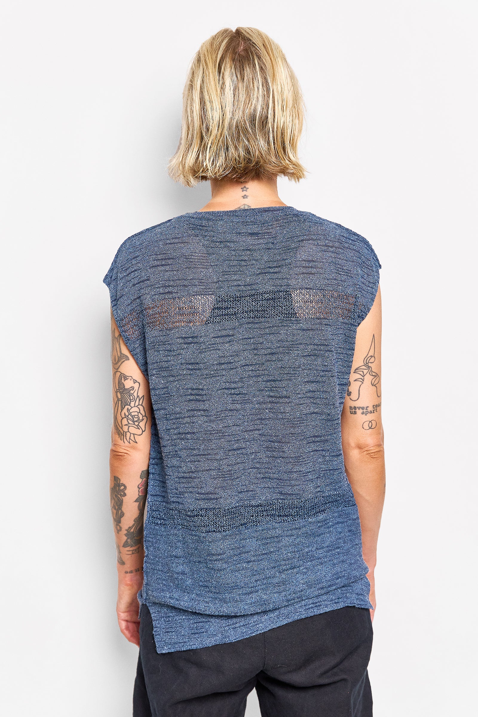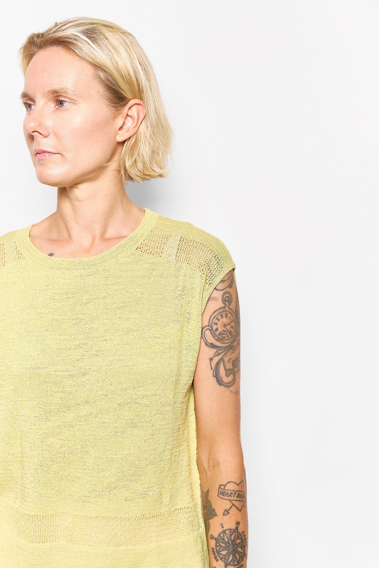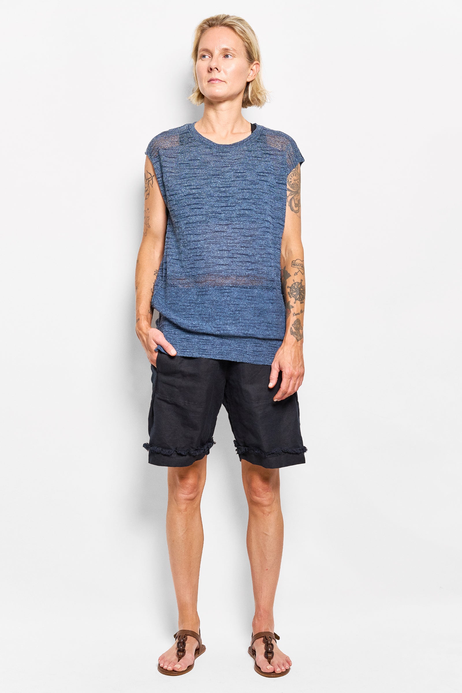 a very fine gauge, lightweight summer knit. textural contrasts are created with stripes of different knit structures. the yarn is a linen/cotton/recycled polyester mix. this combination means the top will not loose it's shape over time. true to size.