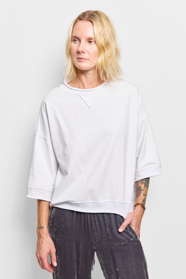 a mid-weight, short sleeve sweat top that has overlapped seams and raw edges. this rustic tee is cut in an unbrushed french terry. layer over a skinny knit tee. oversized.