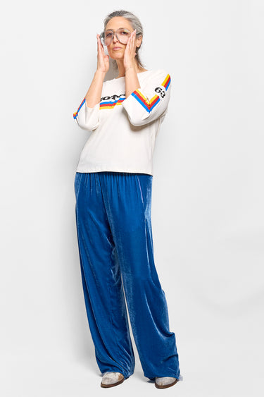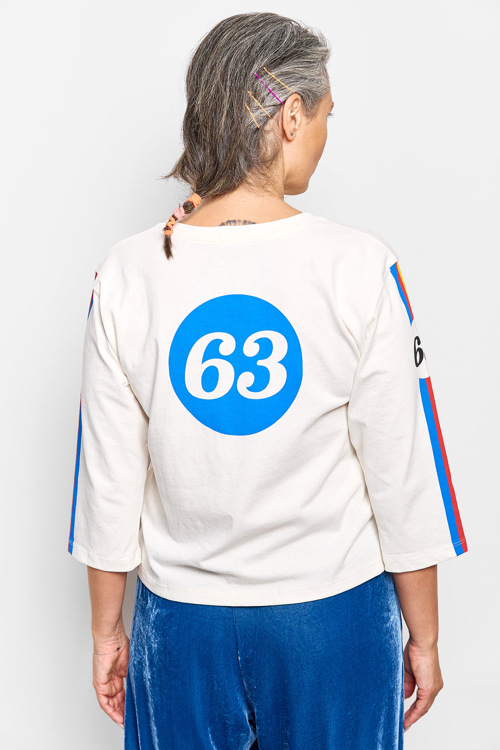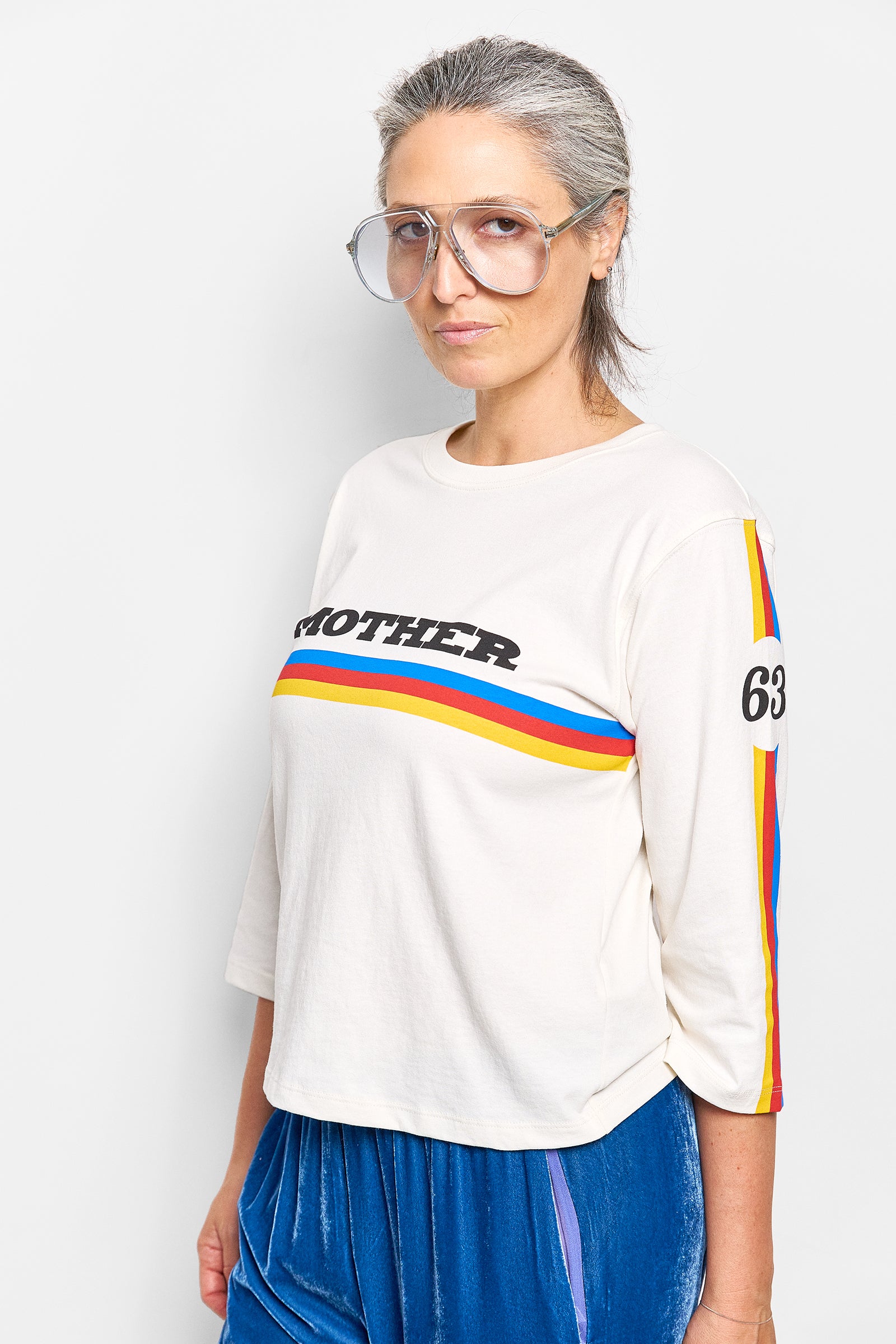 Add a sporty look to your slouchies with this loose boxy fit crew neck tee featuring stripes on the front and on the elbow length sleeves.