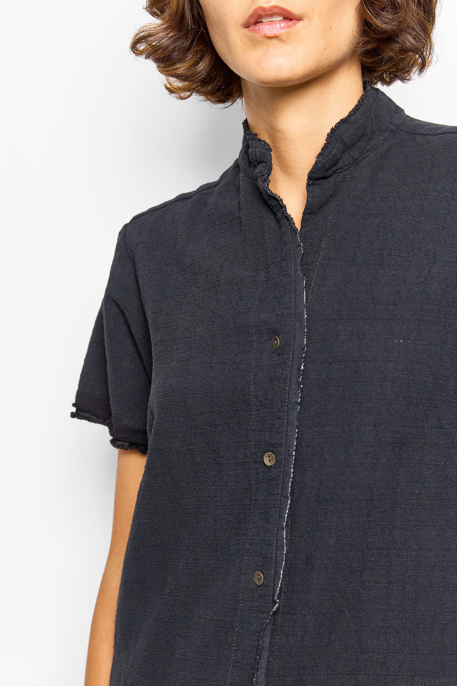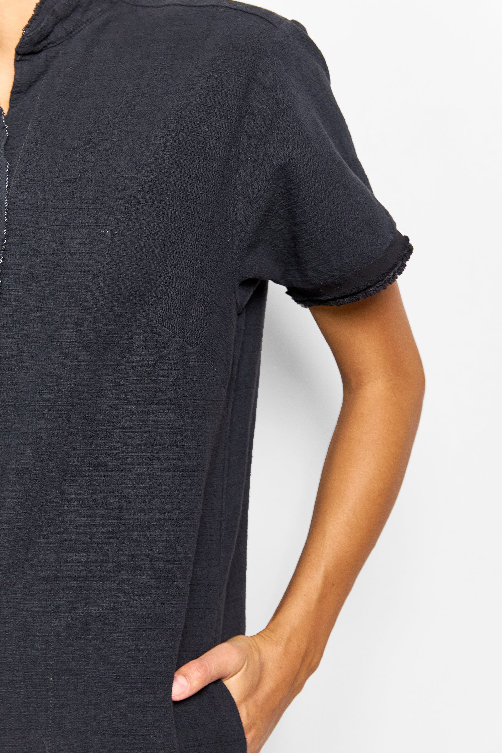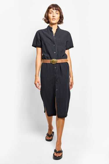ginger is a shirt dress composed of cotton and linen. designed with a button down centre front and features frayed hems and selvedge edge details. a casual summer dress to be worn relaxed, belted, or open over shorts or pants. relaxed fit.