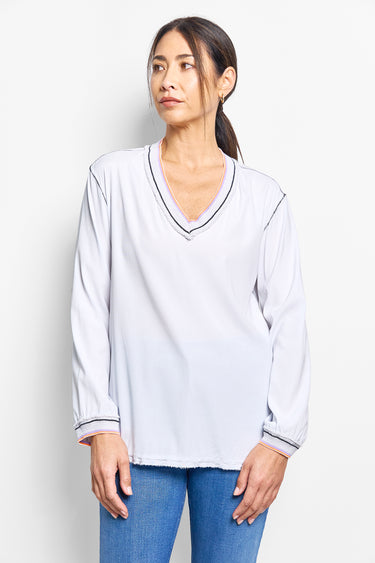 luxe-y athleisure perfect for travelling. this silk tee shirt features sporty trim details. high side seam splits allow for an easy front tuck effect. contrast loose tension stitching finish the look. true to size.