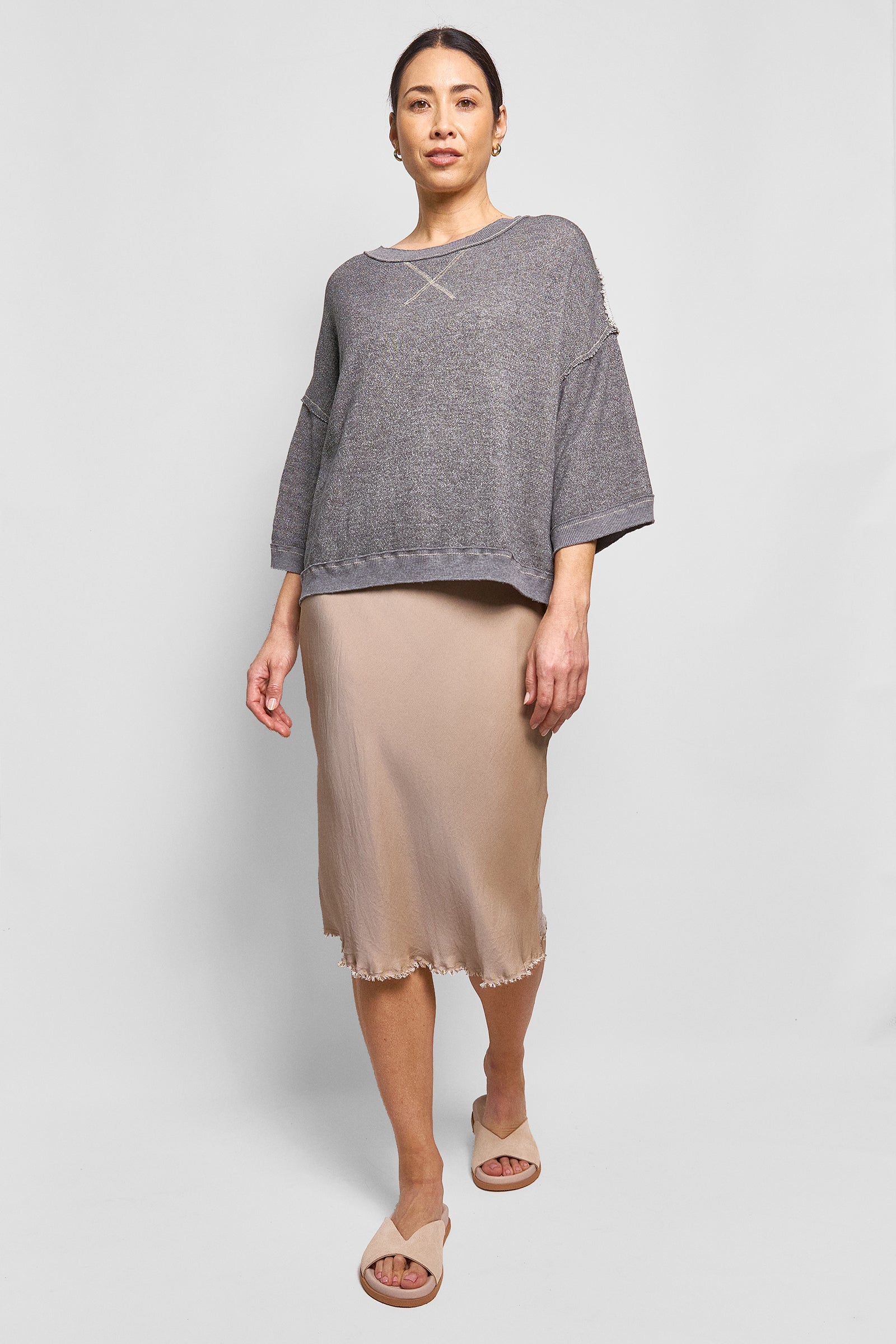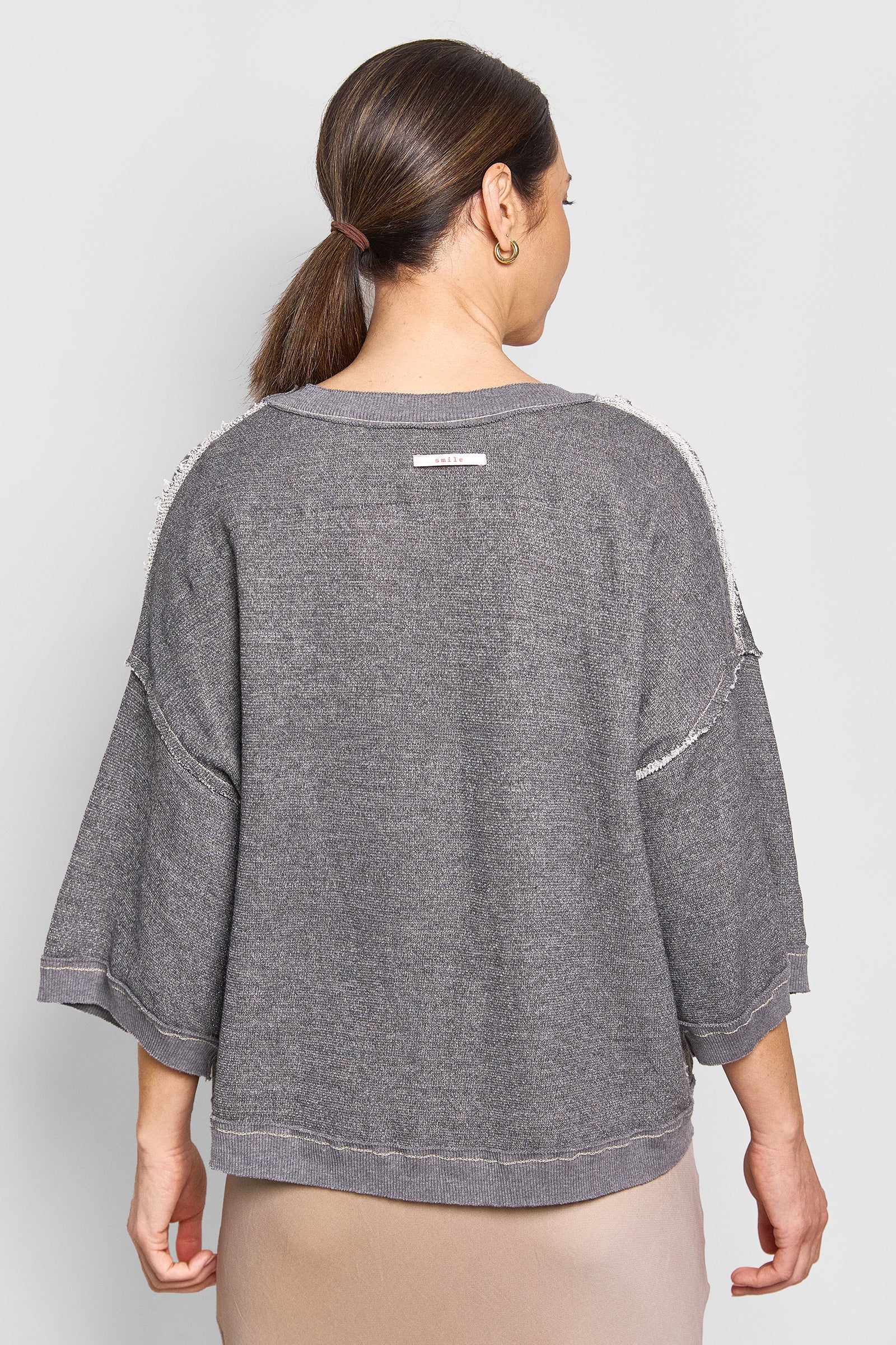 a mid-weight, short sleeve sweat top that has overlapped seams and raw edges. this rustic tee is cut in a sparkly unbrushed french terry. layer over a skinny knit tee. oversized.