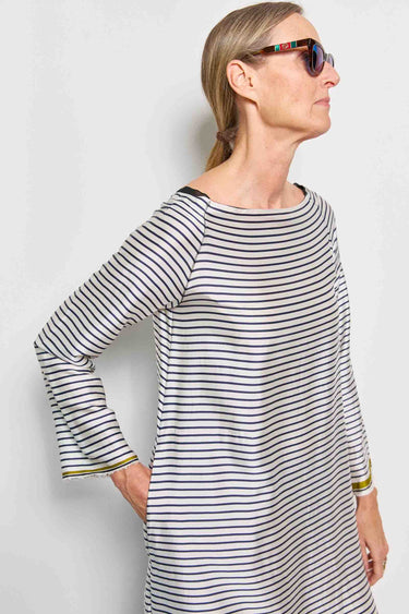 a simple silk dress... blanche midi dress. the seams are constructed with our signature loose tension and silk pockets. engineered in the cutting process to feature the contrast border and selvedge along the hems. the side splits enhance the relaxed fit.