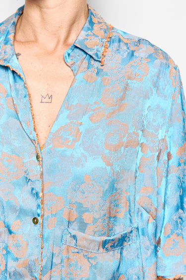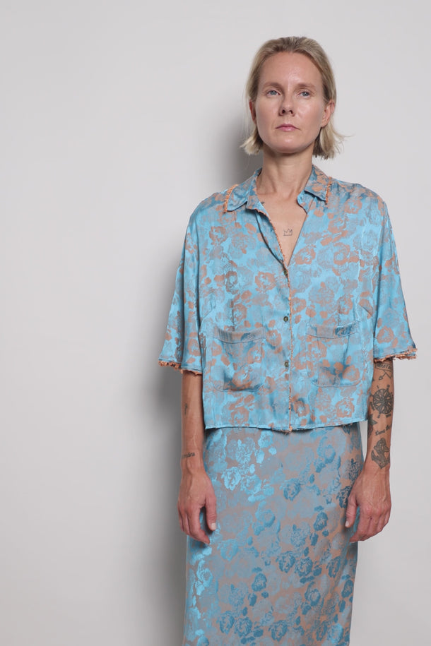 a cropped, button up shirt in a drapey, satin jacquard. we carefully cut the selvedges off the fabric and then use them to finish the edges. front pockets, japanese brass buttons and a raw hem finish the look. true to size.