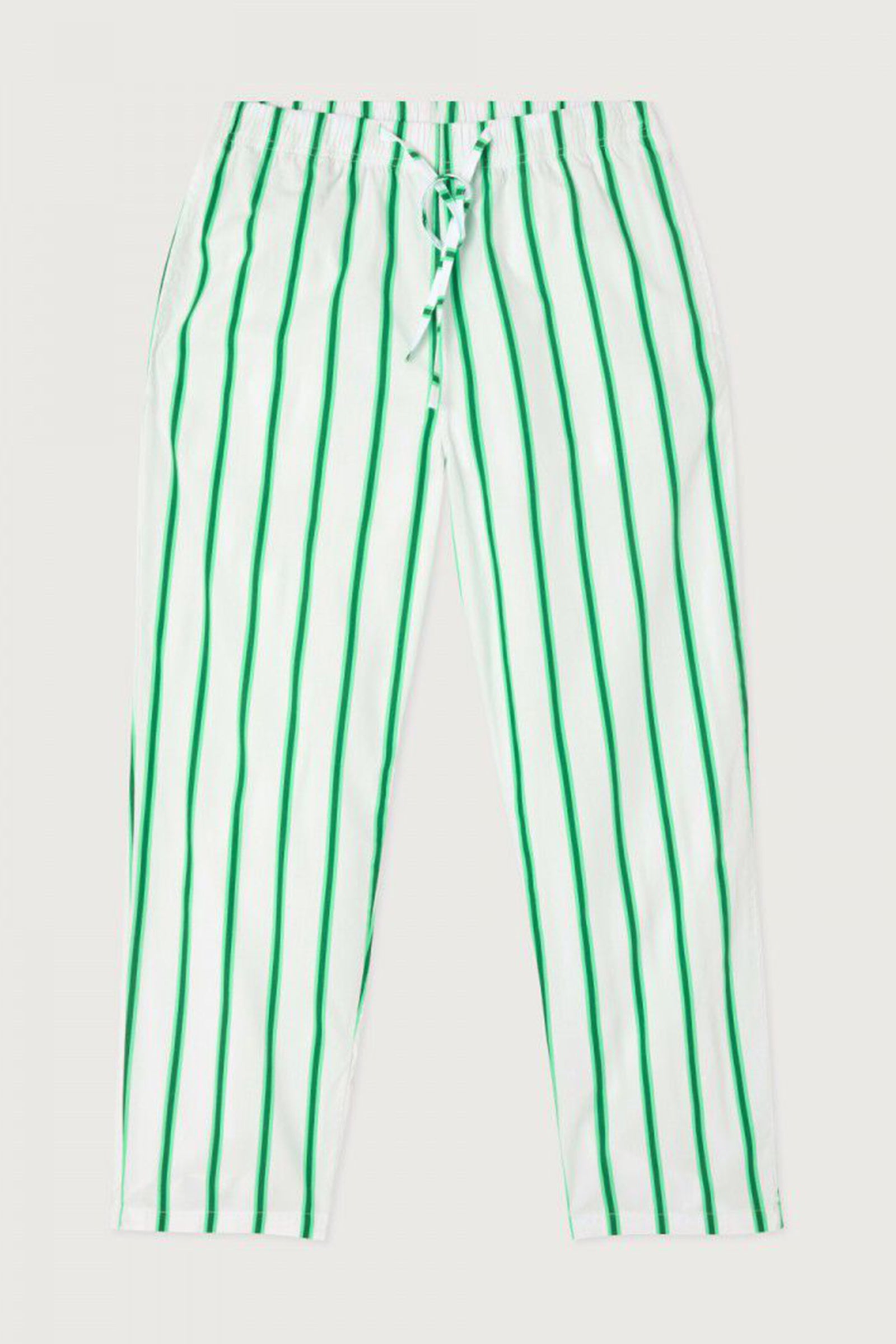 lightweight cotton poplin trousers which taper at the leg. the perfect pant for summer in a fun 'neon lagoon' stripe. features an elastic waist, two welt pockets and a drawstring tie. designed to wear loose-fitting, oversized.