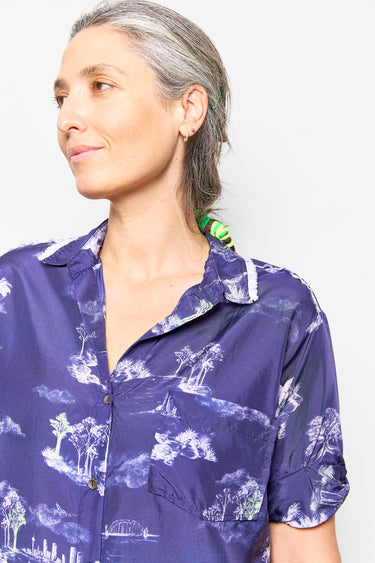 the band shirt in our sydney harbour toile print. look for the bridge, bin chickens, sharks and swimmers. featuring a slightly soft twisted sleeve. wash, hang dry - practical & comfortable. true to size - a relaxed fit.