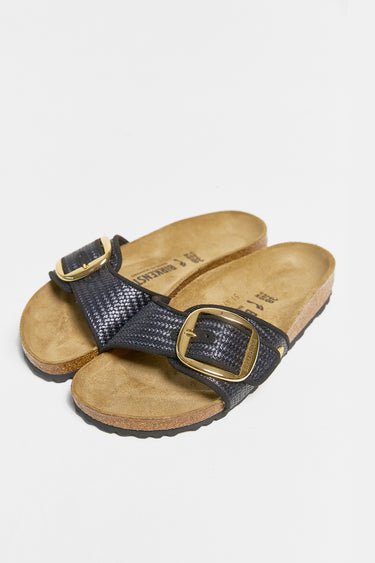 Madrid is the oldest member of the Birkenstock model, originally sold a 'fitness sandal' these simple single strap sandals are a firm favourite. These madrids' feature an oversized buckle wrapped around a thick raffia strap.