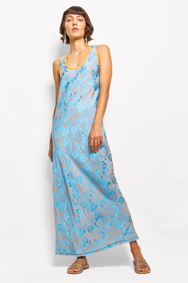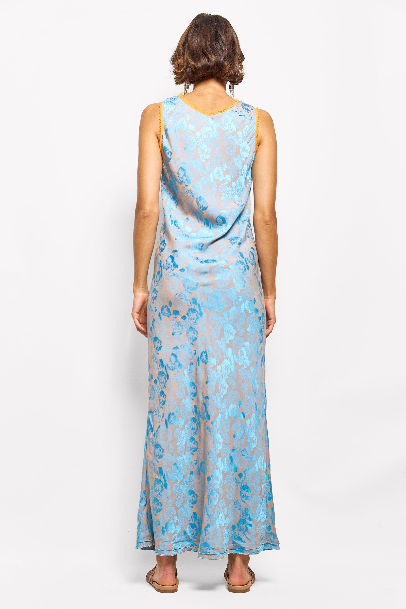 caron is the simplest of dresses - bias cut in a beautiful blue floral jacquard - here the fabric does all the talking. a very versatile dress as can be worn with a low front neck or turned around for a high front neck. the best cut for expecting mums as can be worn easily after the baby is born. true to size.
