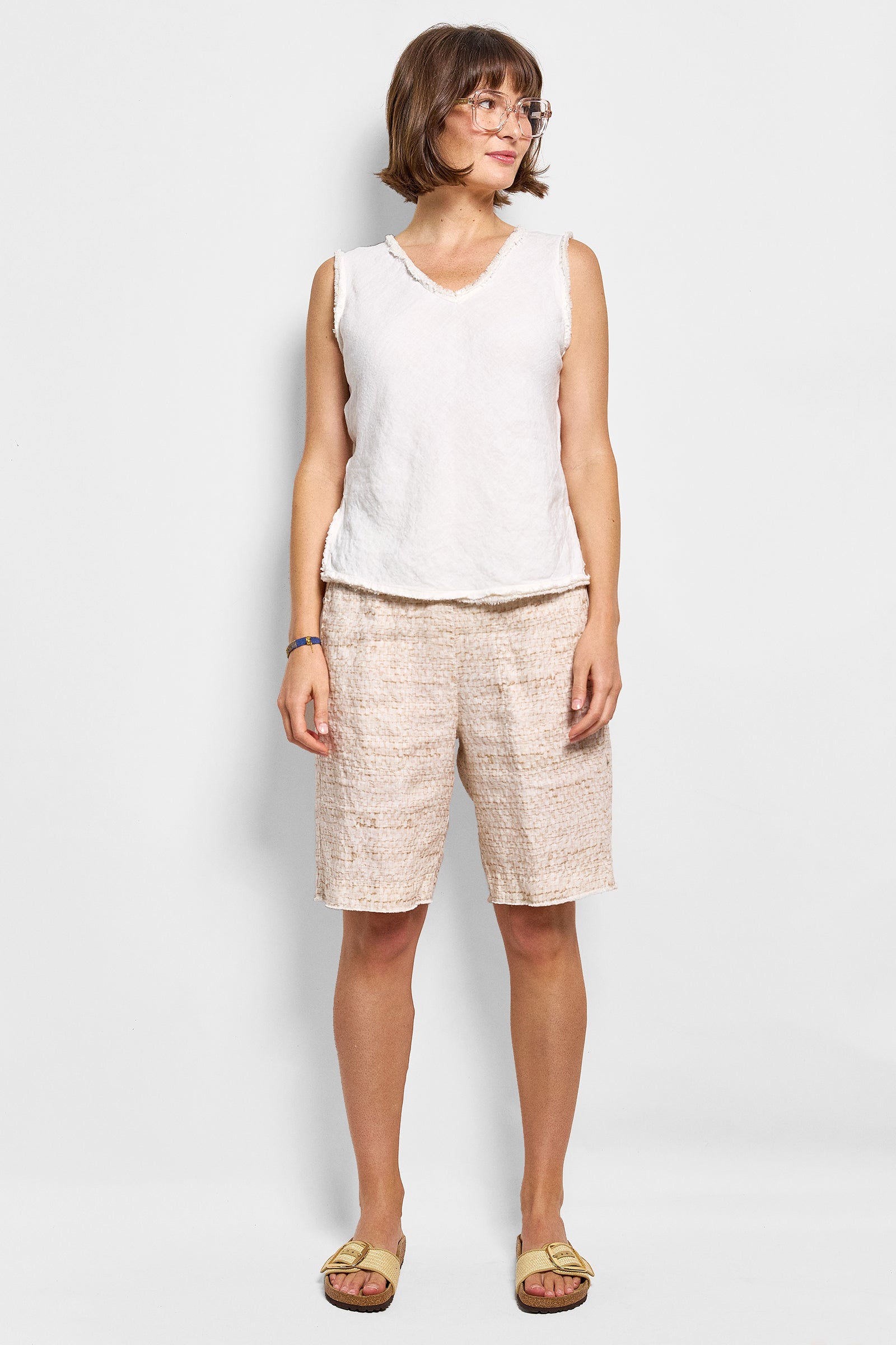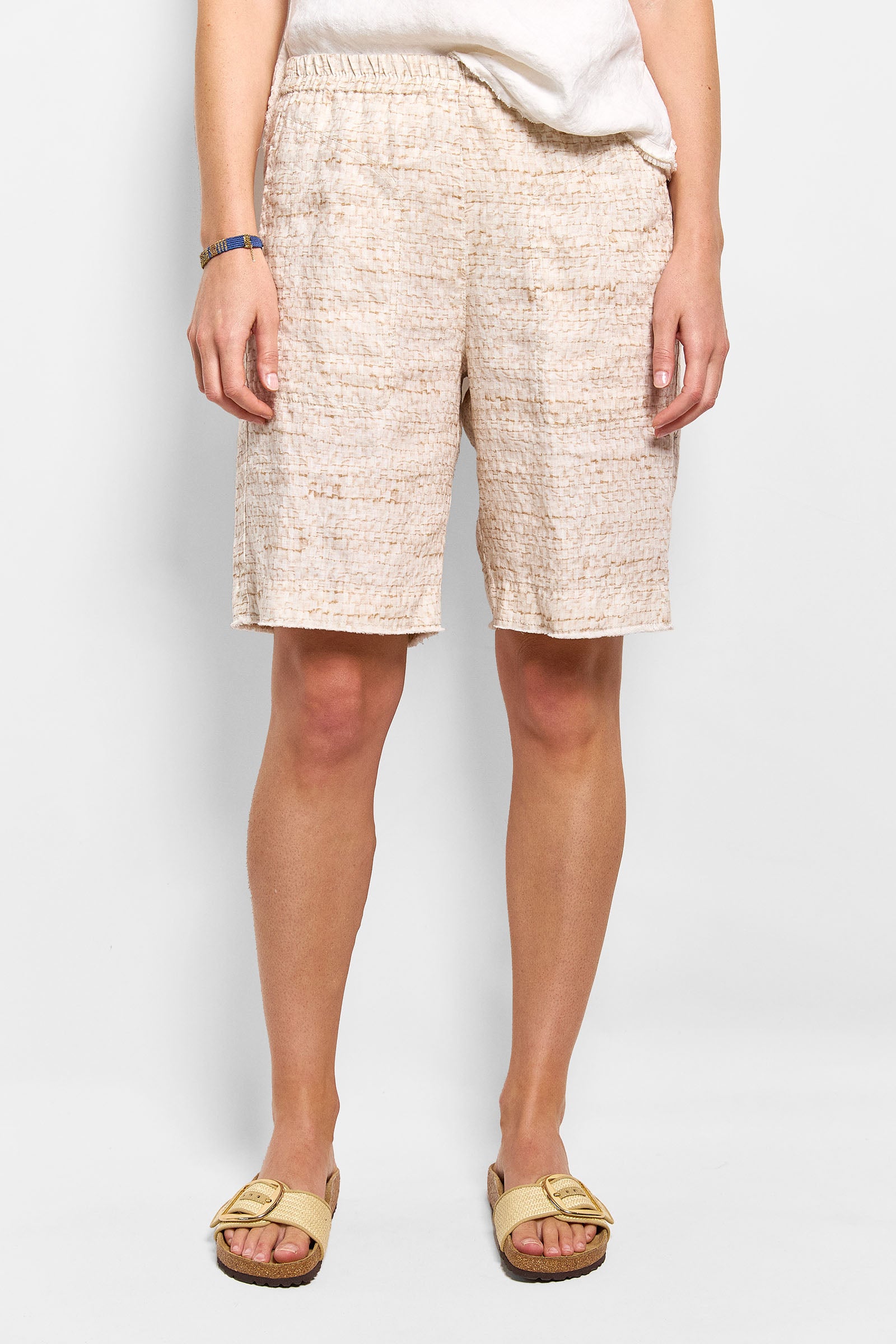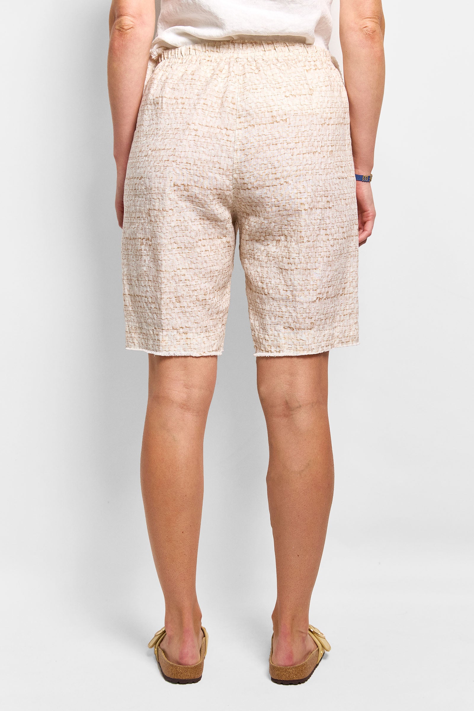 this linen short is cut in our exclusive selvedge weave print developed by Millie Hall 'arteest' extraordinaire. elastic waist and side pockets feature. true to size.