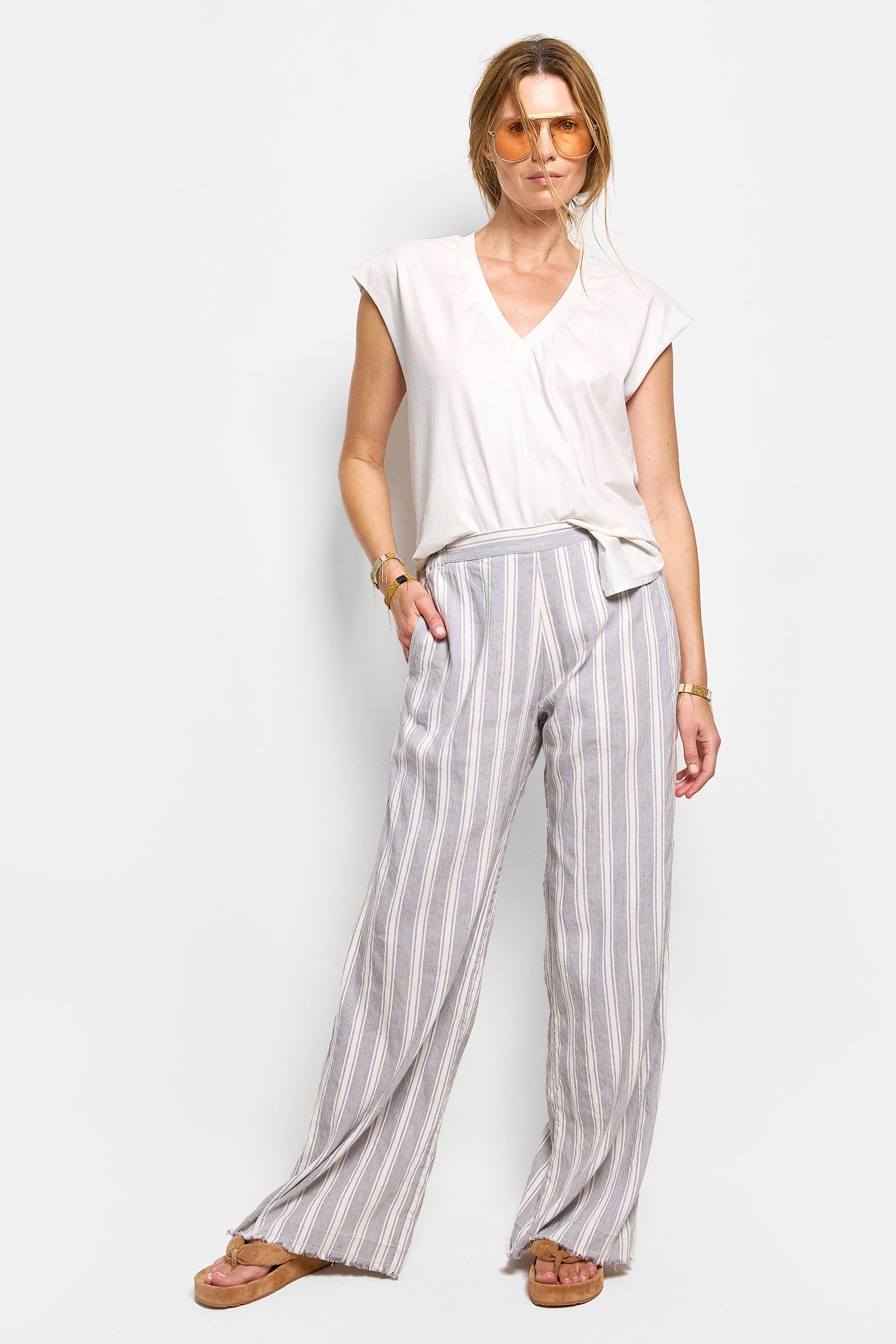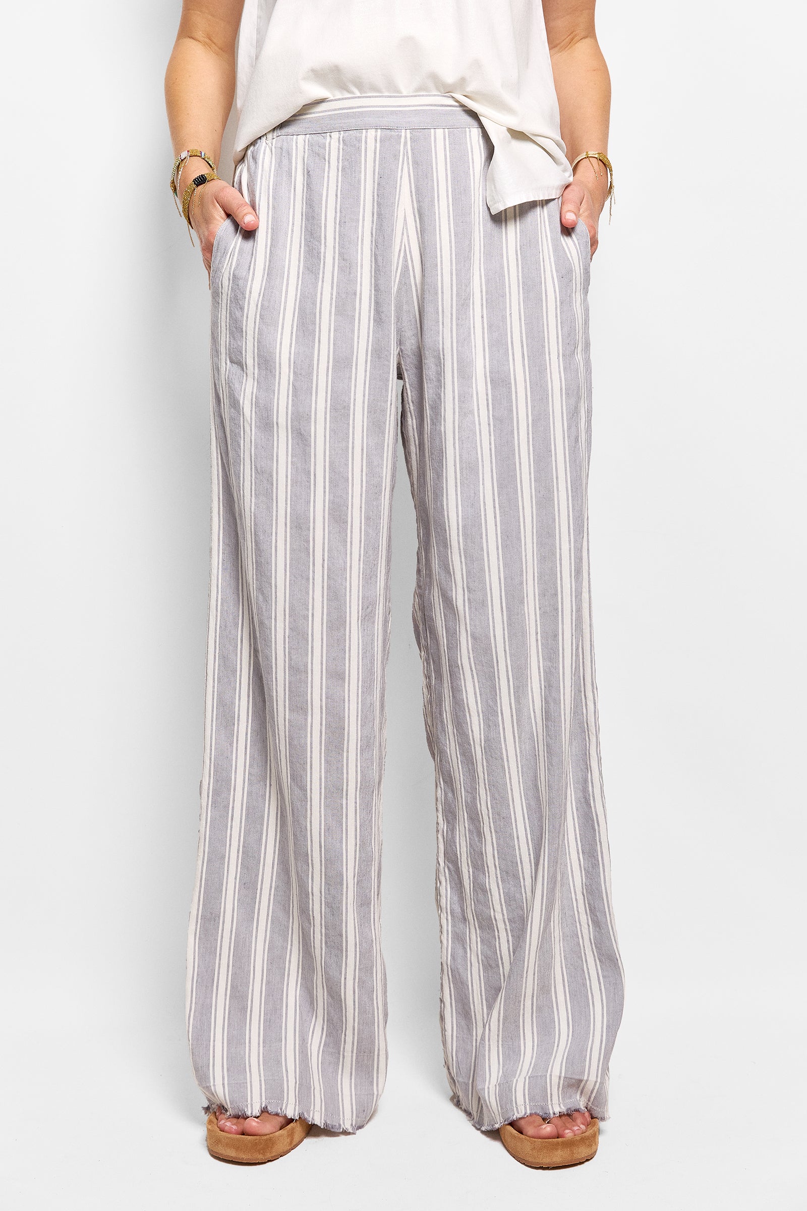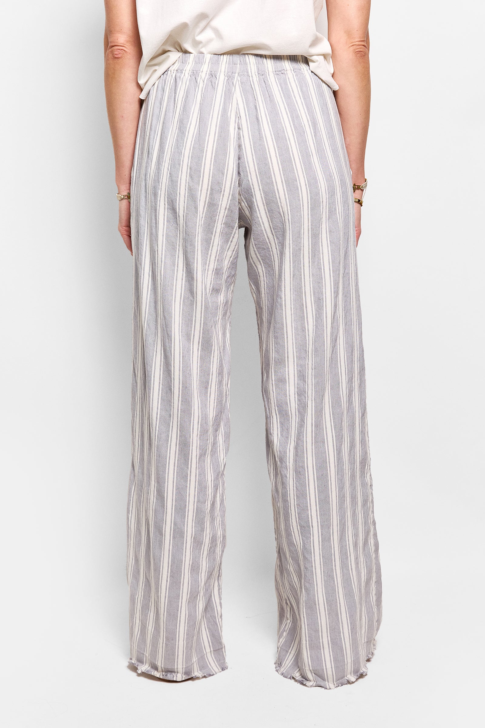cleopatra is a relaxed linen/rayon pant featuring a flat front waistband, an elastic back & side pockets. the pants are washed to give them a soft finish. featuring our signature frayed hem & fancy pancy stitch detail. true to size.