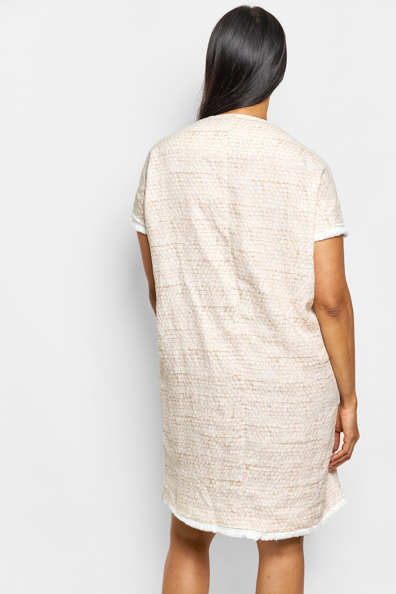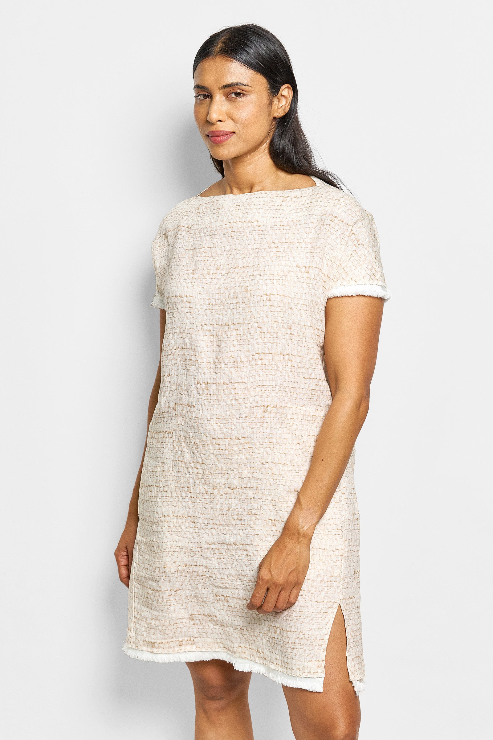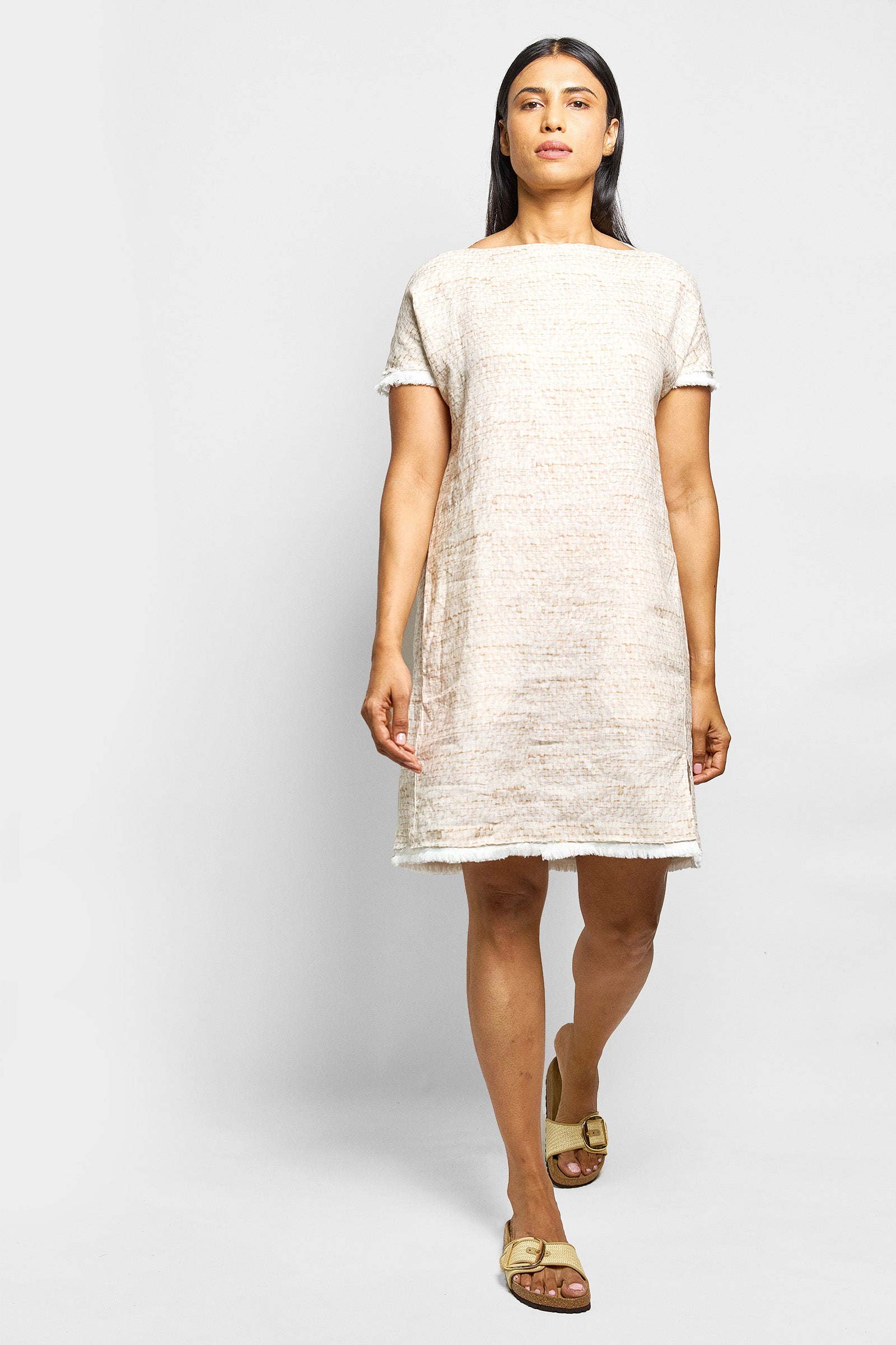 a simple, lightweight linen shift dress cut in our exclusive selvedge weave print. minimal in design but featuring very practical side seam pockets, a fringe hem and small side splits. true to size - loose fit.
