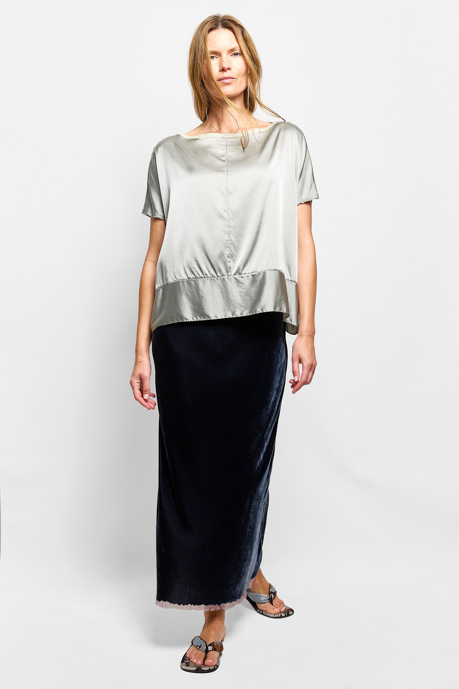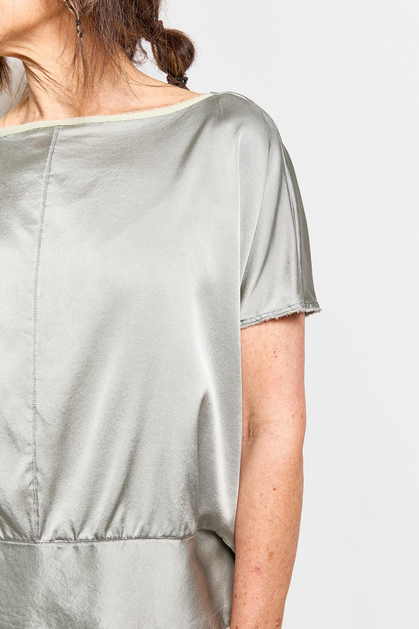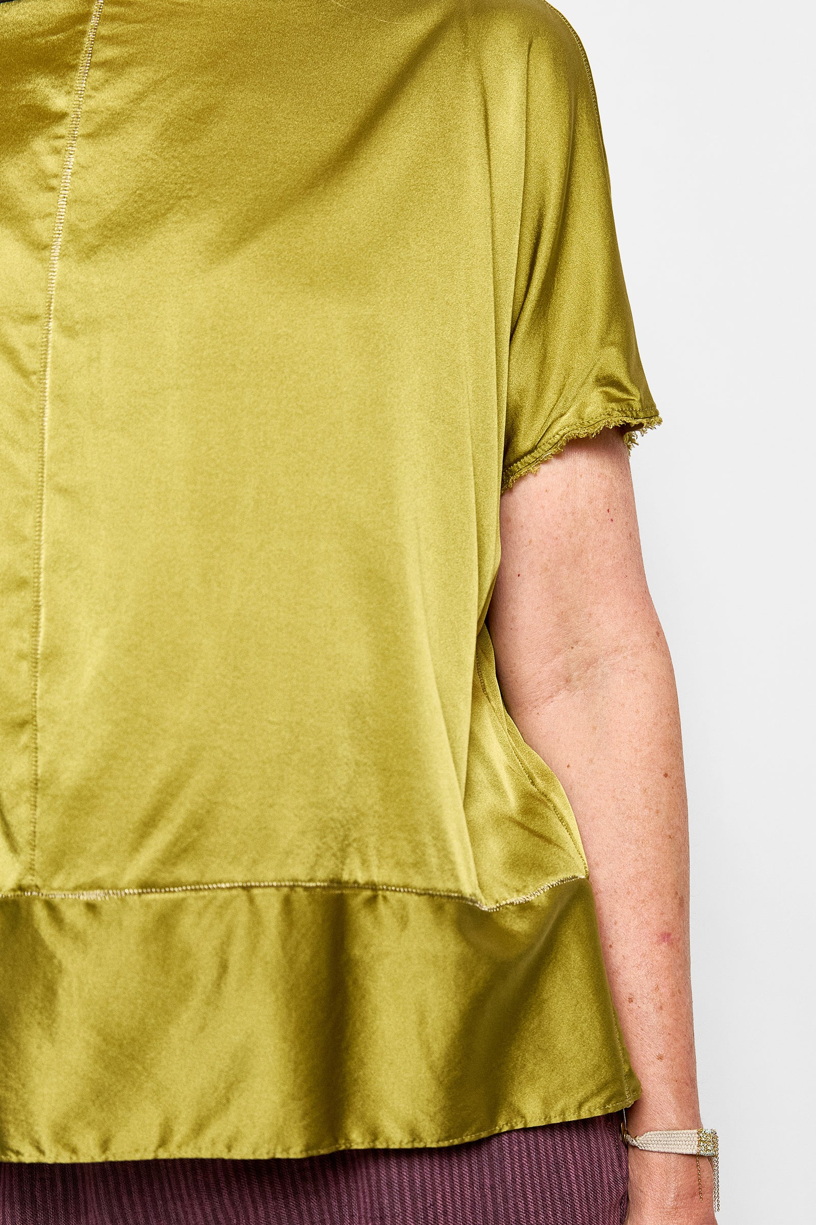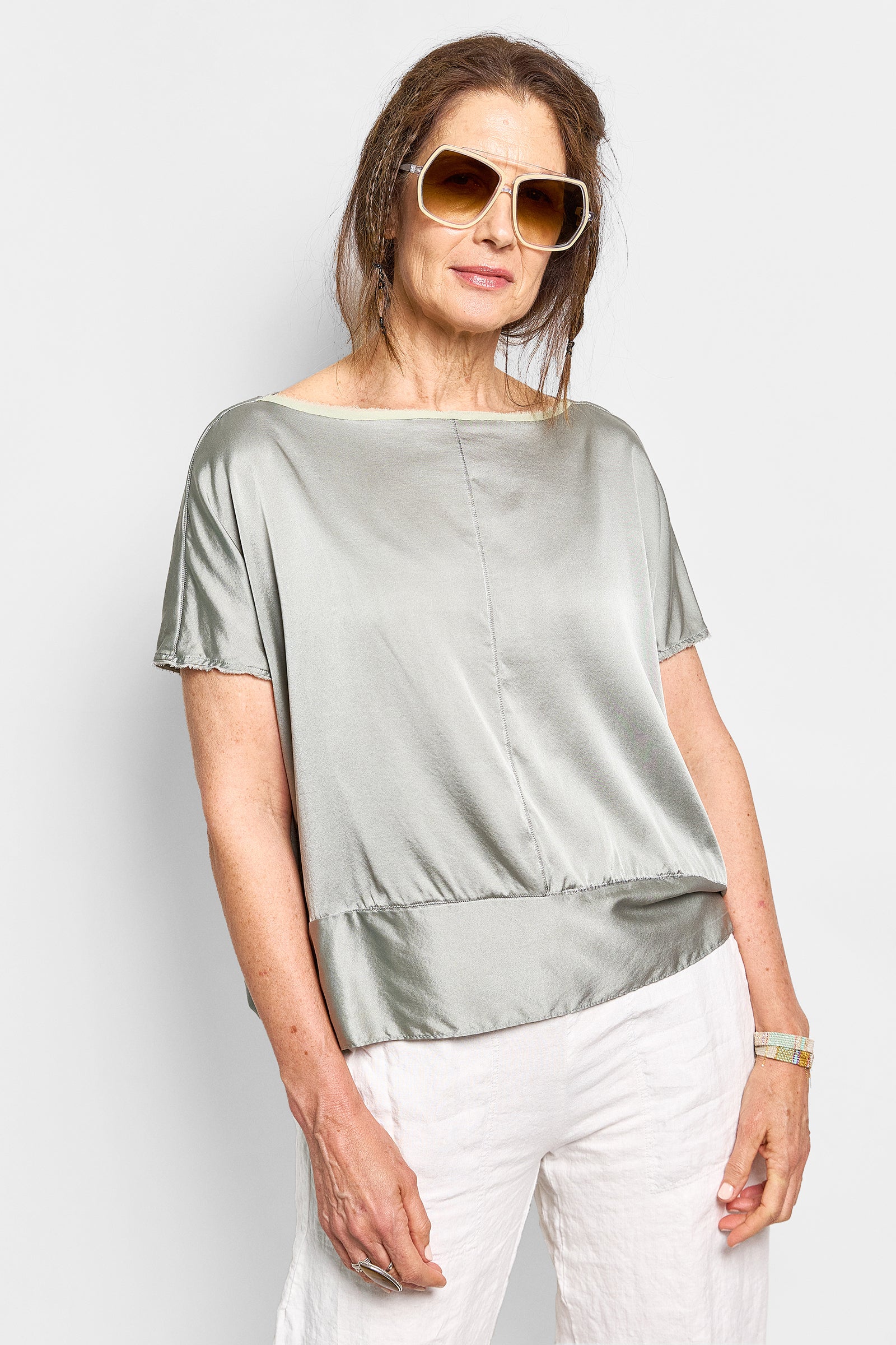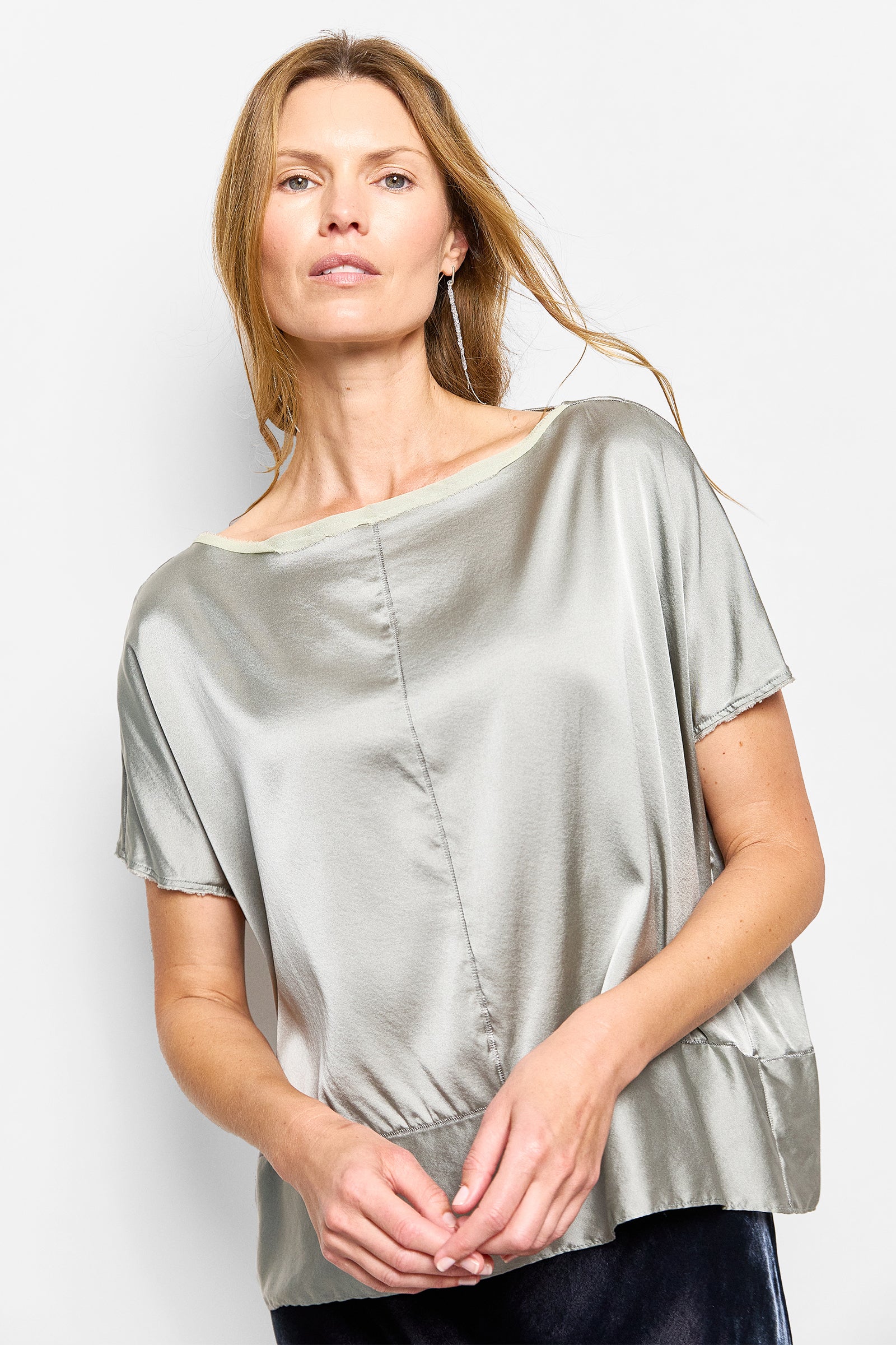 a flippy floppy tee in stretch silk satin. featuring coloured seam details and silk georgette binding that forms a gentle fray when washed. best tee for travelling as can be washed and dry by the next morning. oversized.