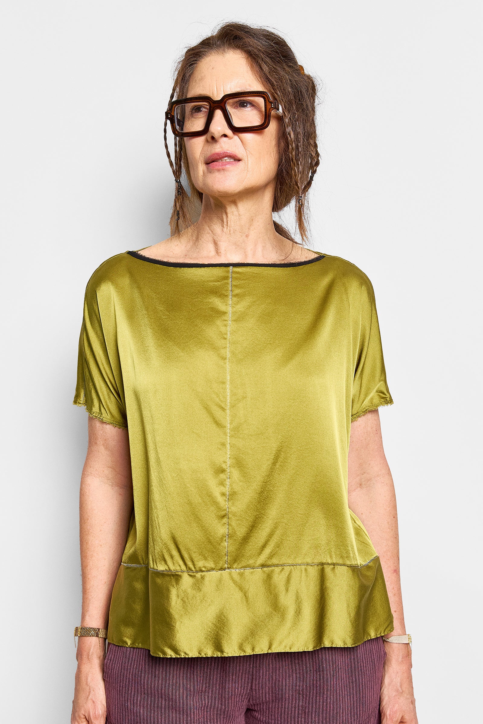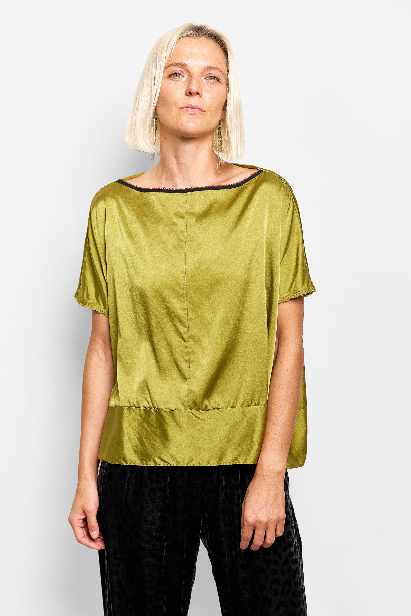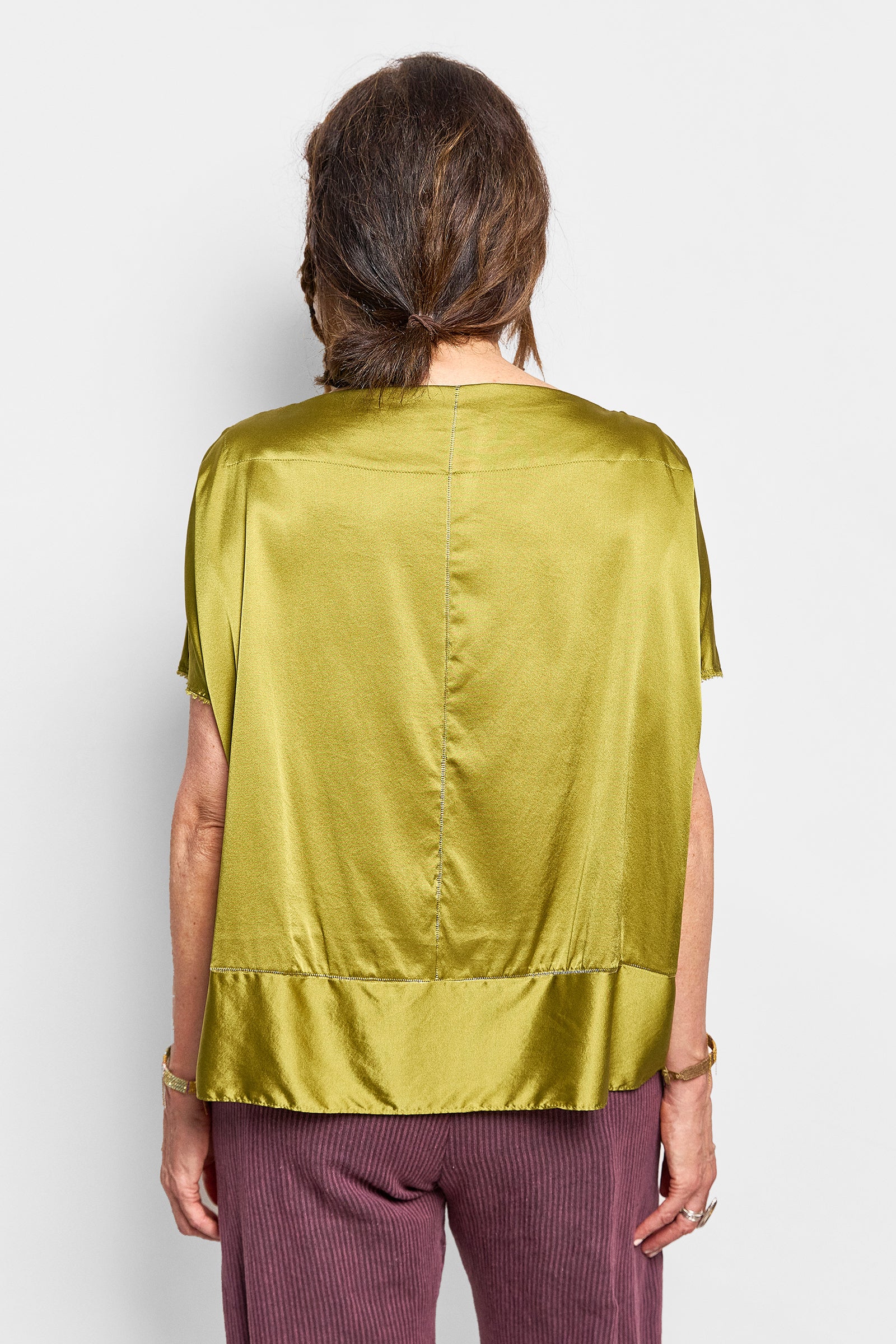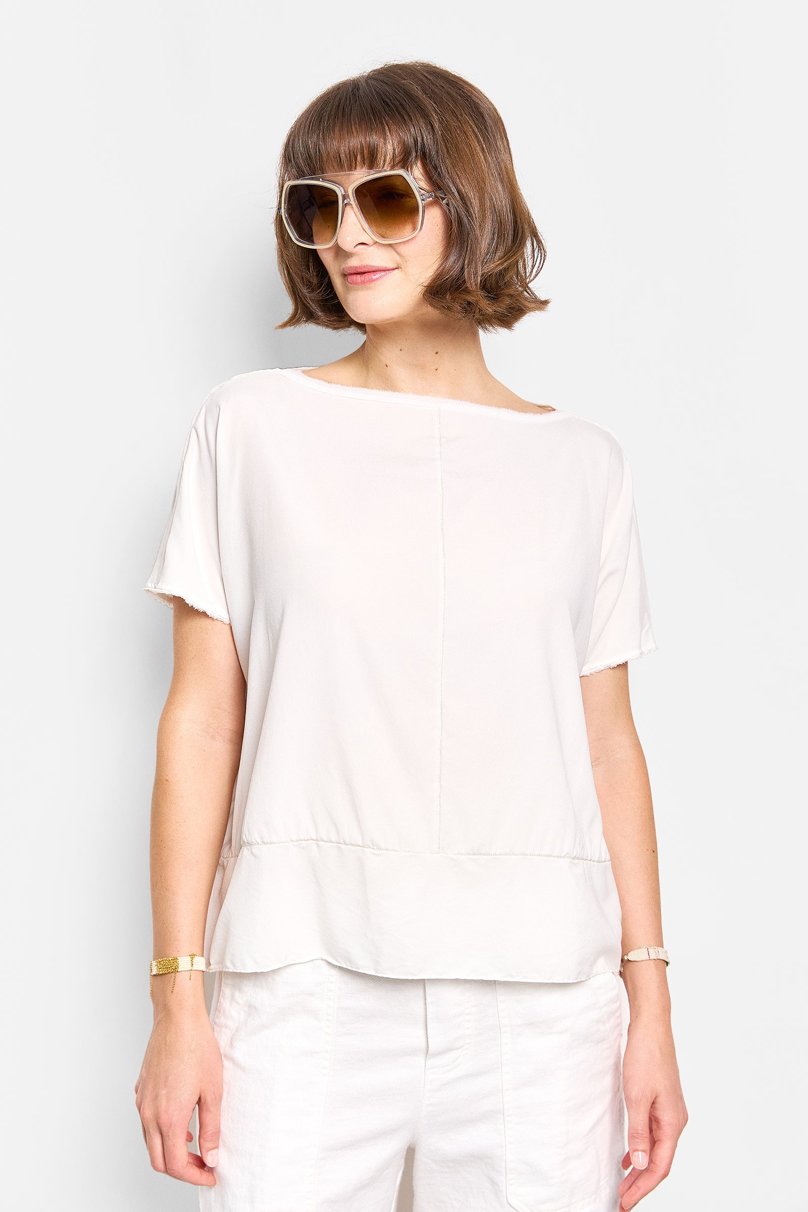 a flippy floppy tee in stretch silk satin. featuring coloured seam details and silk georgette binding that forms a gentle fray when washed. best tee for travelling as can be washed and dry by the next morning. oversized.