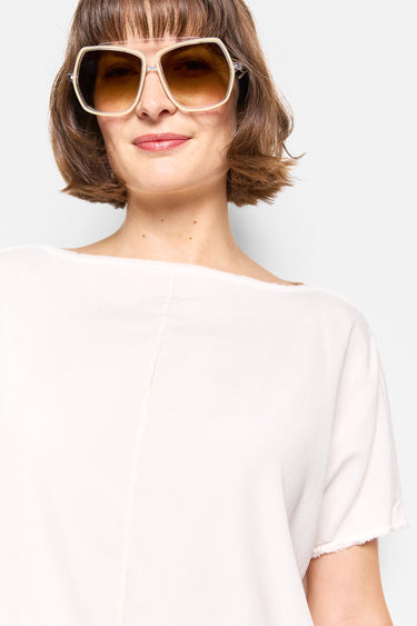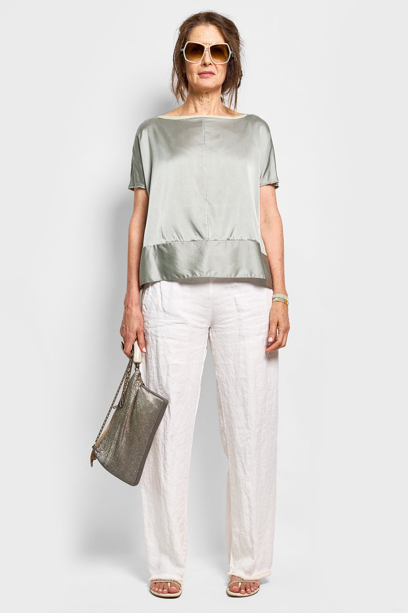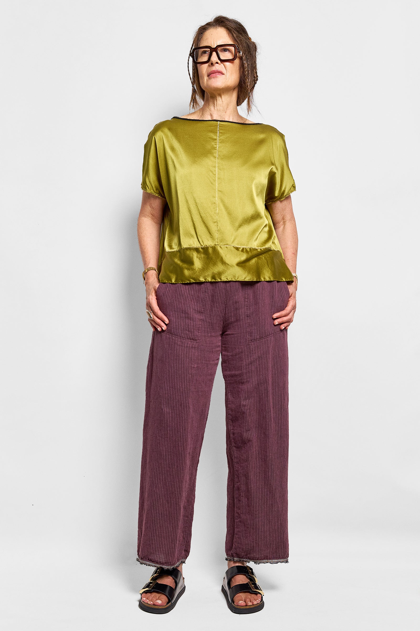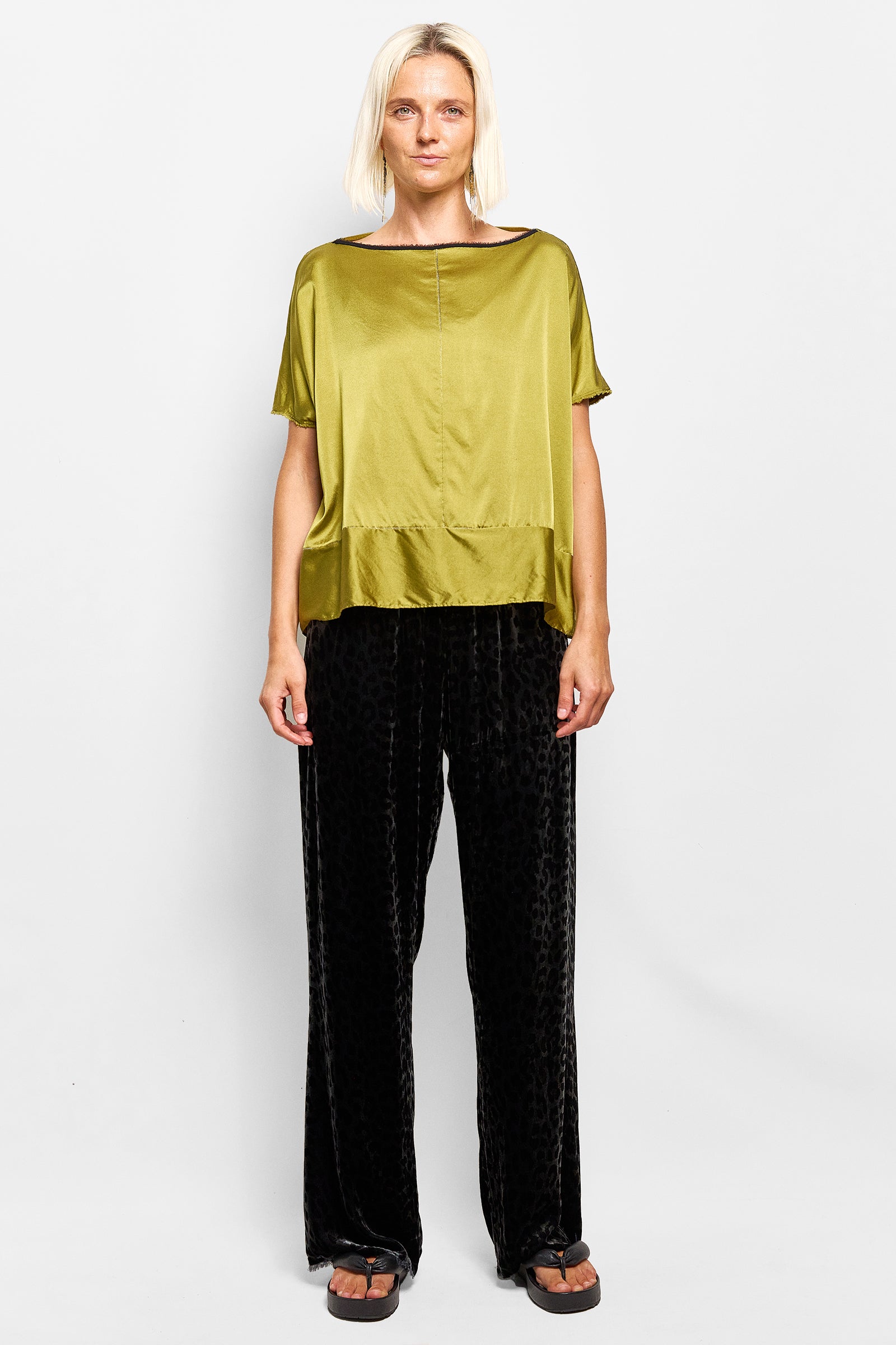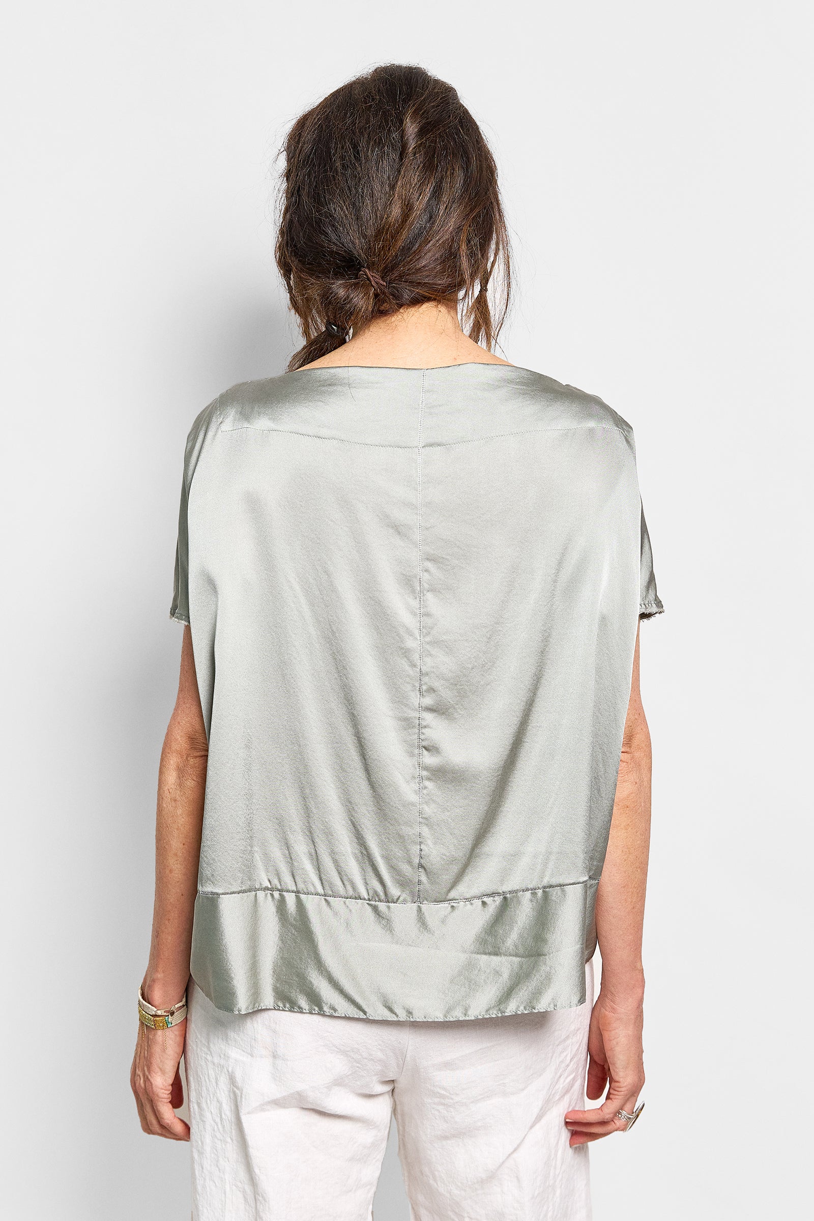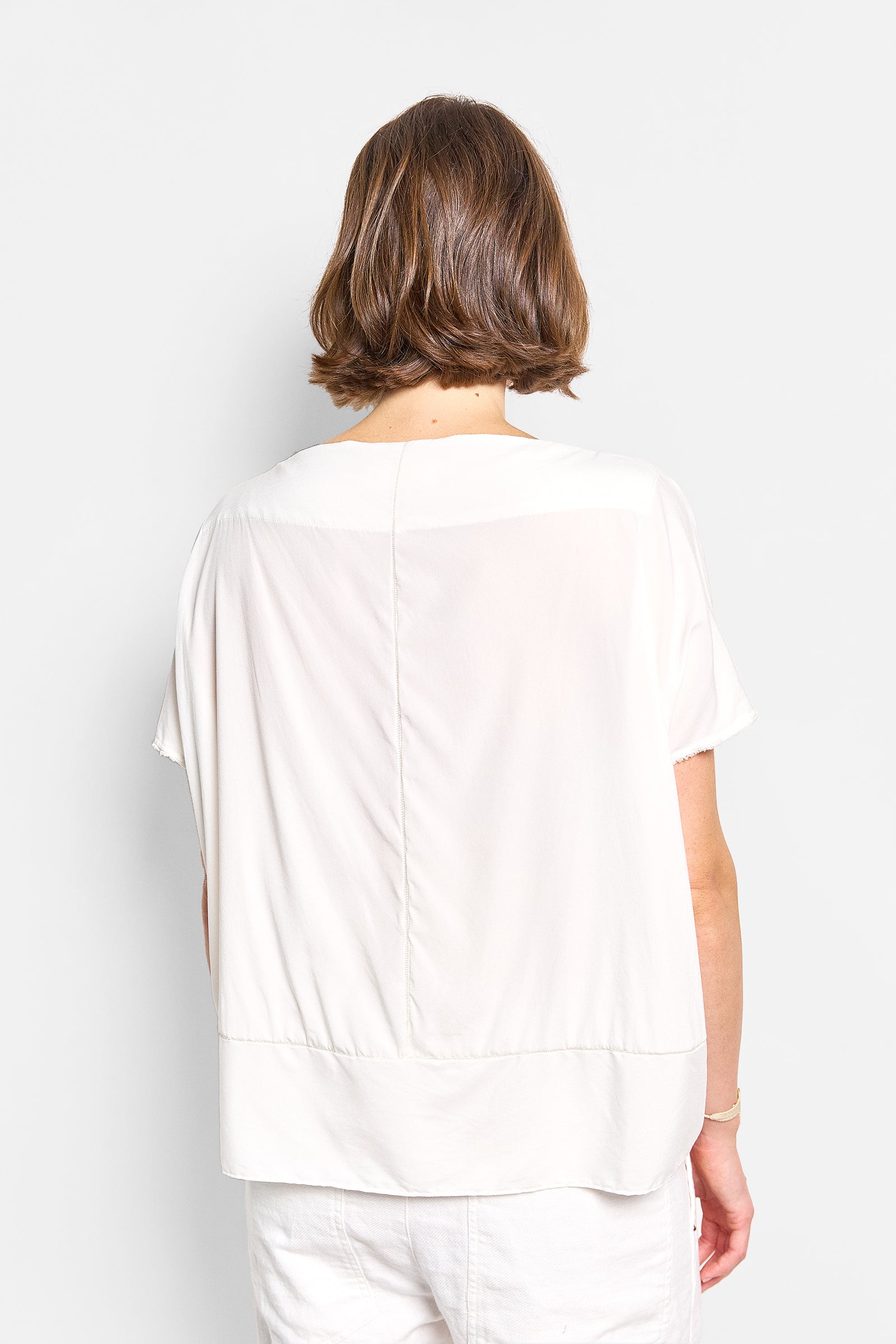 a flippy floppy tee in stretch silk satin. featuring coloured seam details and silk georgette binding that forms a gentle fray when washed. best tee for travelling as can be washed and dry by the next morning. oversized.