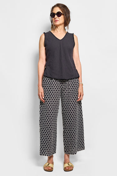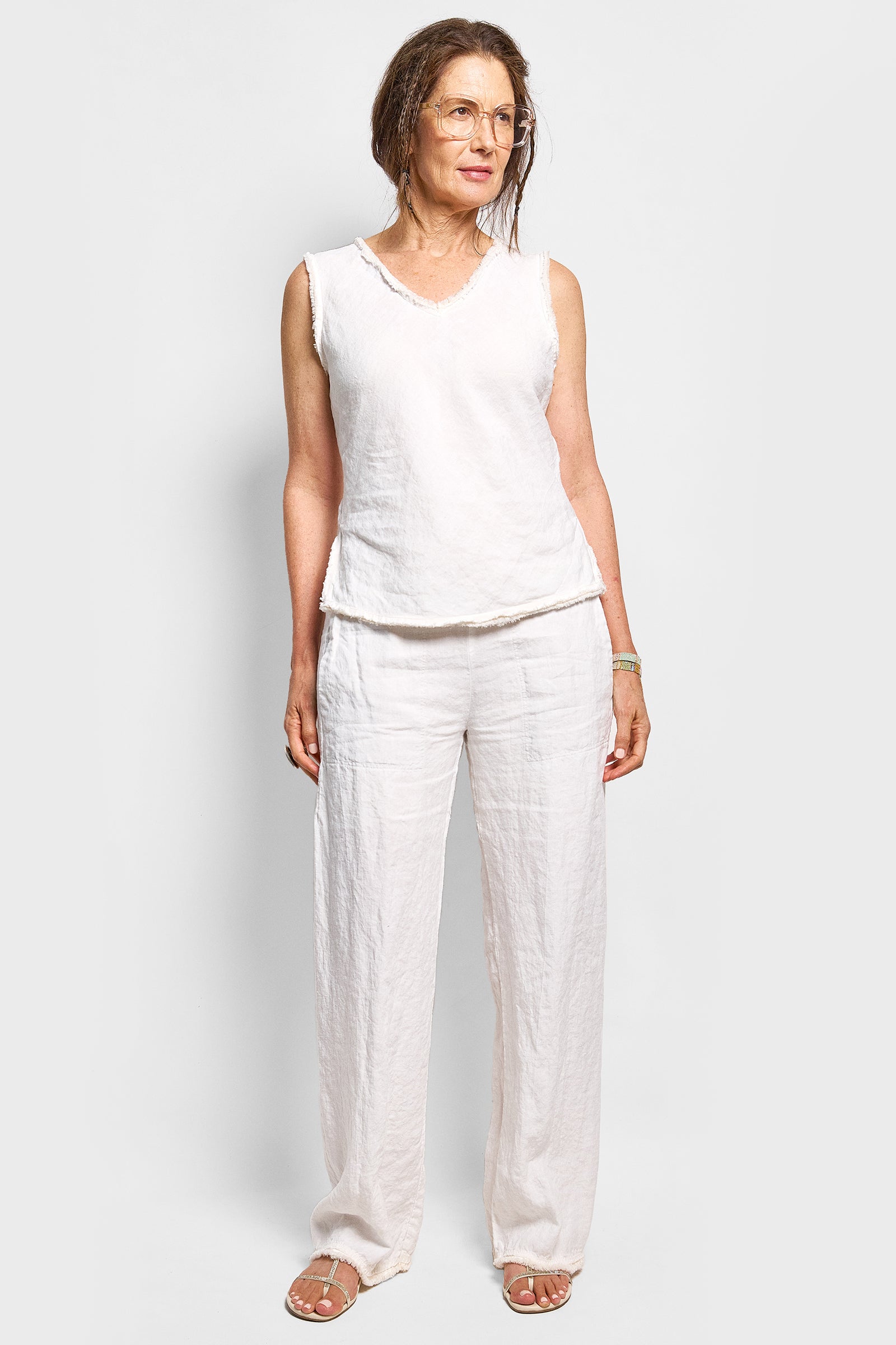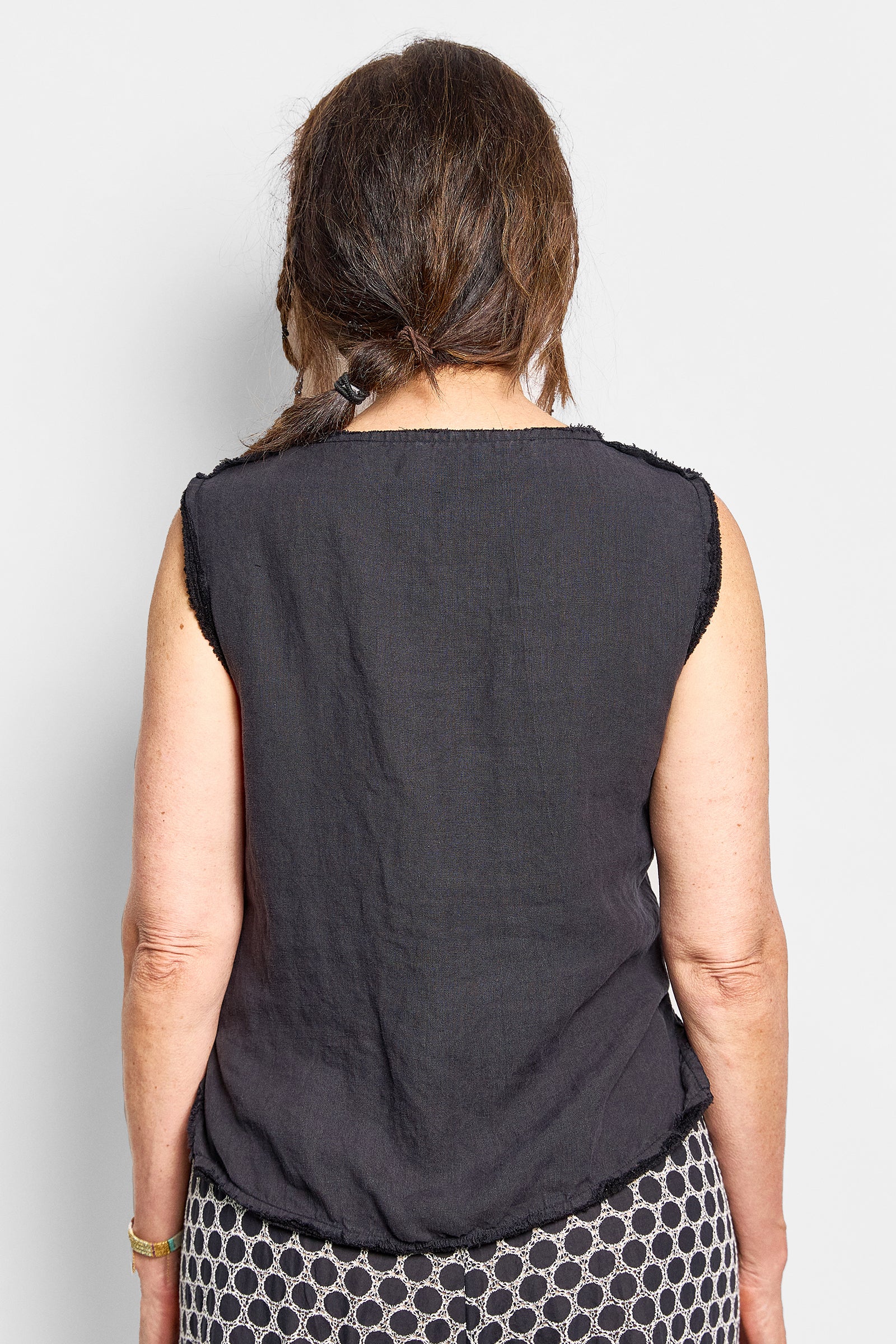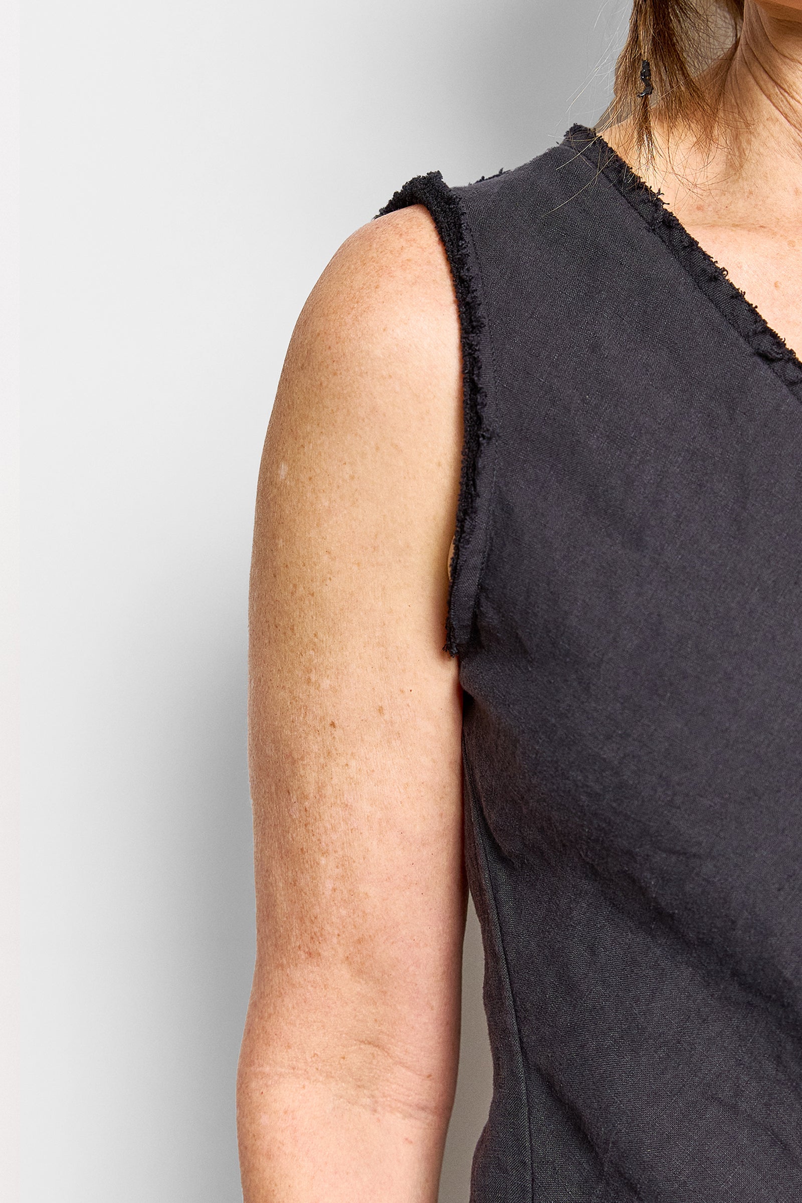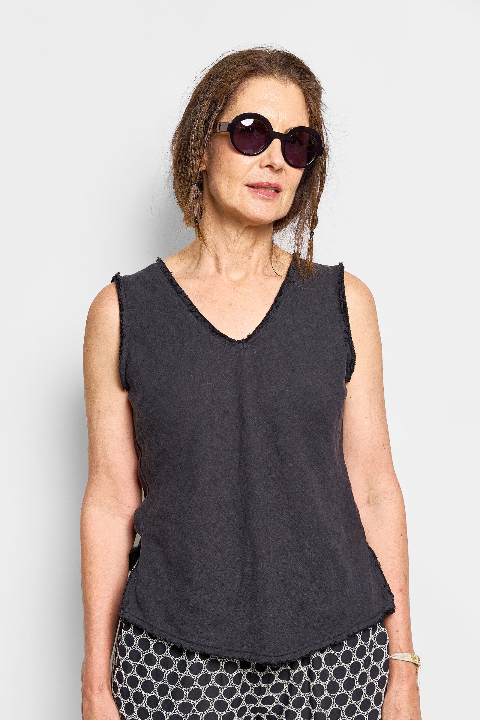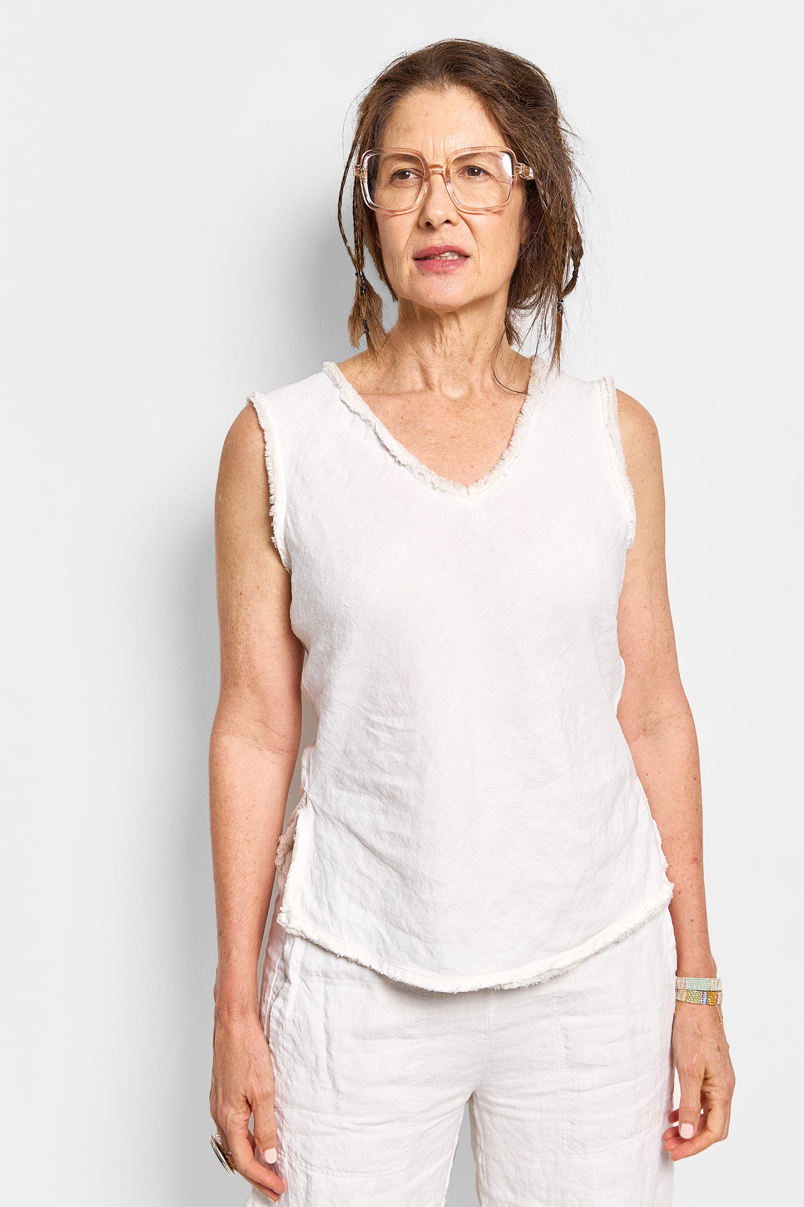 a simple hemp top. we create the interest by trimming the inside edges with satin bias that fluffs & frays in the washing process. this style has a bias cut front and a straight cut back which creates a beautiful fit. true to size.