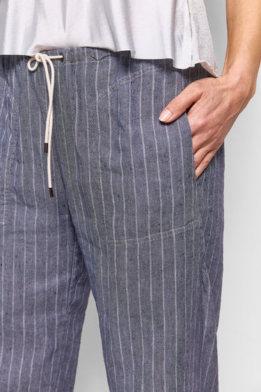 these unisex pants are cut from 100% linen. they have a drawstring waist, side pockets & are engineered without a side seam. the pants are washed to give them a soft finish. featuring our signature selvedge hem. relaxed fit.