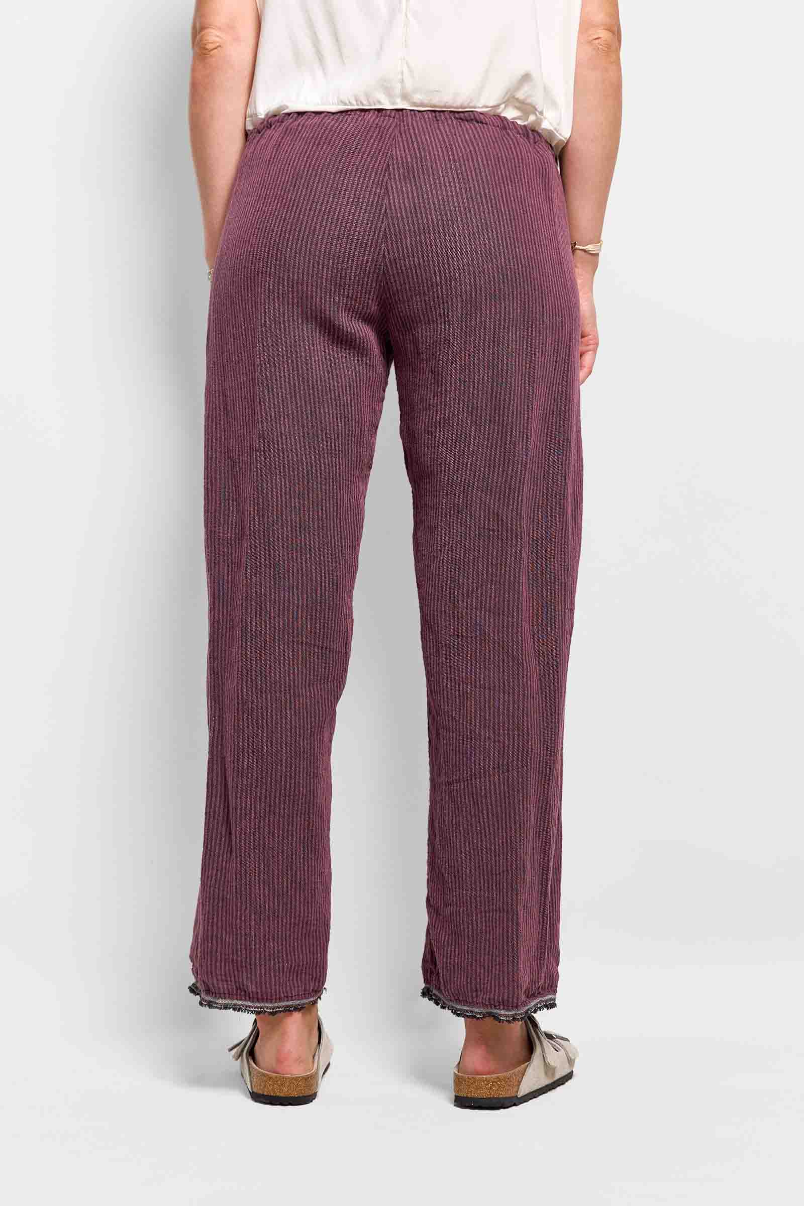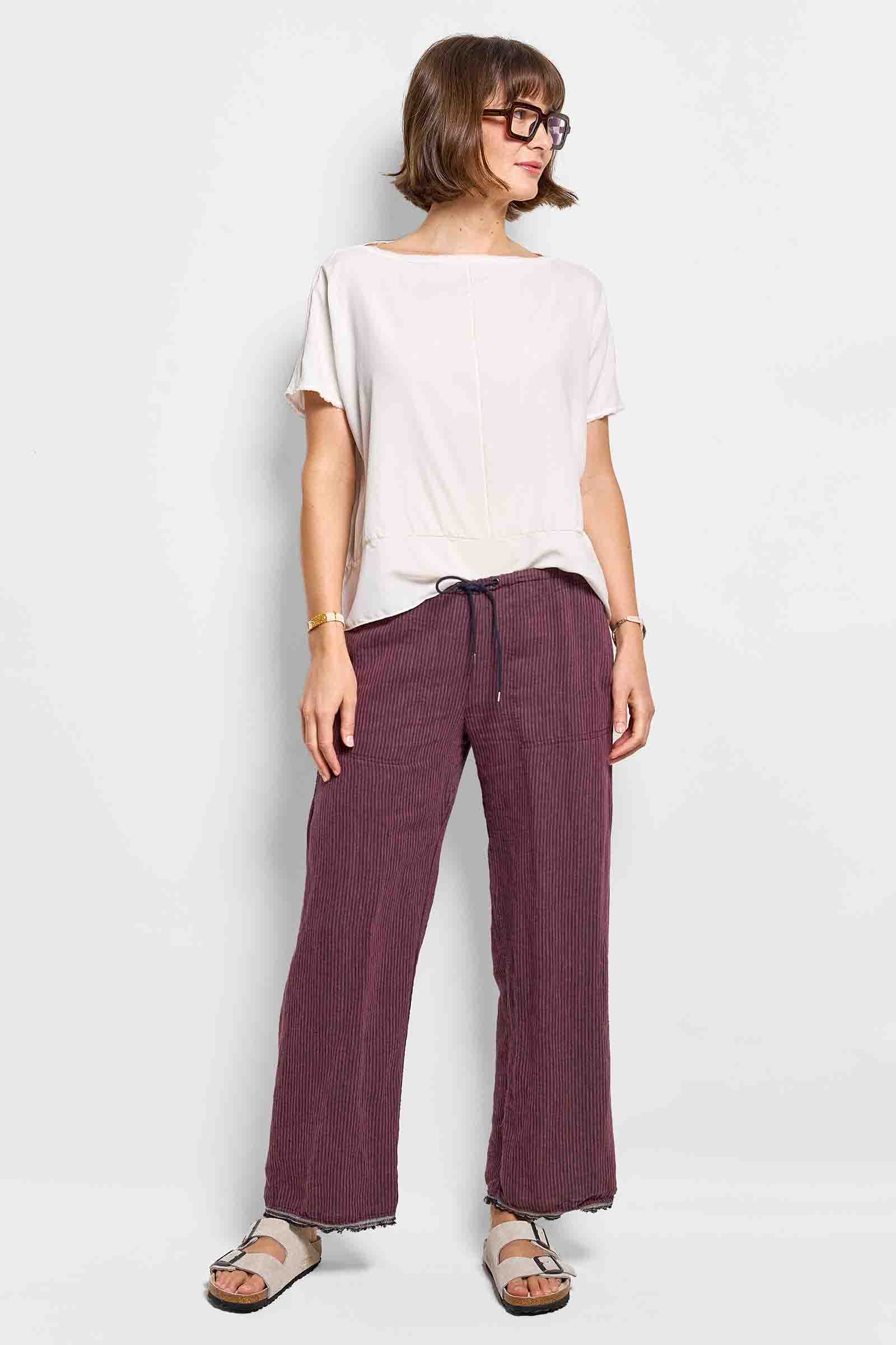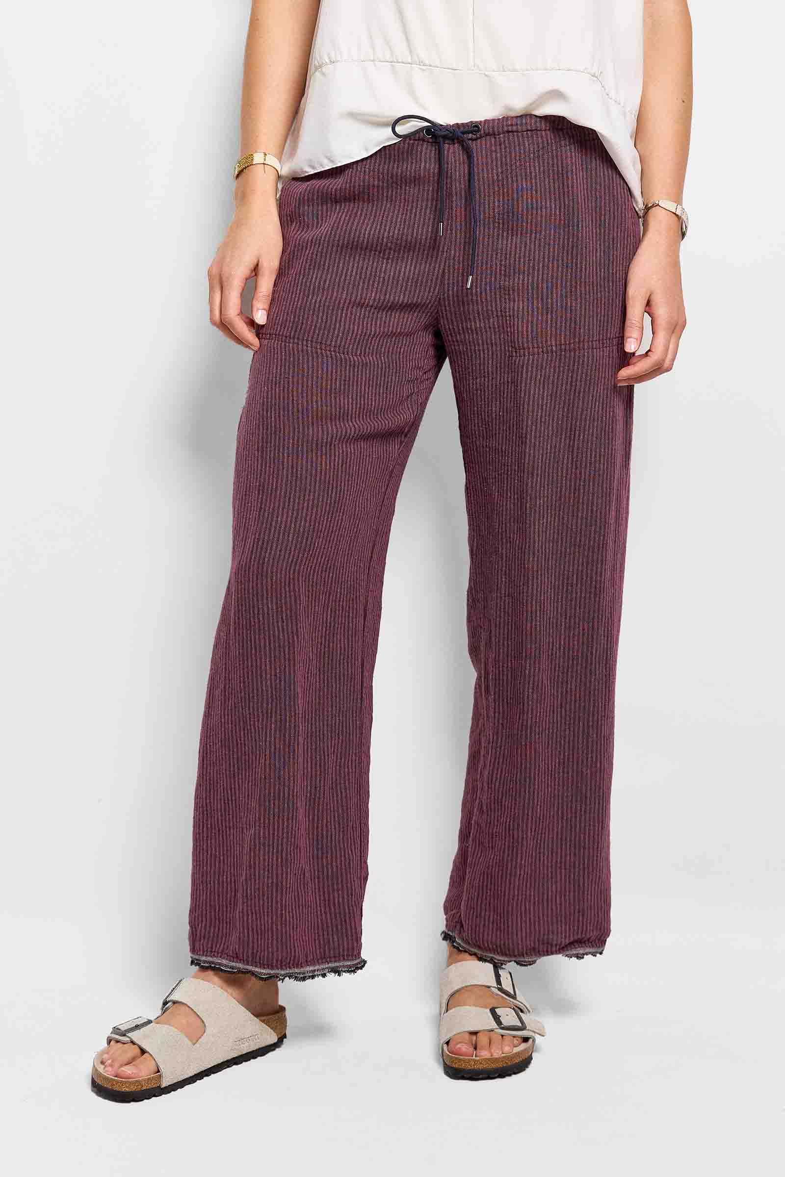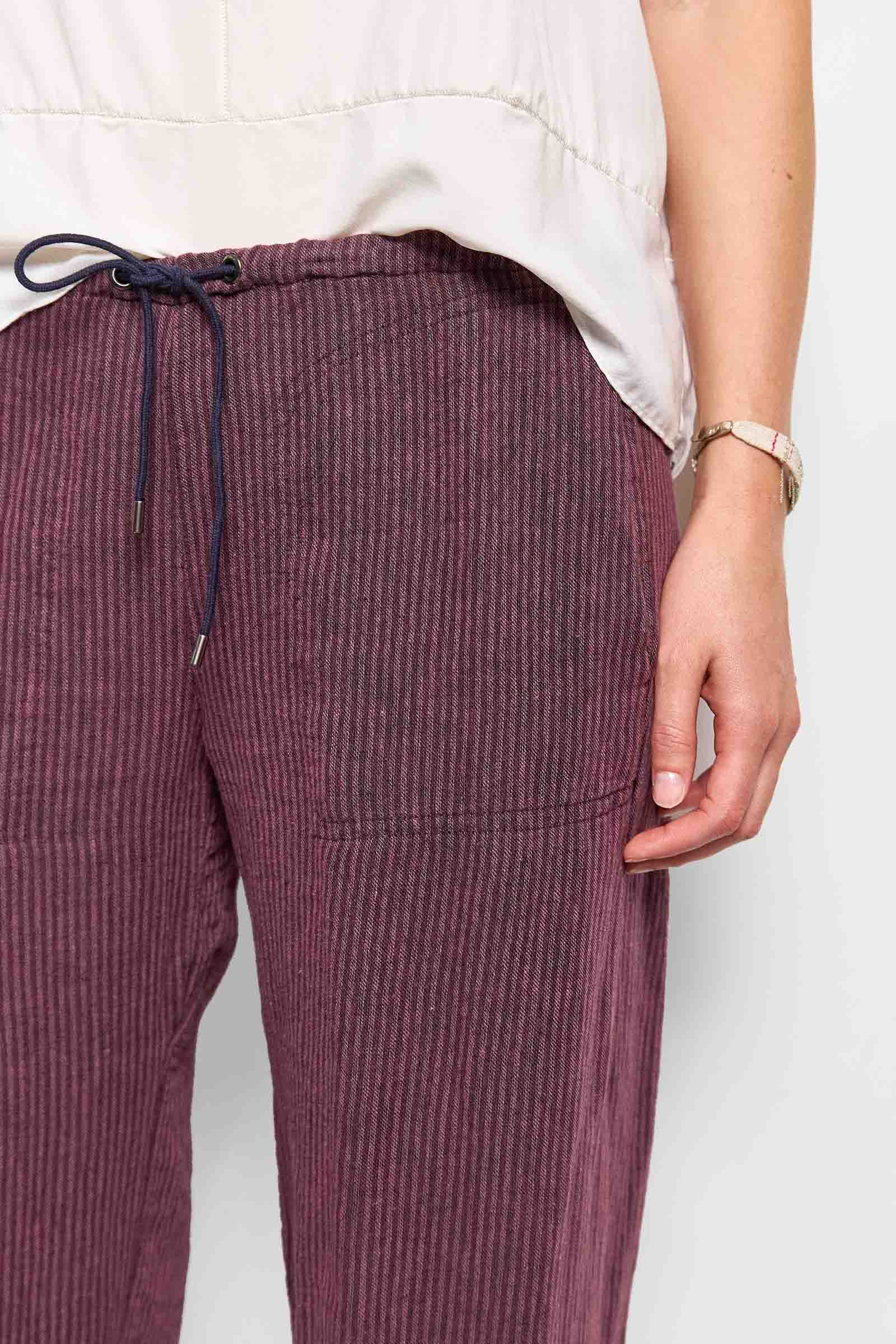 this honest pant is slightly cropped for summer and features a stripey selvedge hem. the linen is softened with a special wash. side seam pockets and a drawstring finish the details. true to size.