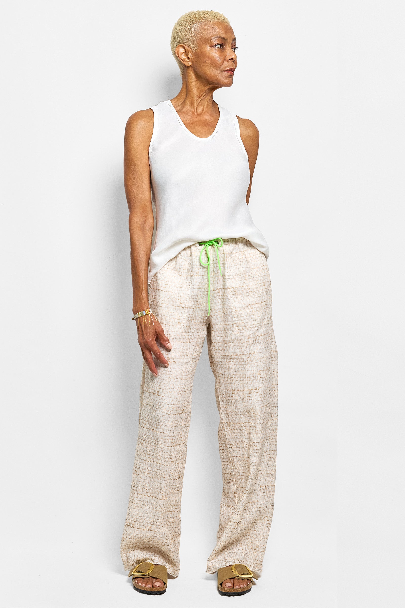 we developed a textured weave from strips of fabric & selvedges and printed it on linen. this is our classic elastic waist linen pant. side seam pockets and a drawstring feature. true to size.