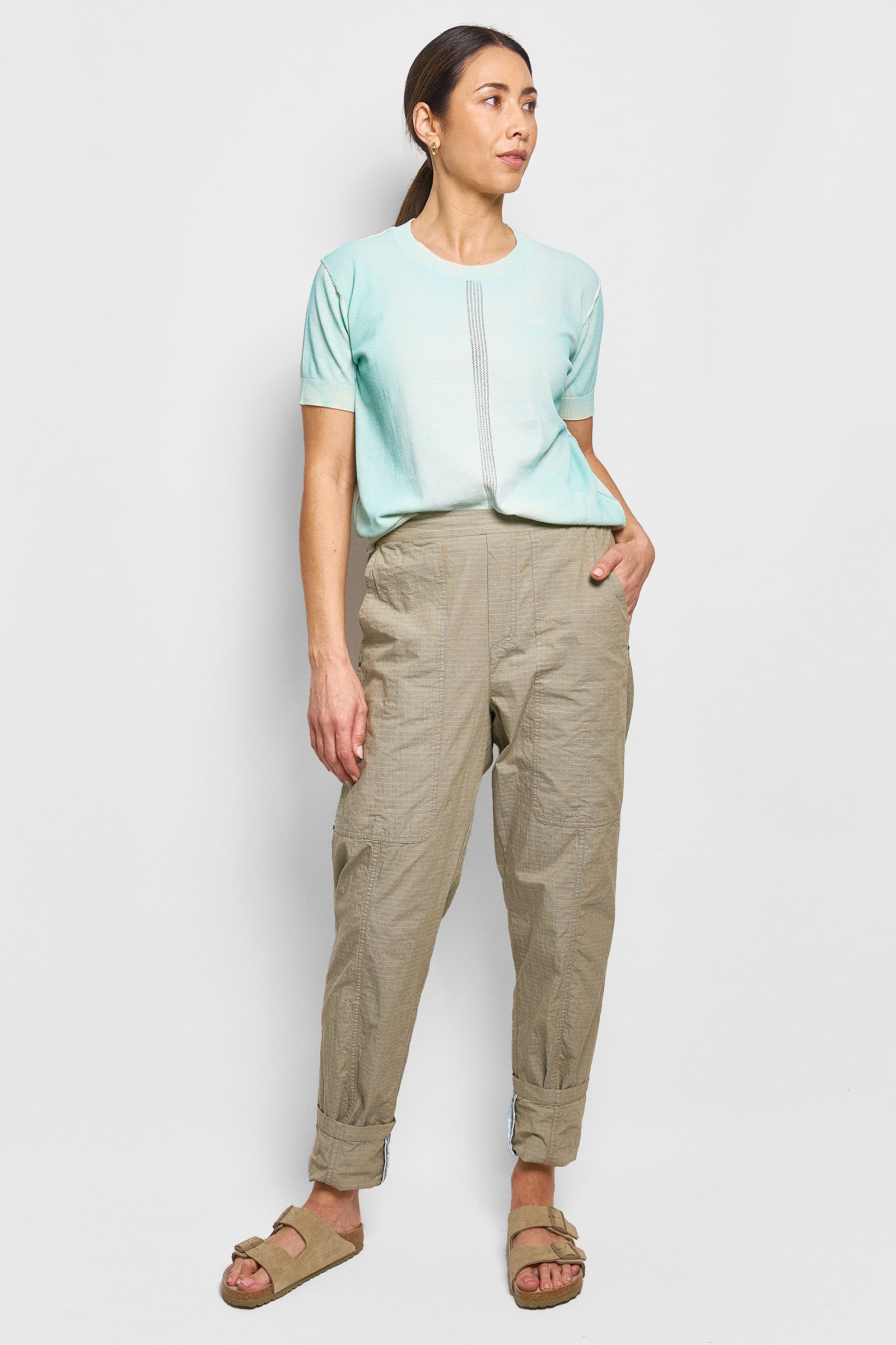 isak is unisex pant made in a lightweight self check cotton. featuring a flat front waistband with a pocket opening and an elastic back. slightly tapered at the ankle, wear these pants full length or roll for a crop finished with deep pockets and rivets. true to size. size up for a baggy fit. size down for a slim fit.