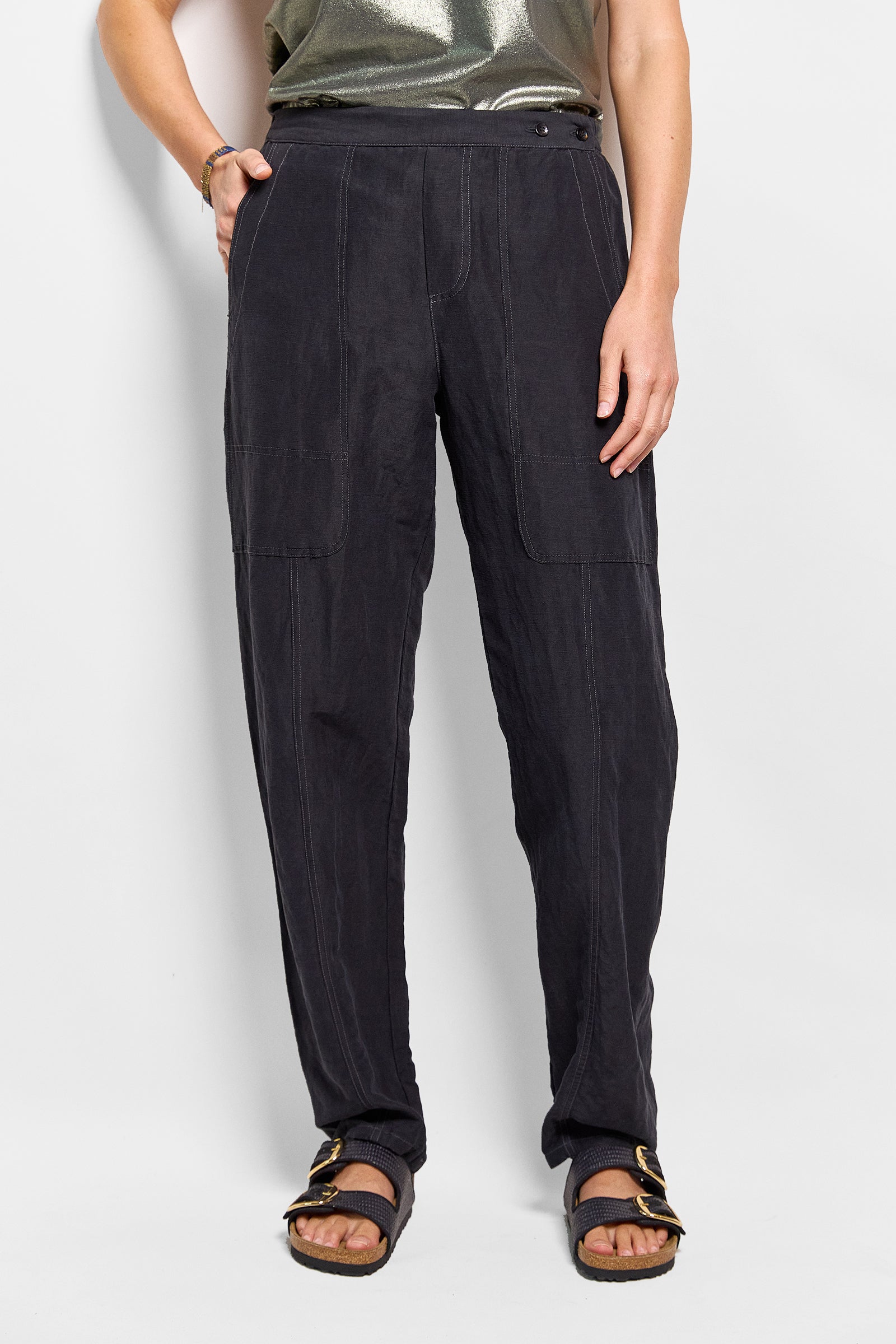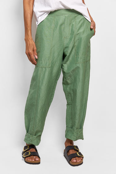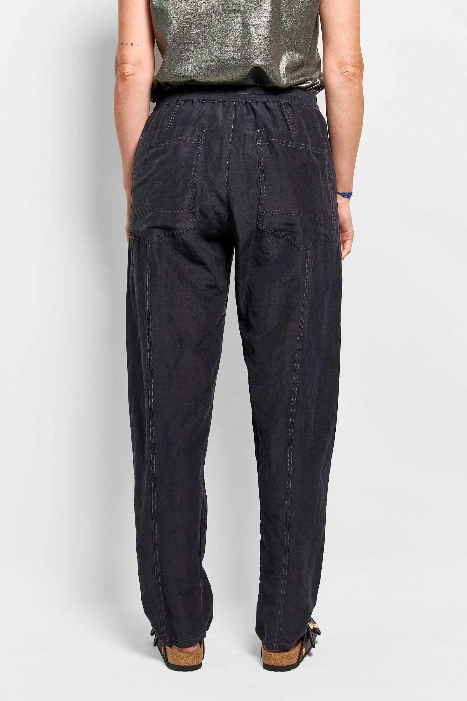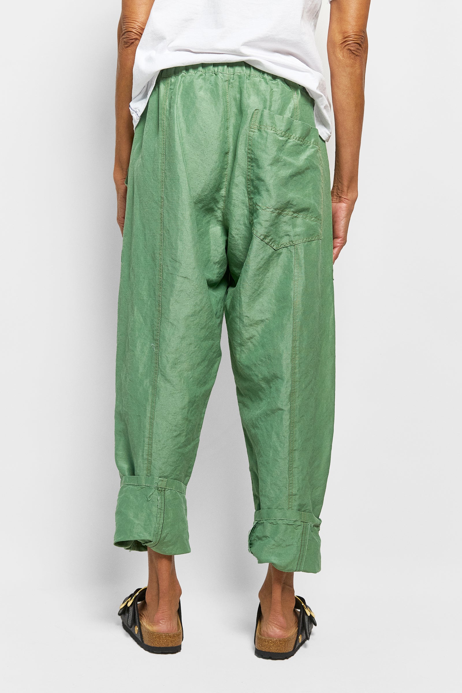 our best selling isak pant featured in a beautiful, lightweight blend of silk and linen. these unisex pants featuring deep pockets, rivets, a flat front waistband that opens up on one side & an elastic back. supremely comfortable in fit & tapered slightly at the ankle. wear them full length or roll the hem. true to size. size up for a baggy fit. size down for a slim fit.