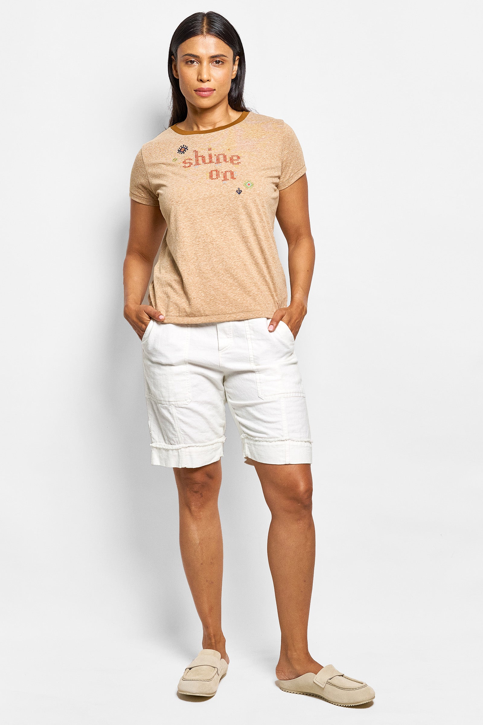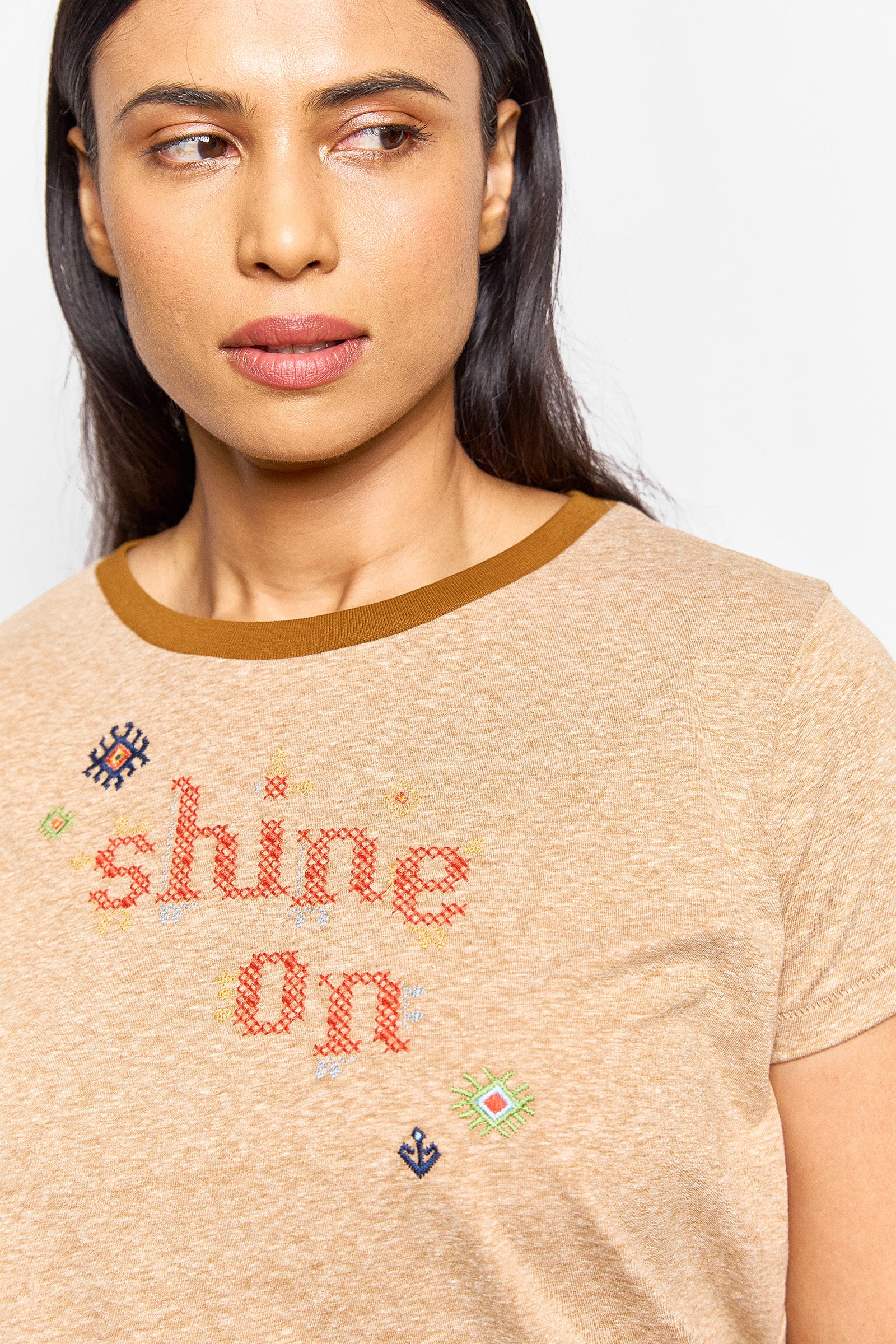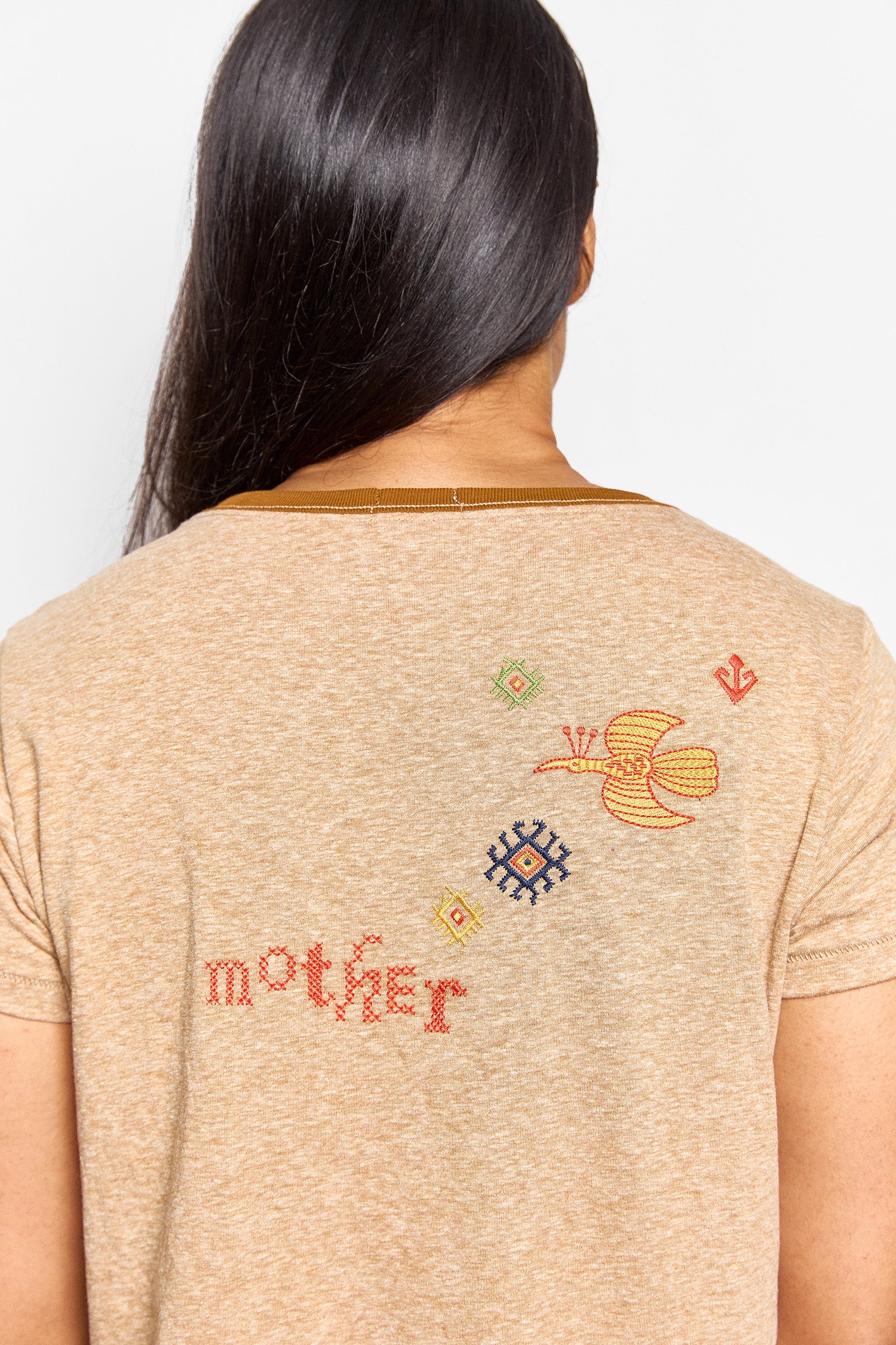 a soft crew neck tee in heathered tan. a slim fit featuring a brown trim and colourful embroidery throughout.