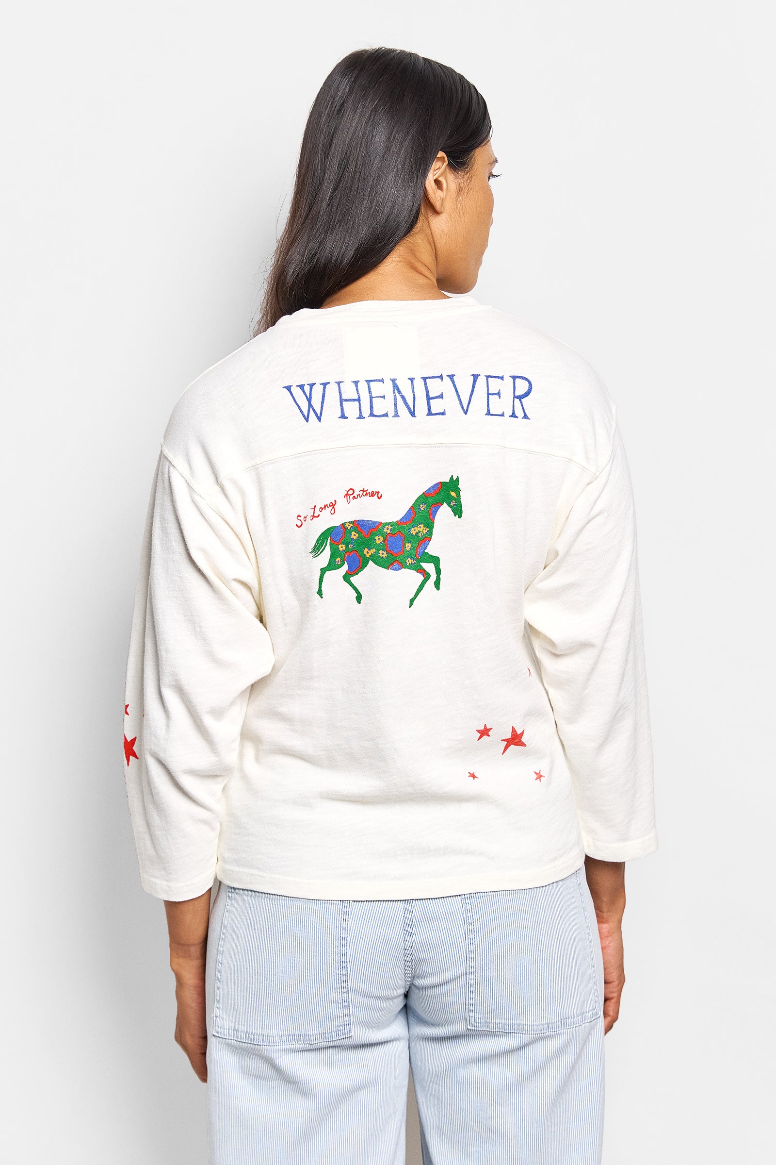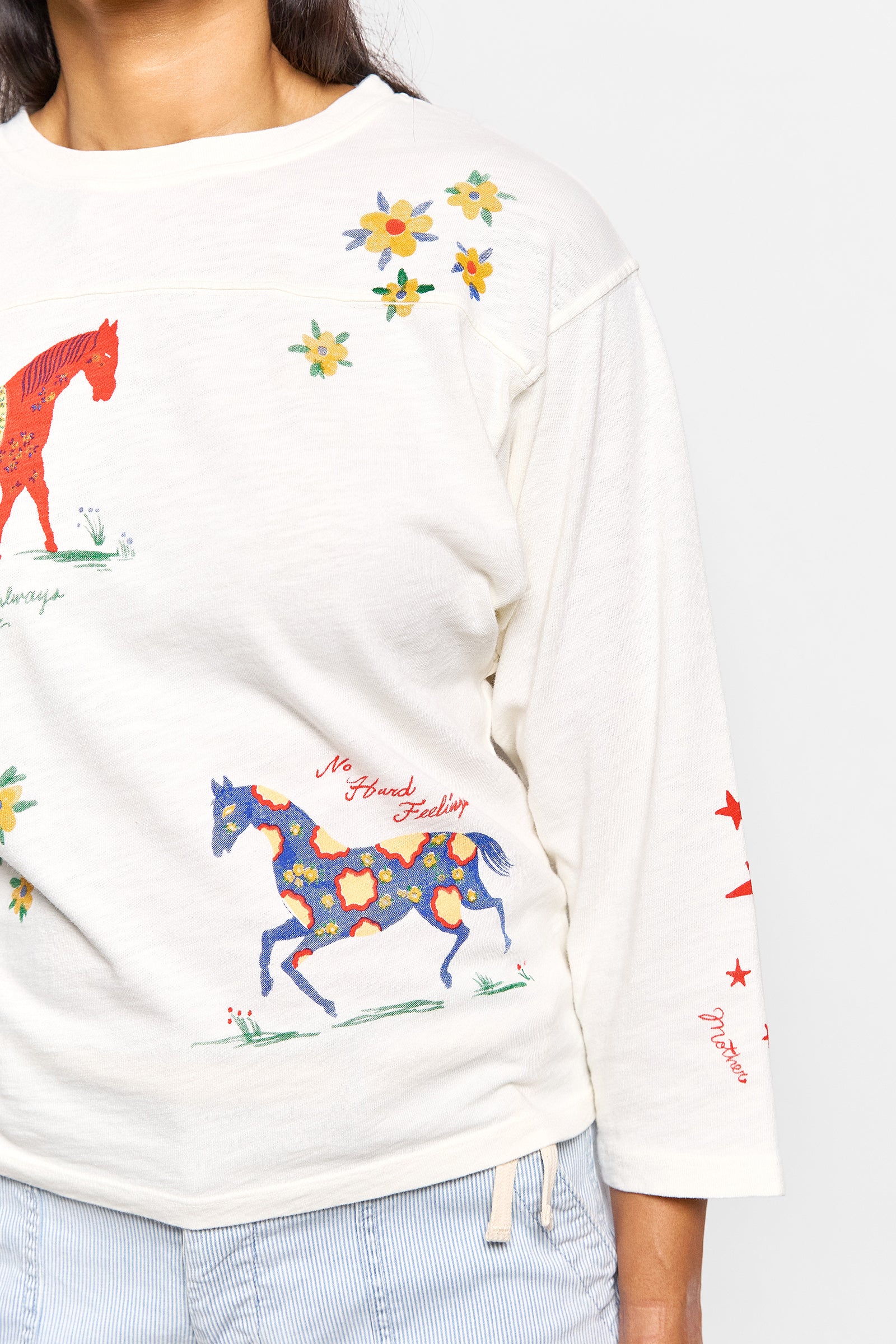 inspired by a football jersey, this oversized crewneck tee is designed with drop shoulders, 3/4 sleeves and a boxy fit