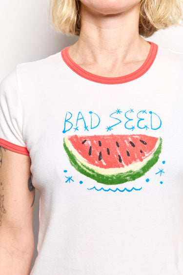 A shrunken crewneck tee with extra-short sleeves and a cropped hem. Made from 100% cotton in white with a faded red trim and watermelon graphic on the front. Perfect with high waisted denim.