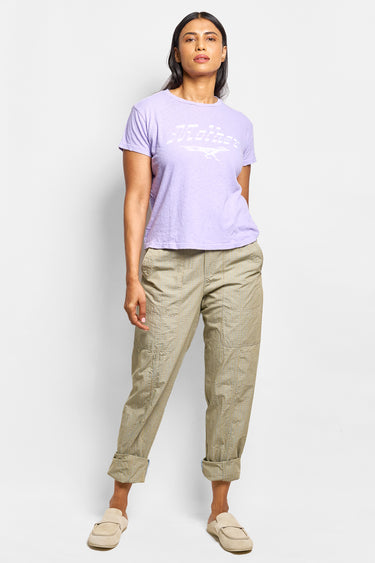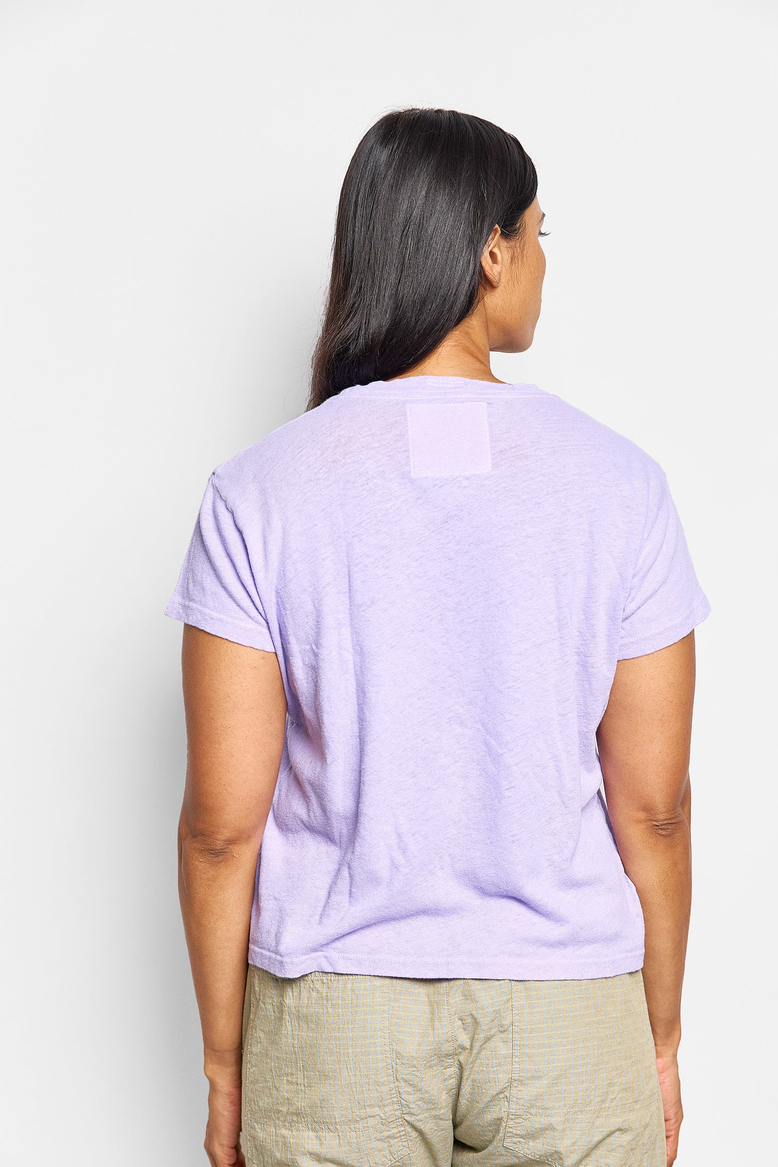 a soft crew neck tee with a slim fit for a vintage look and feel. Made from a SUPERIOR blend of cotton and linen in lavender.