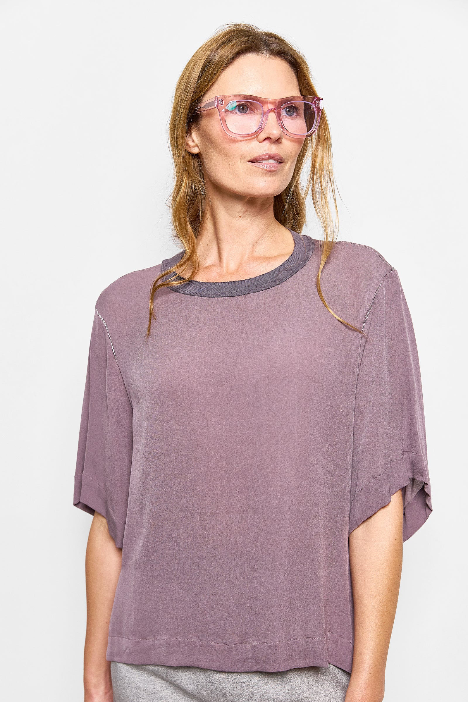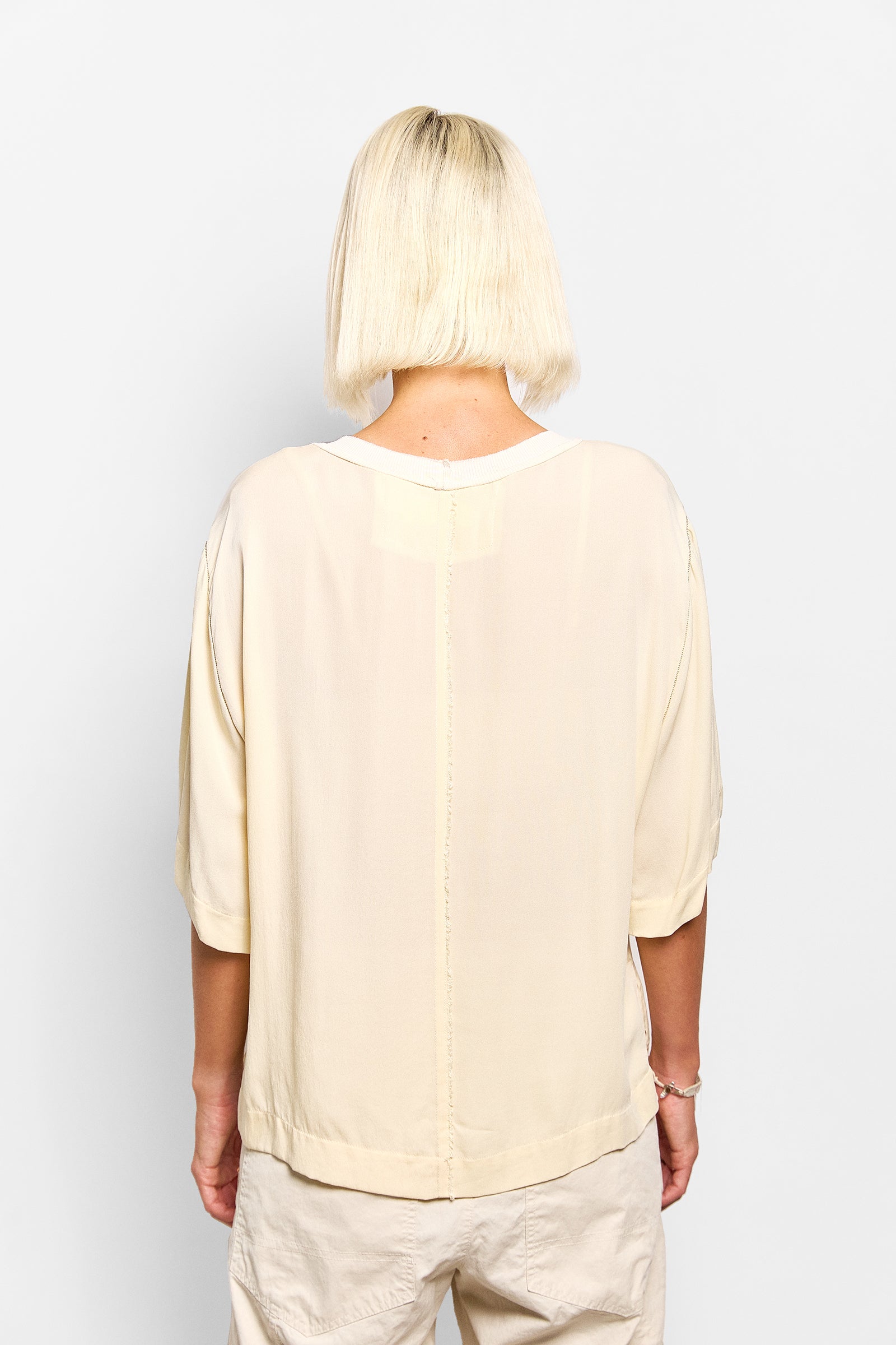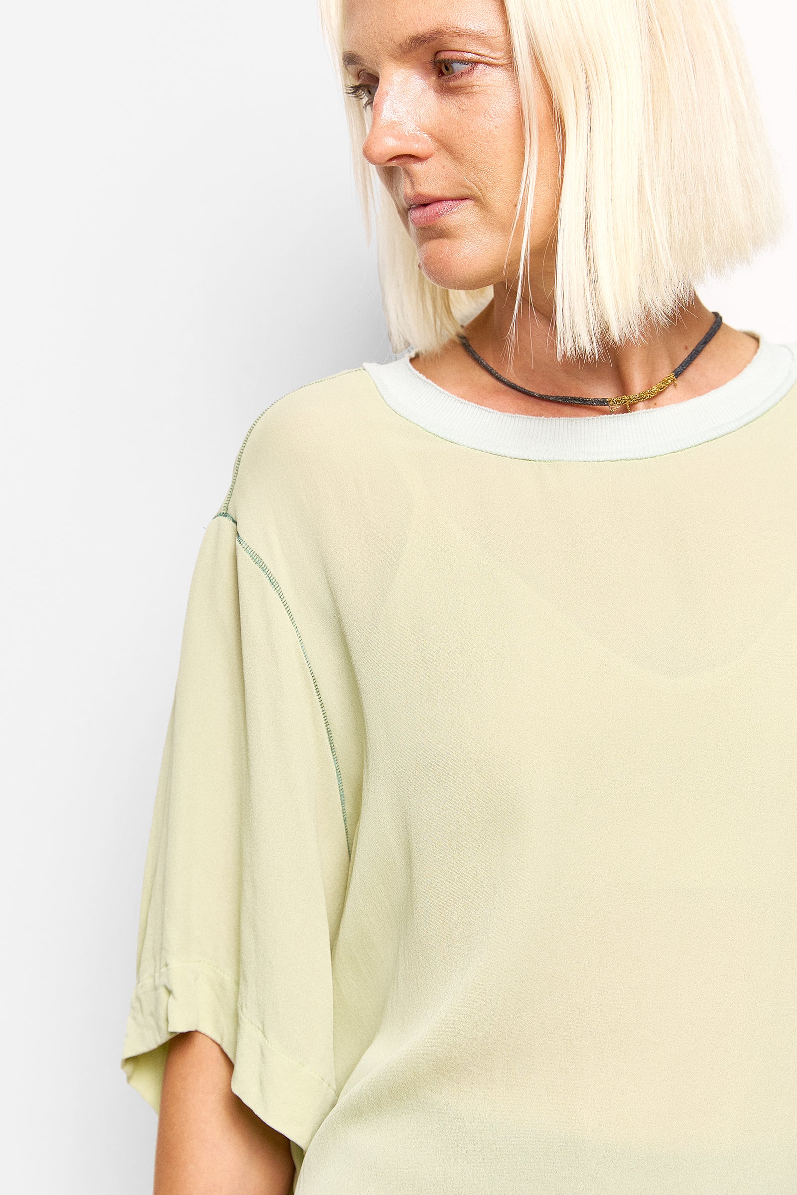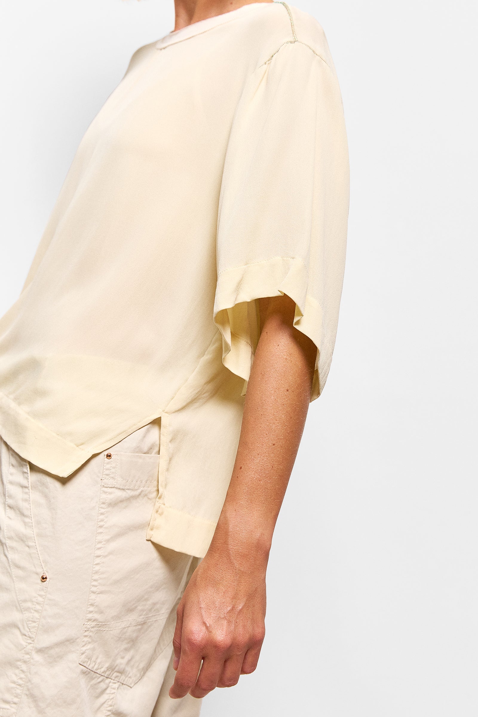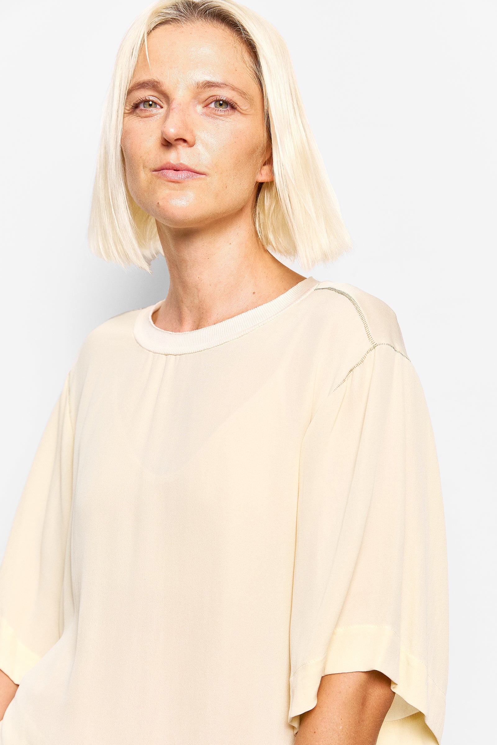a simple tee with extra-long-short sleeves which drape over your shoulders. made of a lightweight silk double georgette and finished with metallic stitching and a cotton rib collar. generous fit.