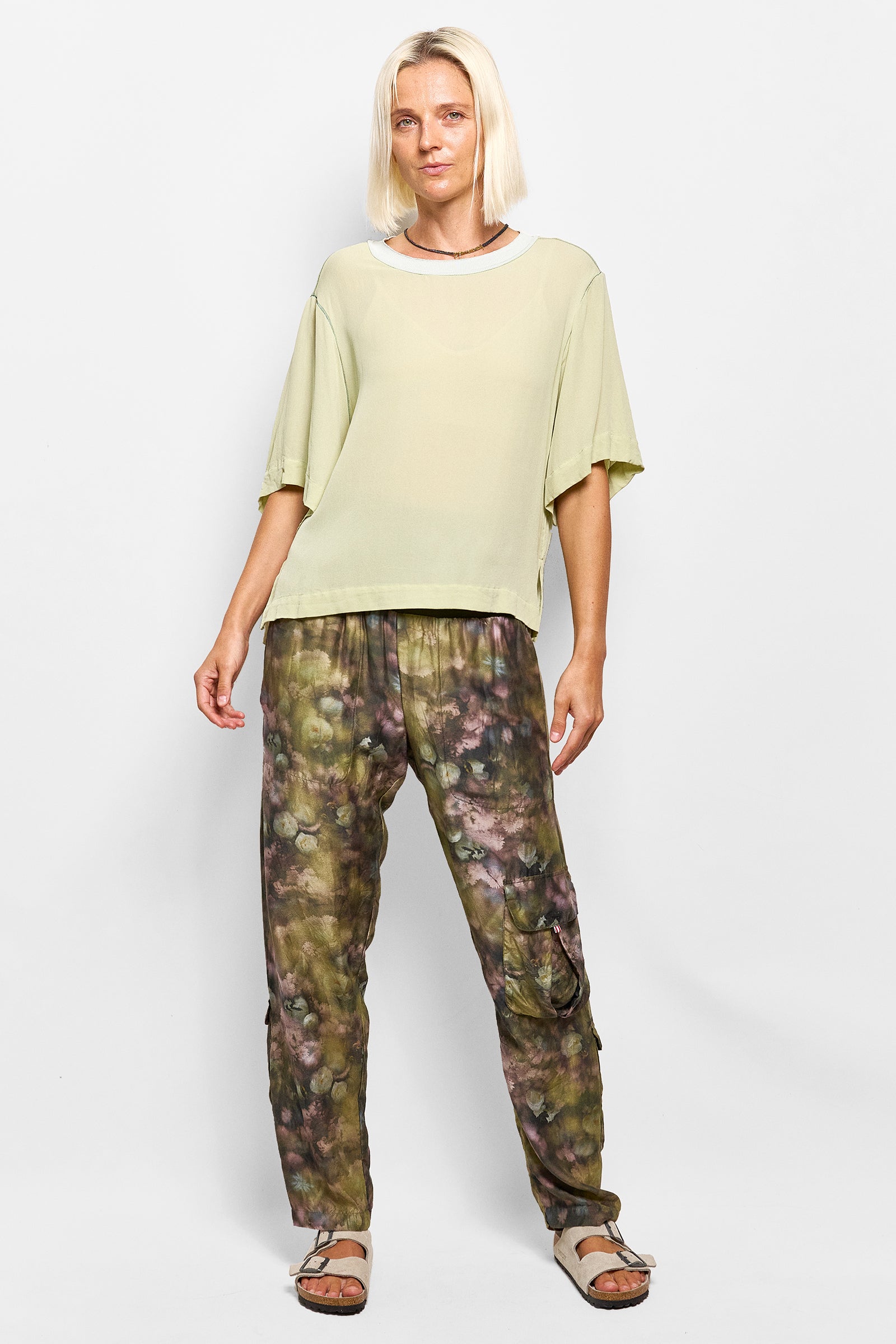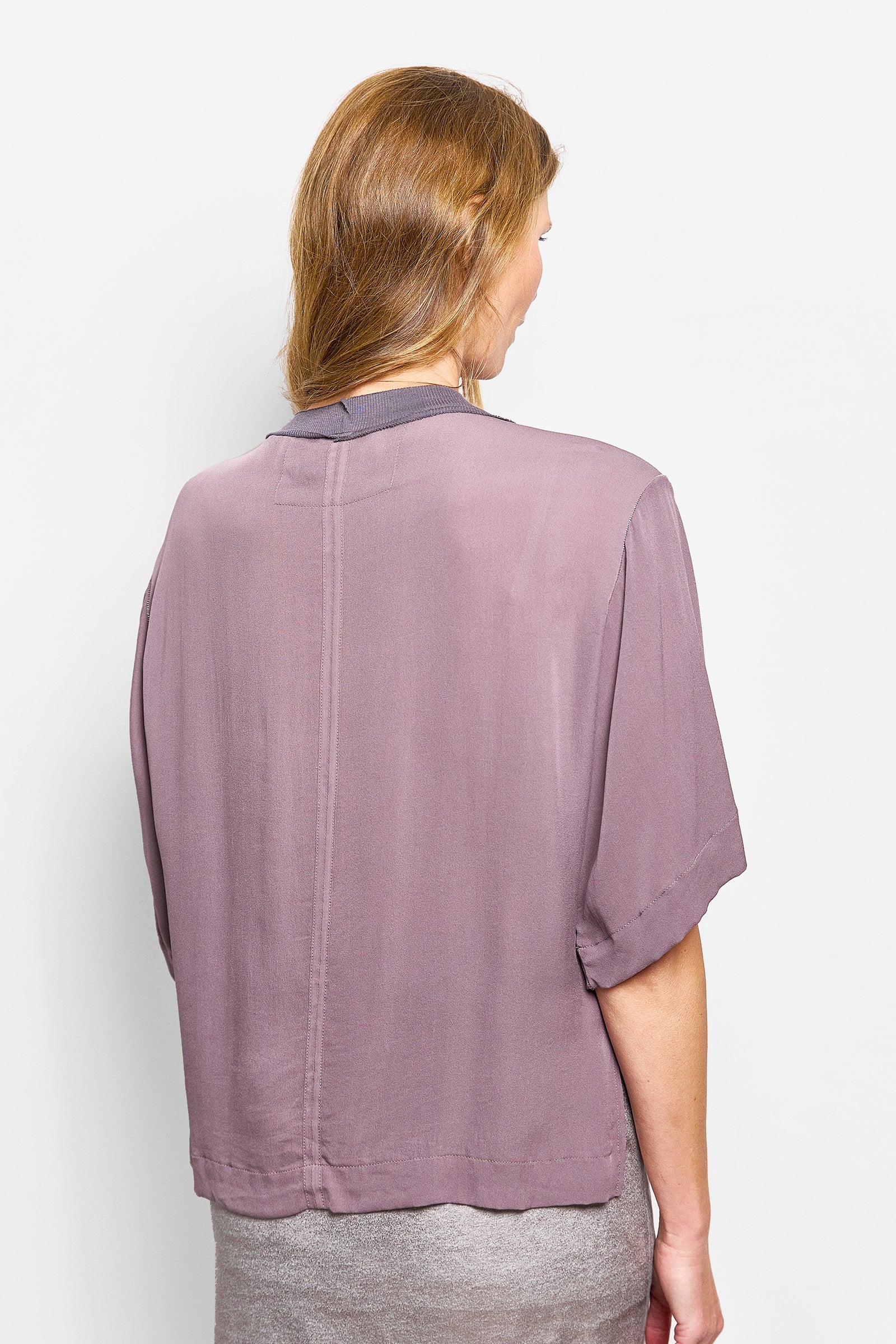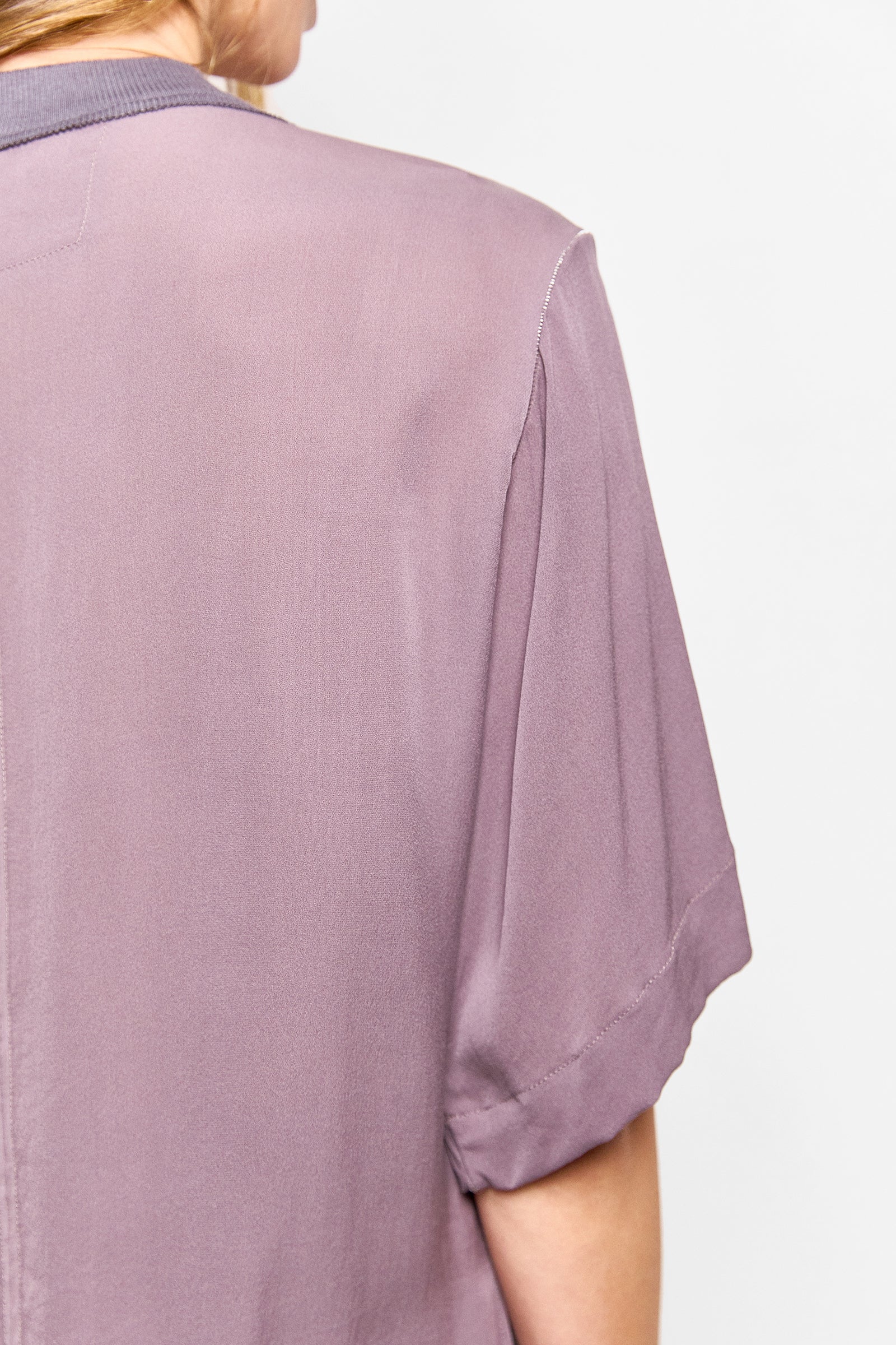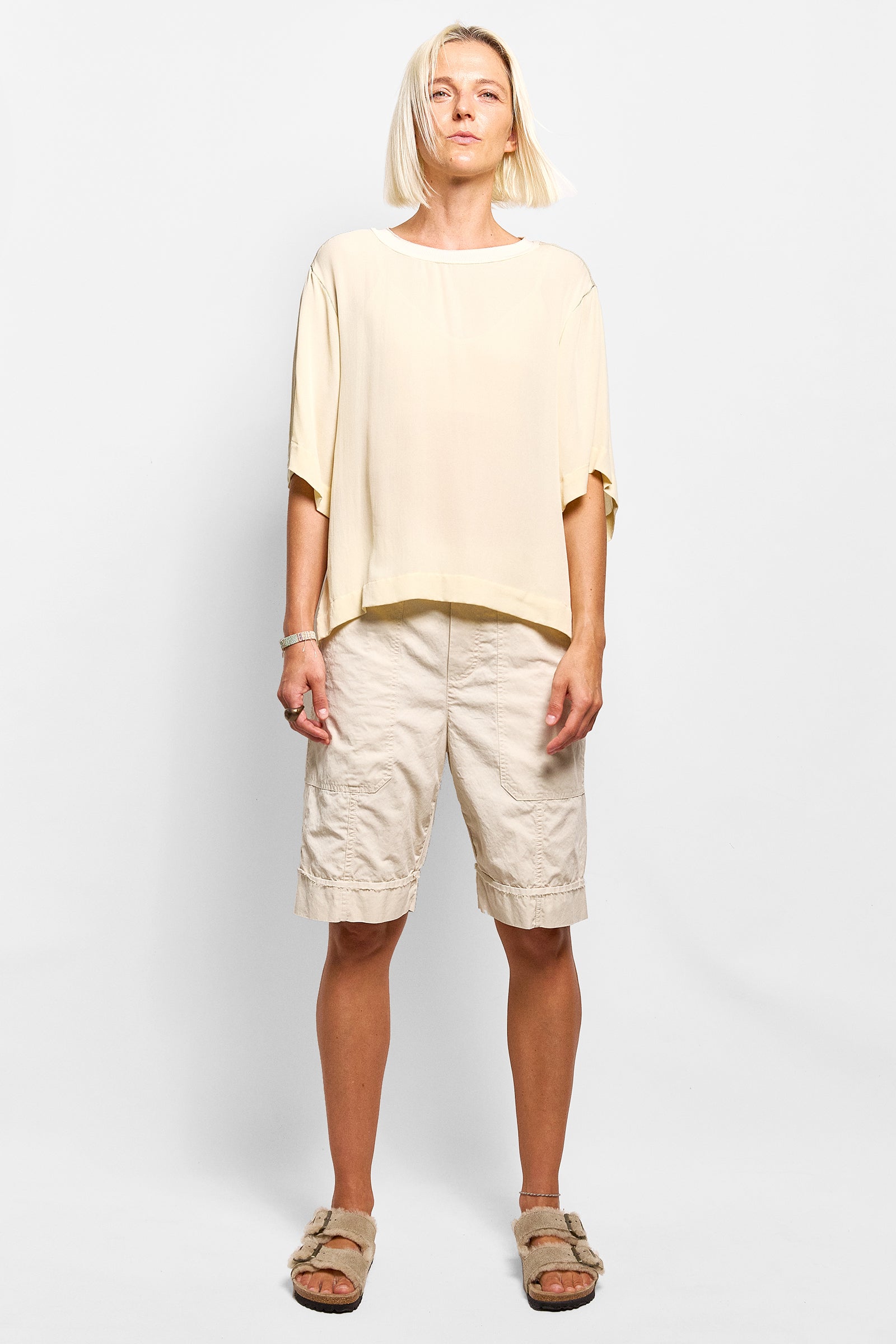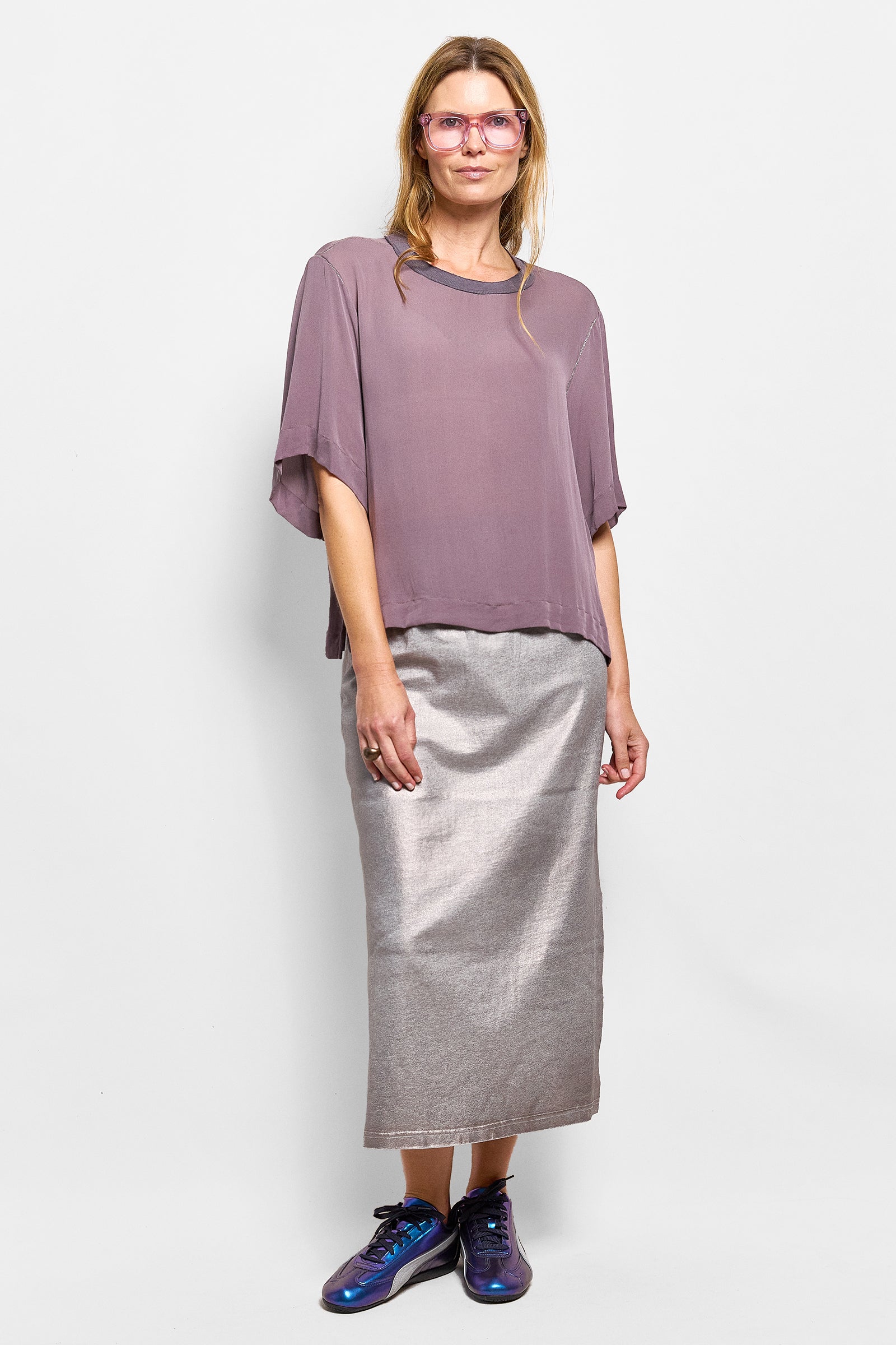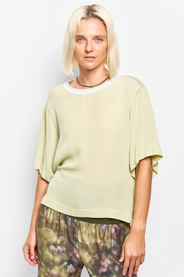 a simple tee with extra-long-short sleeves which drape over your shoulders. made of a lightweight silk double georgette and finished with metallic stitching and a cotton rib collar. generous fit.