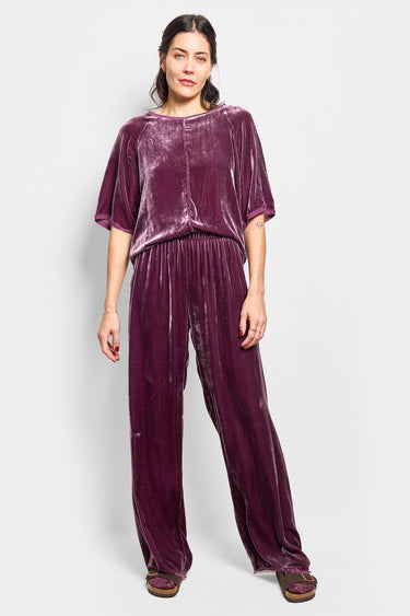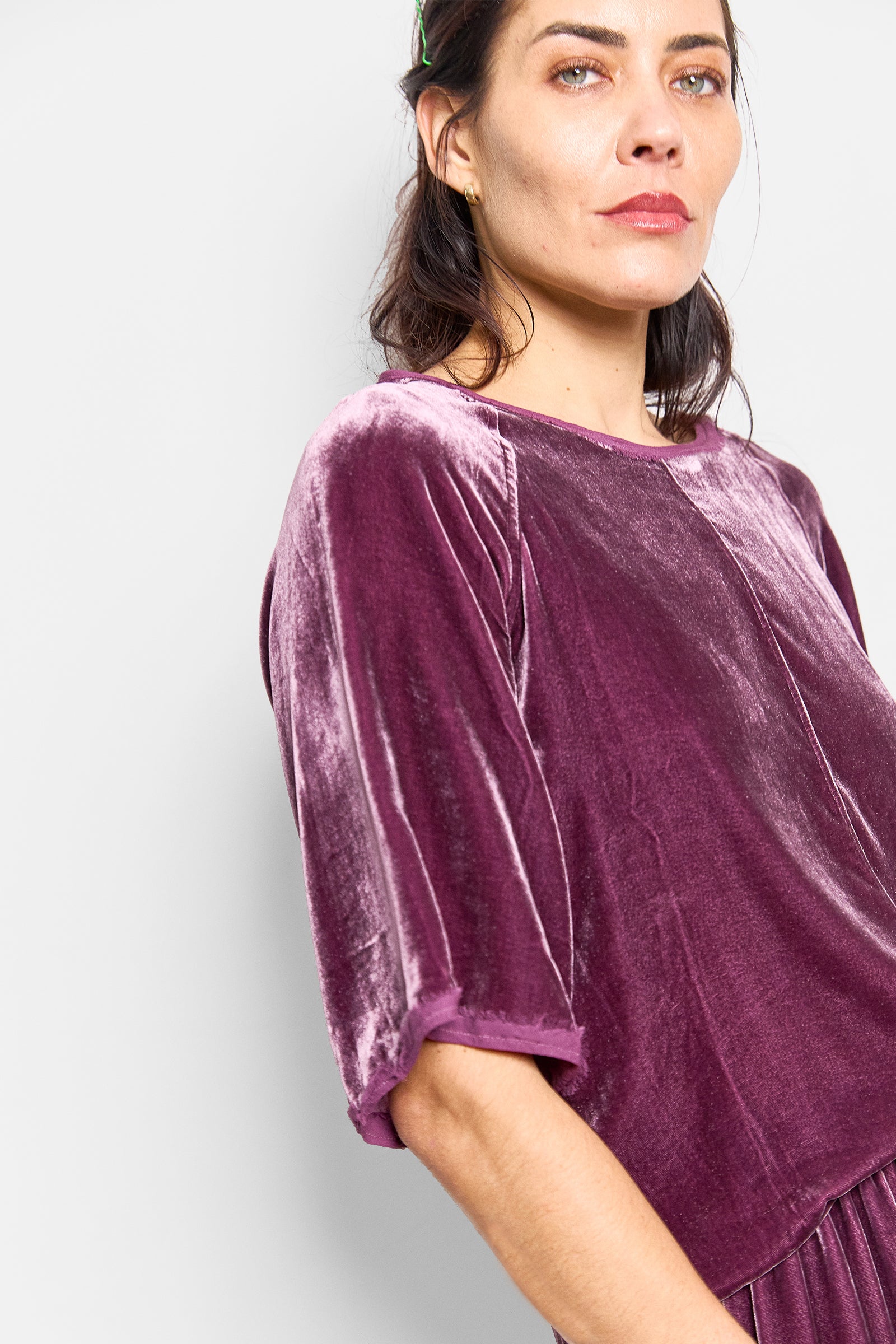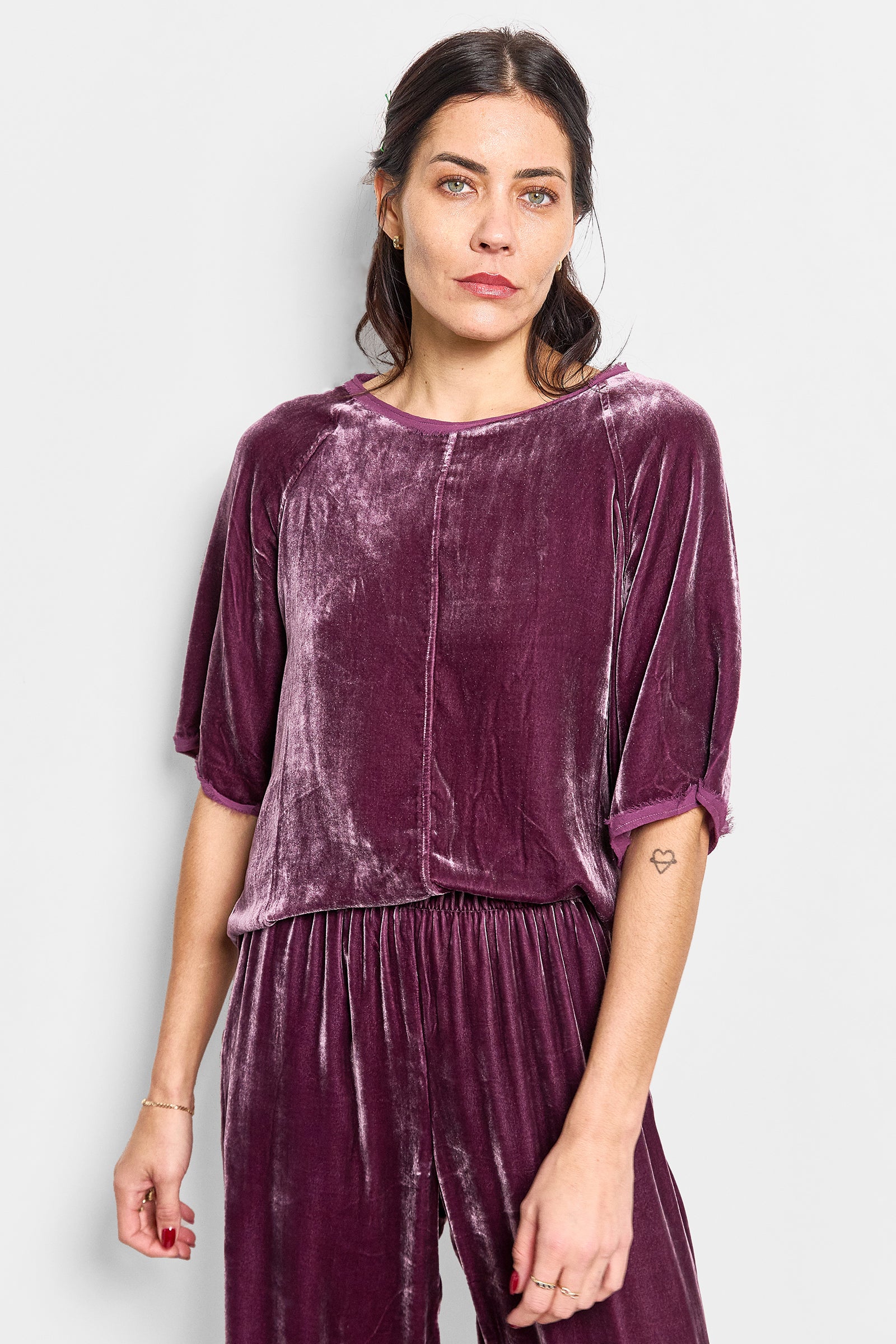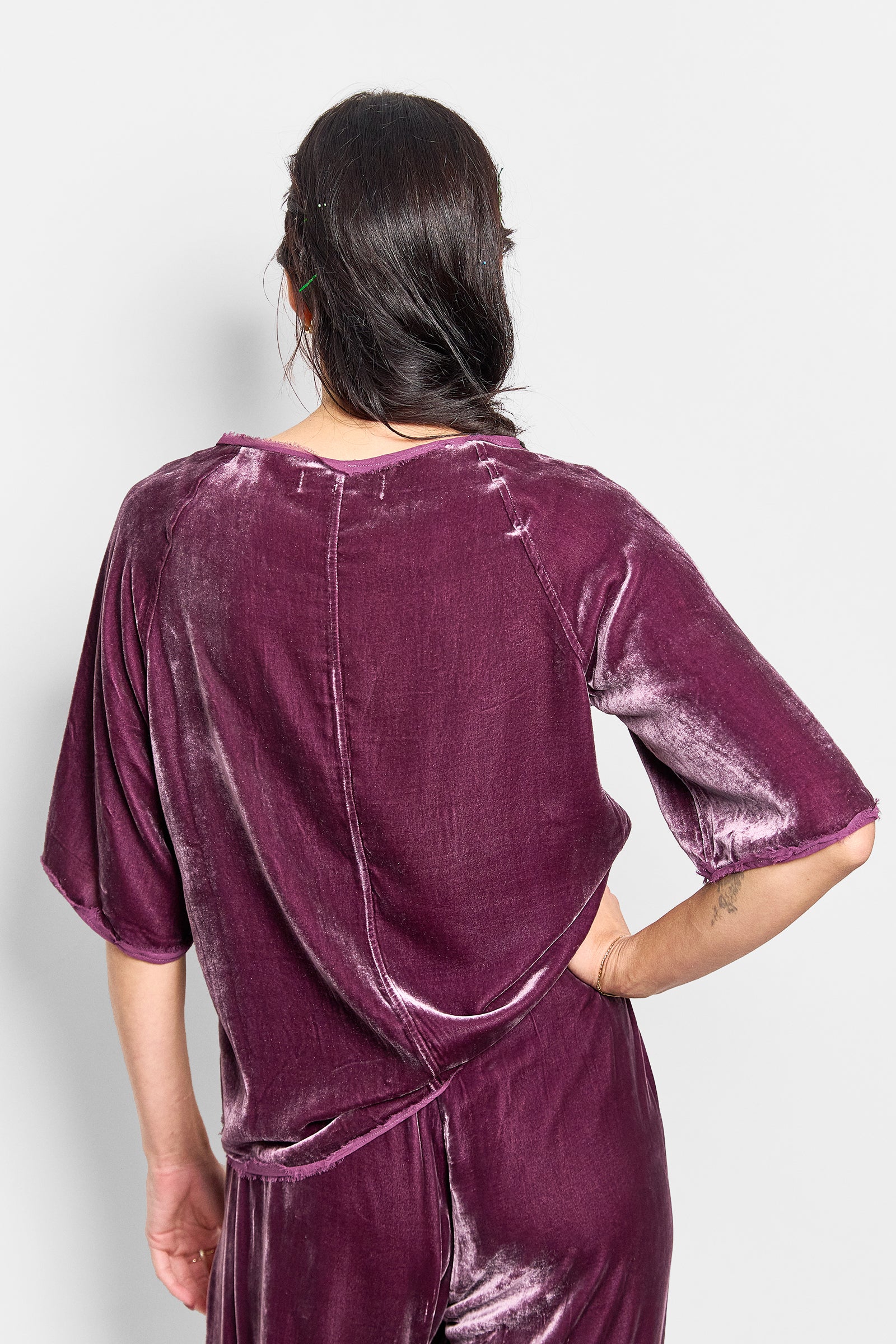 a raglan sleeve tee in a silk/viscose velvet finished with silk georgette binding. we pre-wash this tee to create a frayed finish on the binding and to give the velvet a beautiful soft finish. true to size.