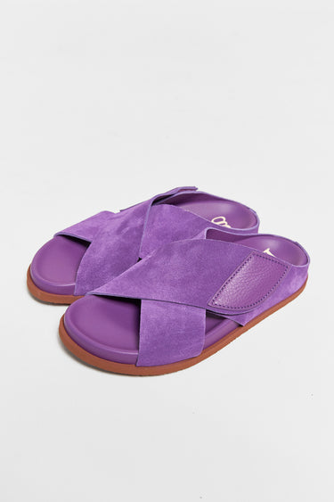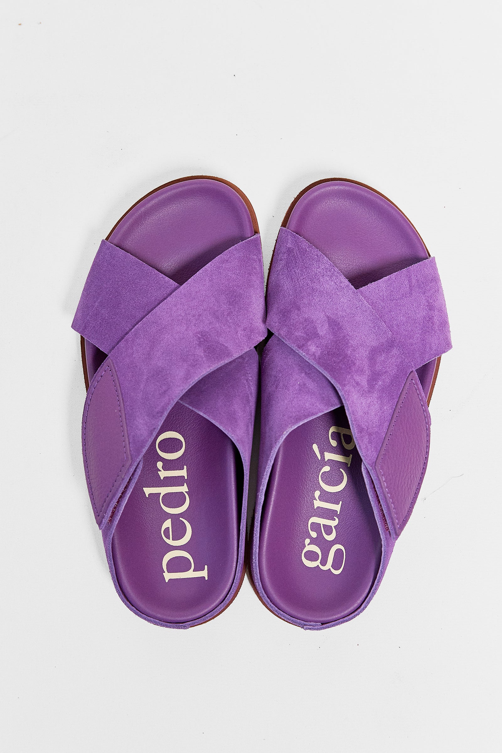 introducing the danai fussbett. part of the Pedro Garcia spring-summer 2026 collection. danai is a criss-cross sandal featured in a raw edge suede cowhide with an easy velcro closure and extra light sole. an ideal summer slide.