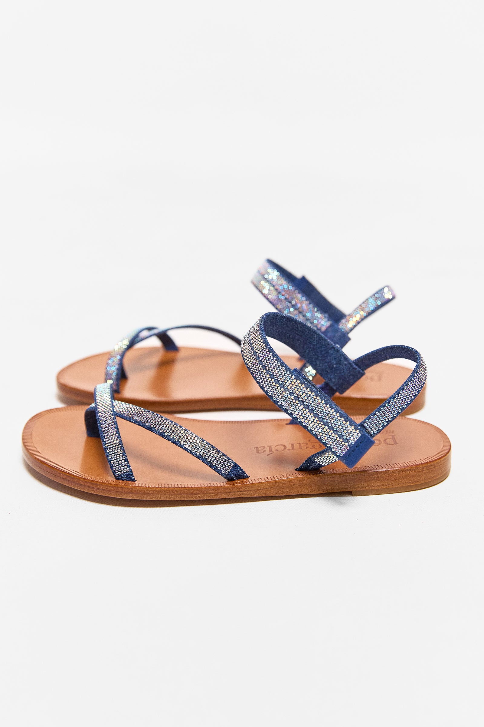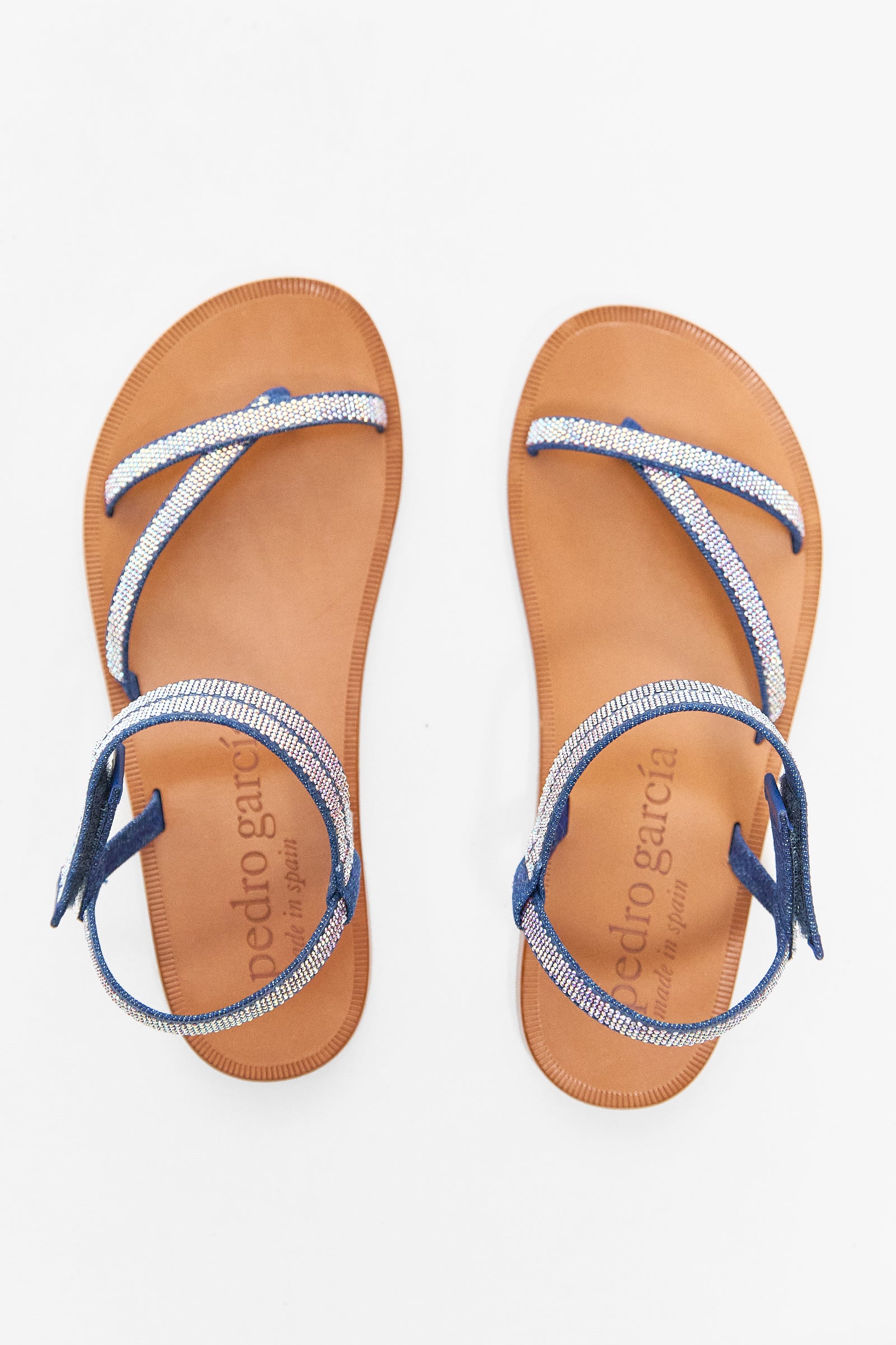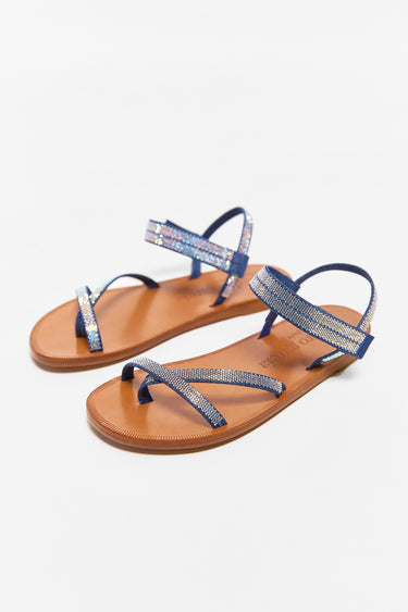 Pedro Garcia's ingrid sandals are a flat sandal which feature criss-cross denim straps with a velcro closure. the denim is embellished with swarovski crystals.