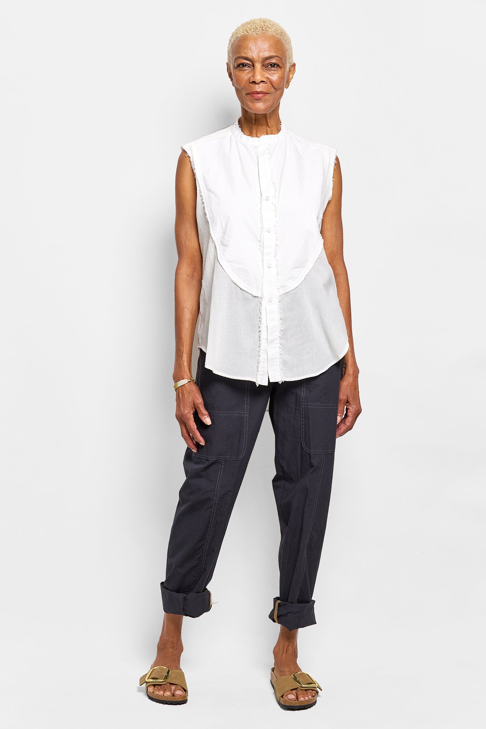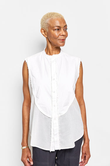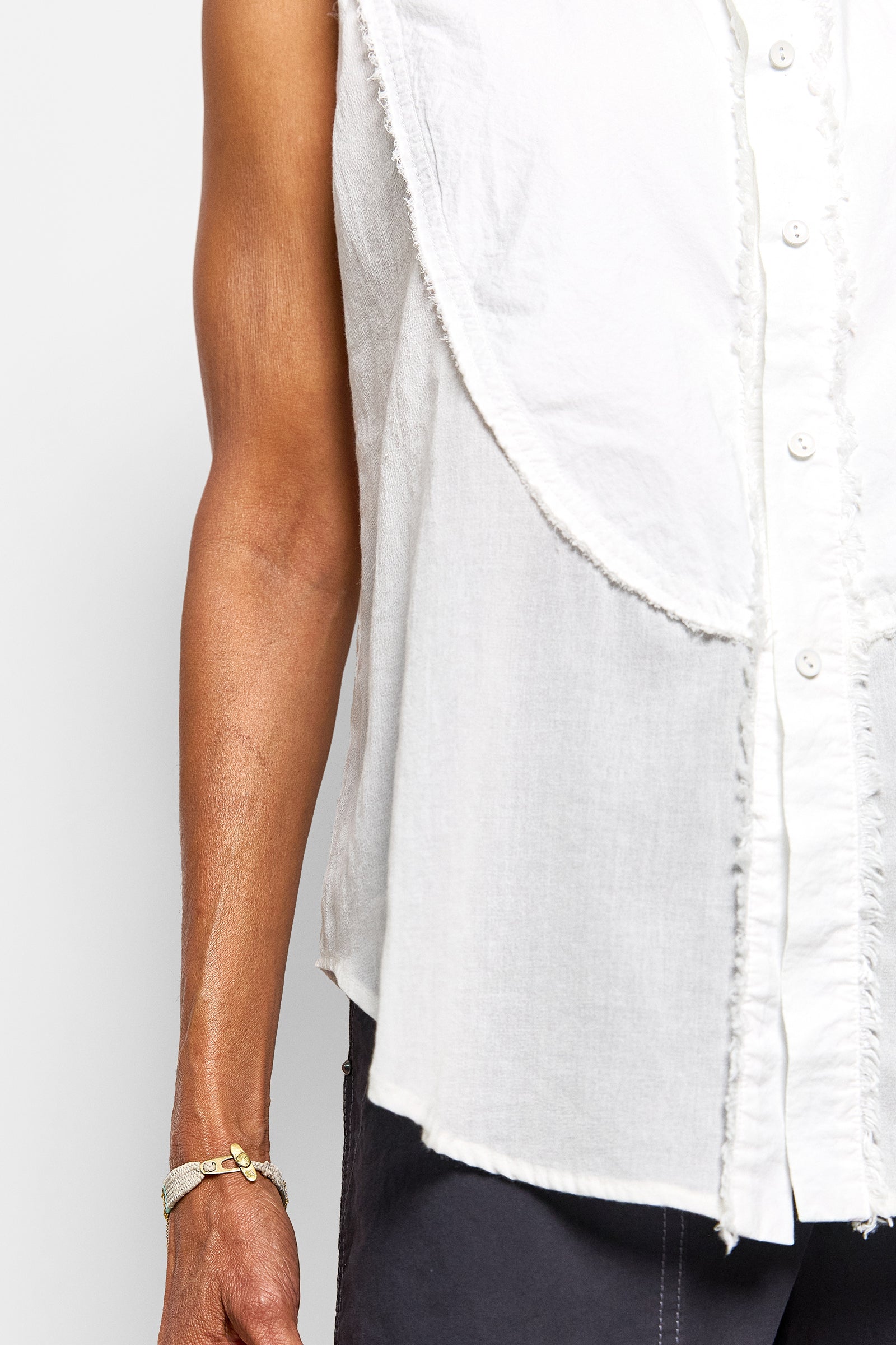 our reinterpretation of the classic tuxedo shirt. raw armhole edges are exposed as if the sleeves were ripped out. finished with selvedge trim and reinforced thick-thread topstitching. the body is cut from a lightweight, chalky-soft cotton gauze, contrasted by a crisp paper-touch cotton front panel for structure. true to size.