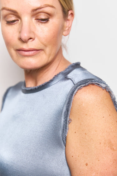 a simple sheath of satin that is trimmed with a self binding that forms a beautiful fluffy fray in our industrial wash process. an extra silver metallic inset is placed on the shoulder. the best thing about this dress is that you can wash it in the washing machine. relaxed fit.
