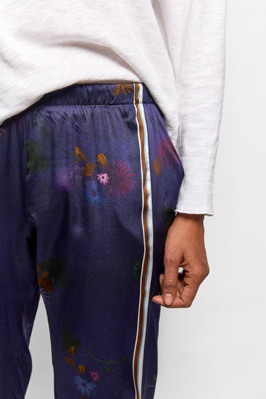 a beautiful, navy/black romantic floral print designed by Millie (artist extraordinaire and byfreer friend). this slim stretch silk pant features an engineered stripe printed on the left leg. the fit is a mid-rise with a soft elastic waist. true to size.